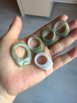 100% natural type A light green/gray/white one-piece carved dragon jadeite jade ring group F154