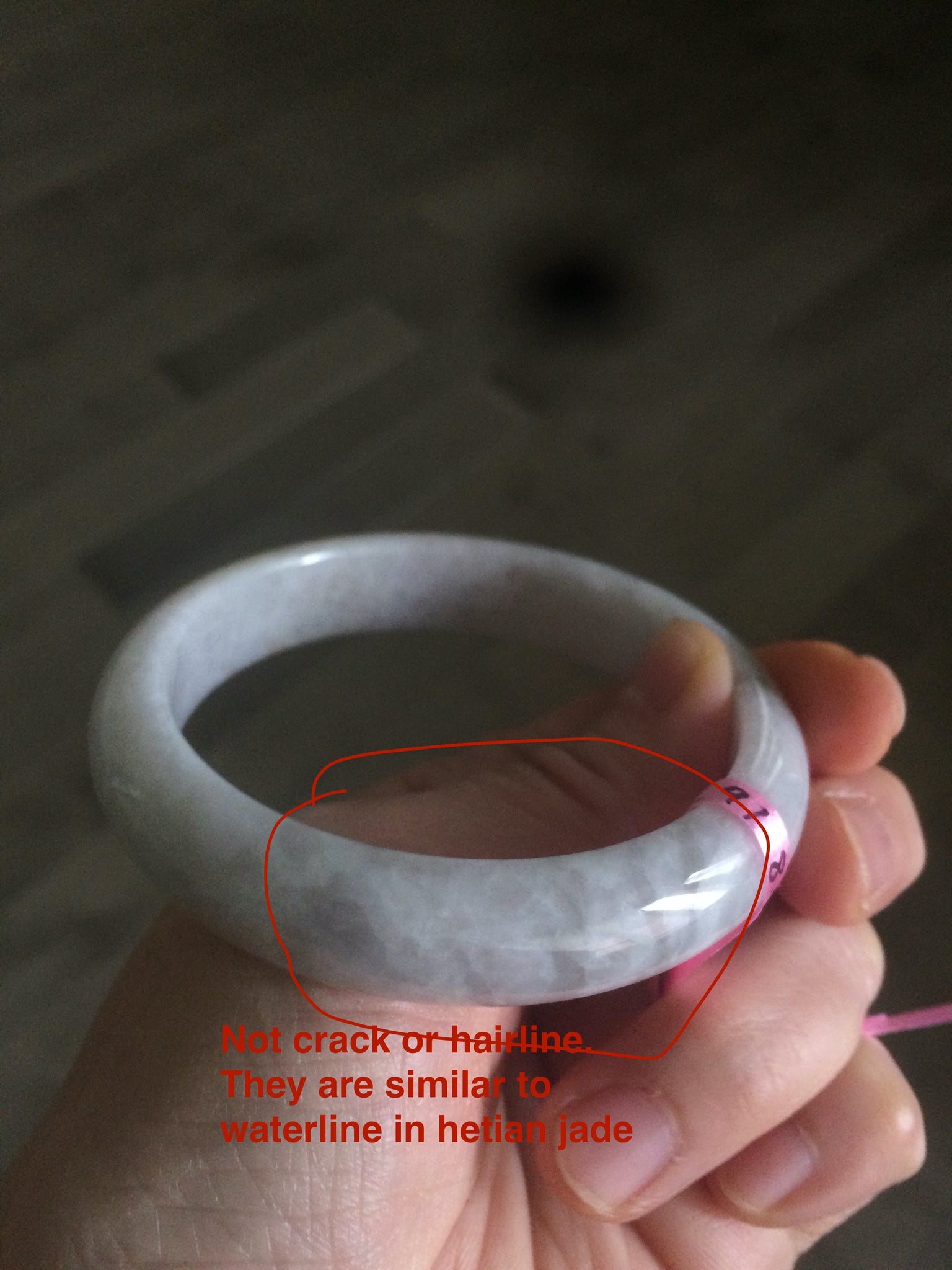 One surface crack. No hairline. Some cotton lines. It called "白根纹" in Chinese. They won't influence the firmness. The texture is not so fine, you can see the jadeite structures.