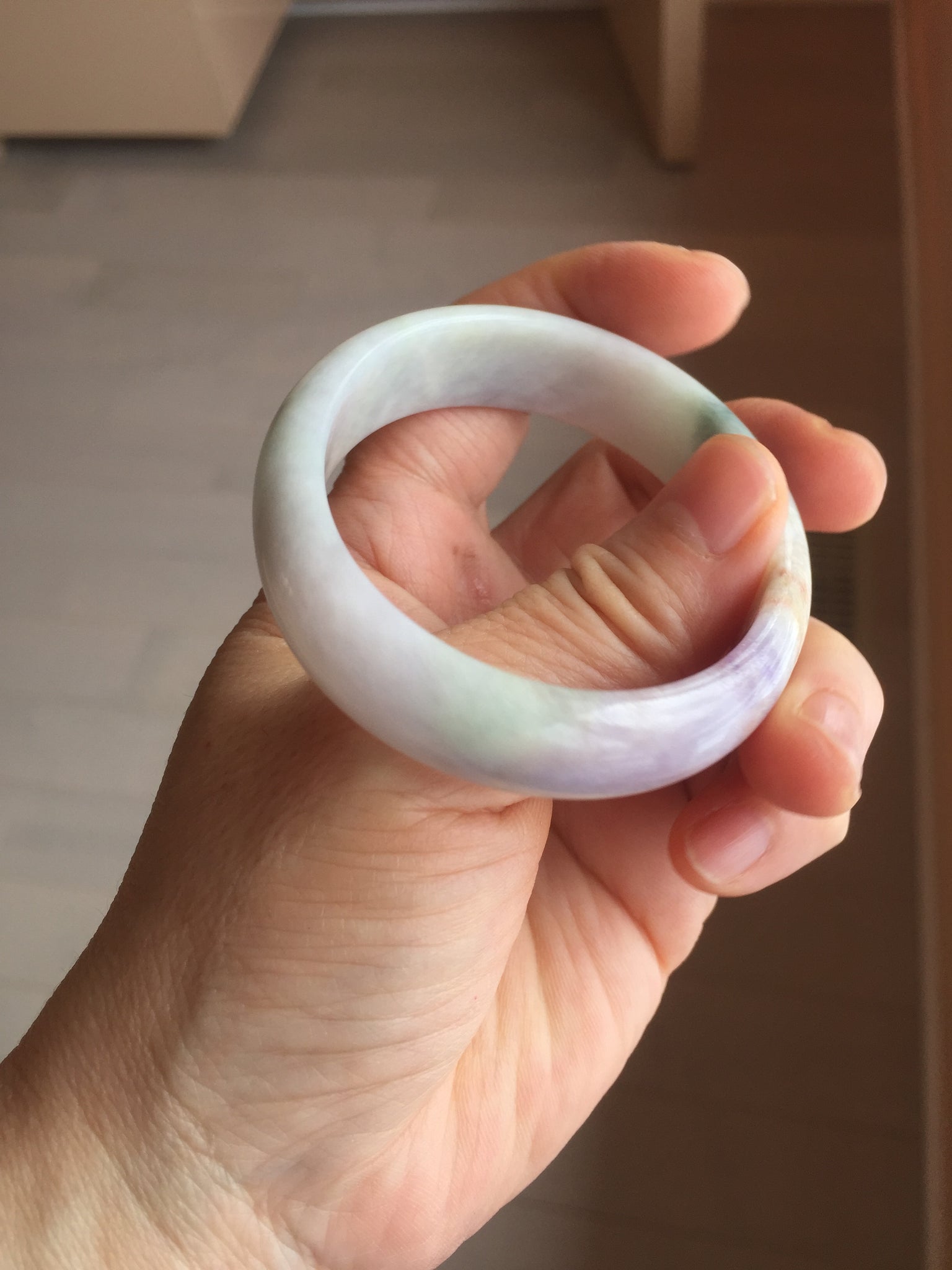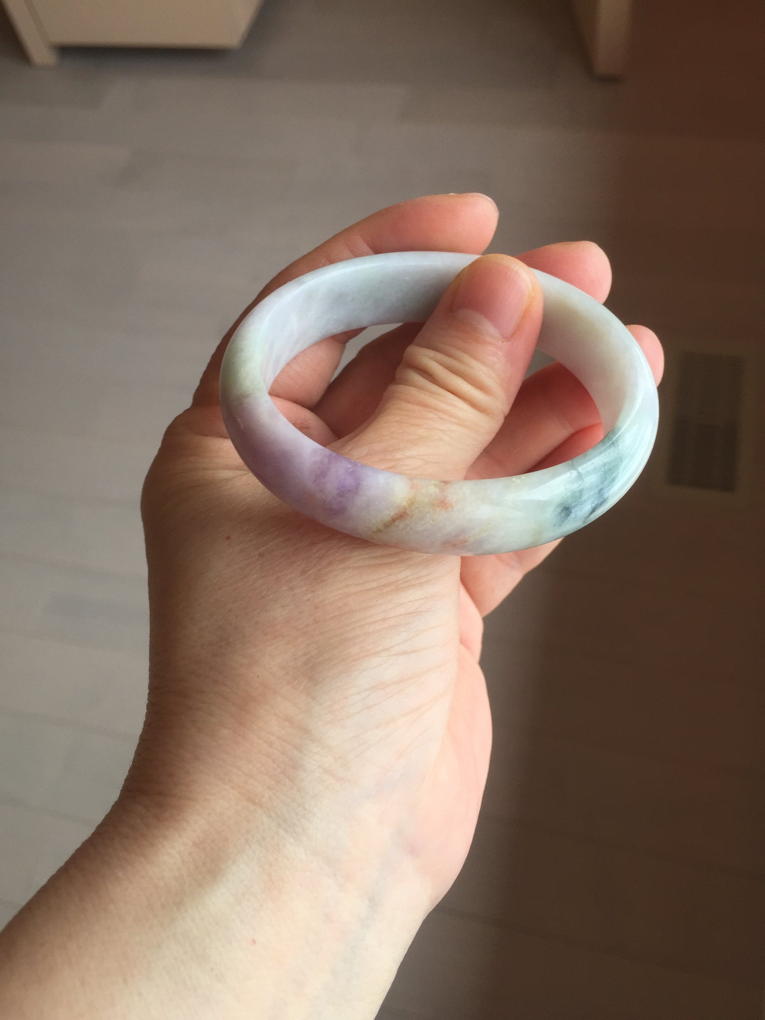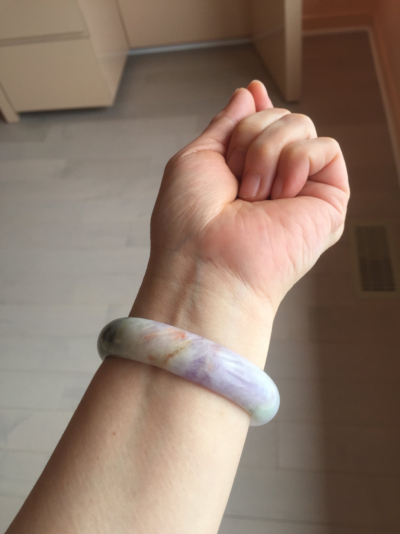 Imperfections: A relatively big rough surface with cotton areas, surface cracks, fissures, and WAX. The bangle is solid(Guaranteed). Some yellow color roots, hairlines, cotton lines, cotton areas, and cotton spots. The texture is not delicate(coarse and dry). One part of the bangle is narrower than the rest part. Not transparent or watery. The purple is lighter than in the photos.
