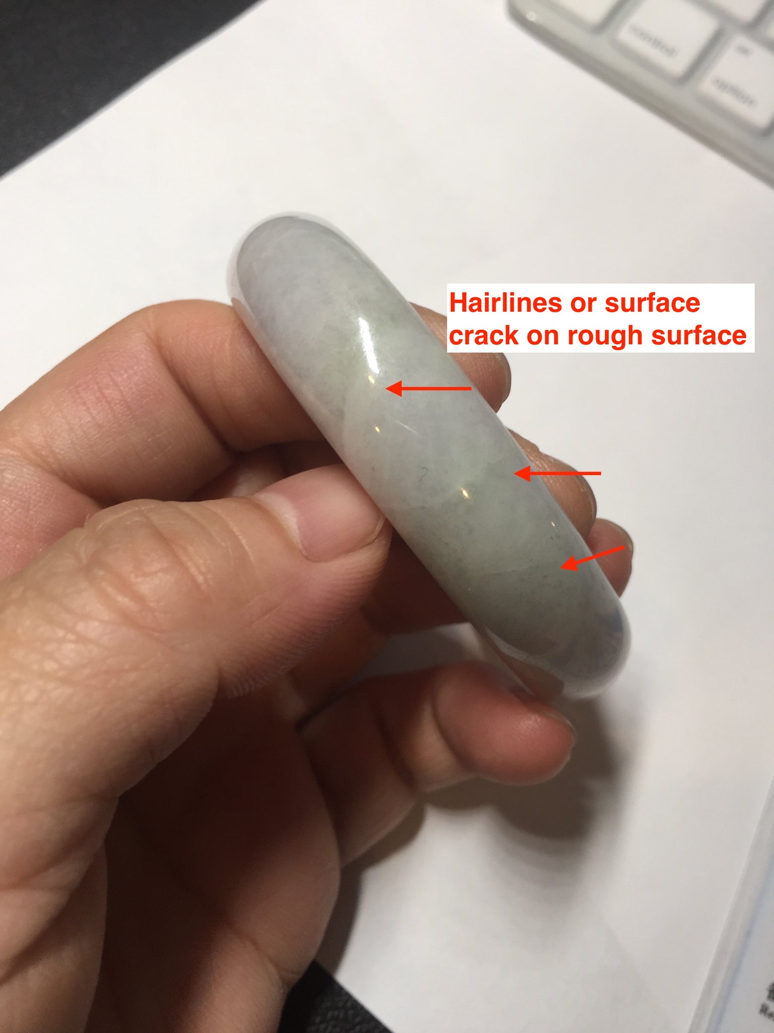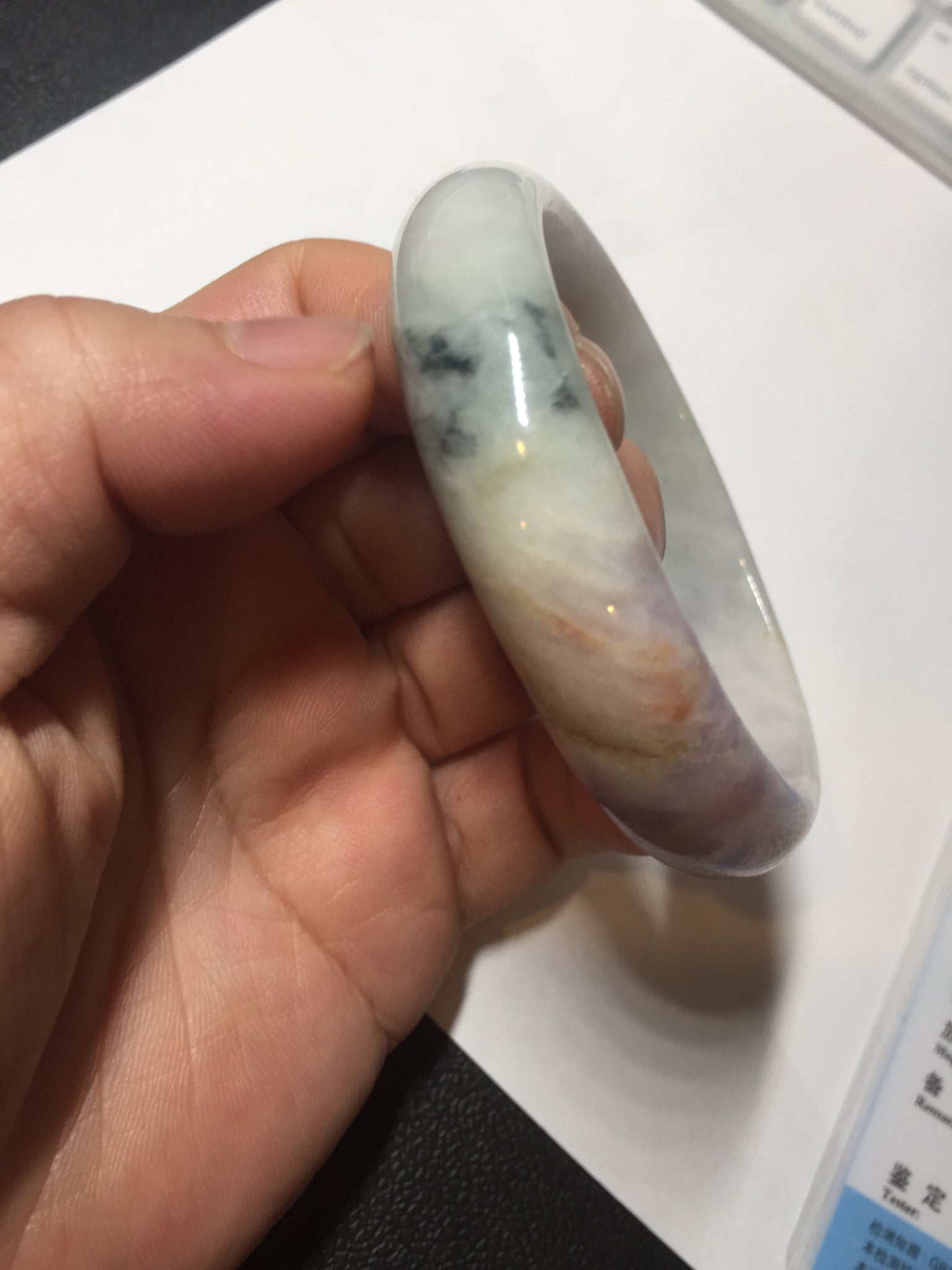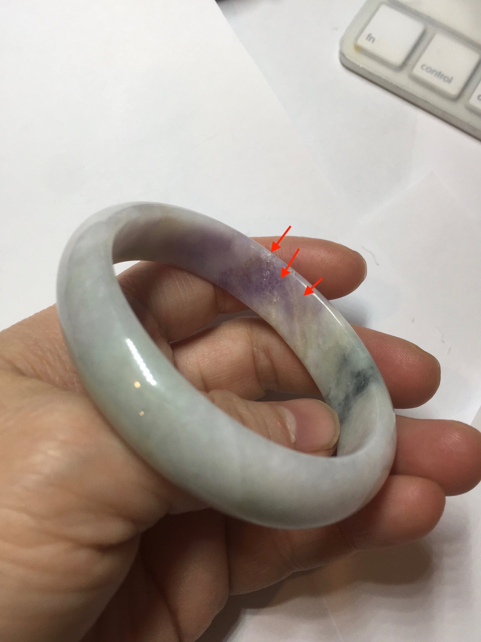 Imperfections: A relatively big rough surface with cotton areas, surface cracks, fissures, and WAX. The bangle is solid(Guaranteed). Some yellow color roots, hairlines, cotton lines, cotton areas, and cotton spots. The texture is not delicate(coarse and dry). One part of the bangle is narrower than the rest part. Not transparent or watery. The purple is lighter than in the photos.