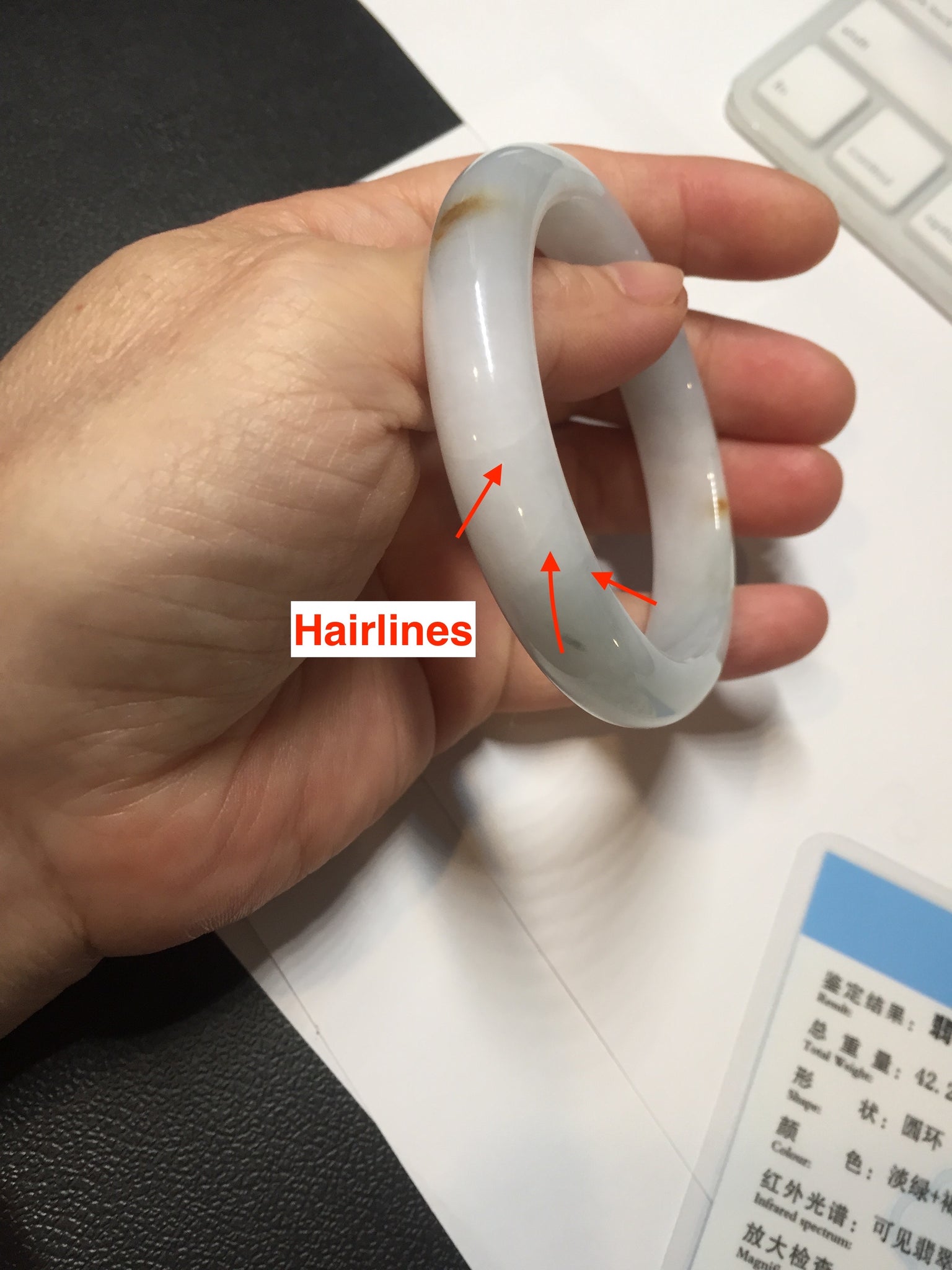 No crack. Some hairlines. Some cotton lines, areas, and spots. One or two tiny rough surface areas.