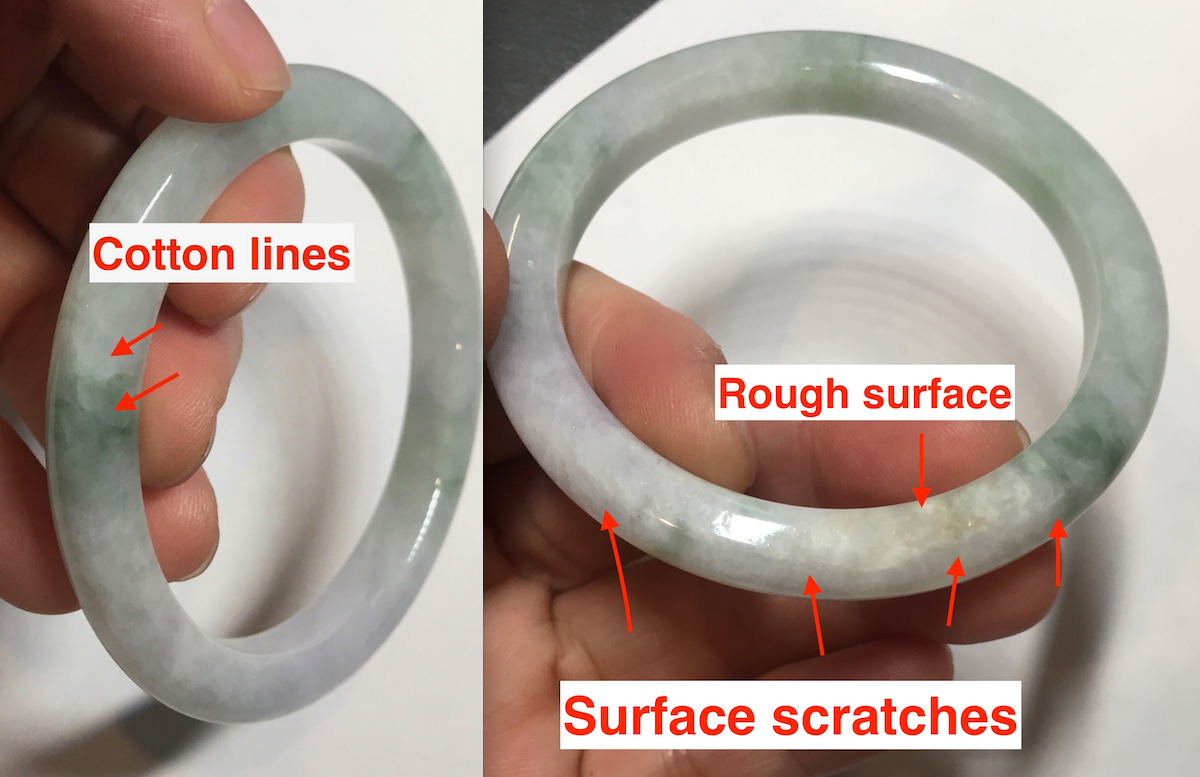 Some surface scratches on a rough surface. Some cotton lines and spots. The purple is lighter than in the photos.