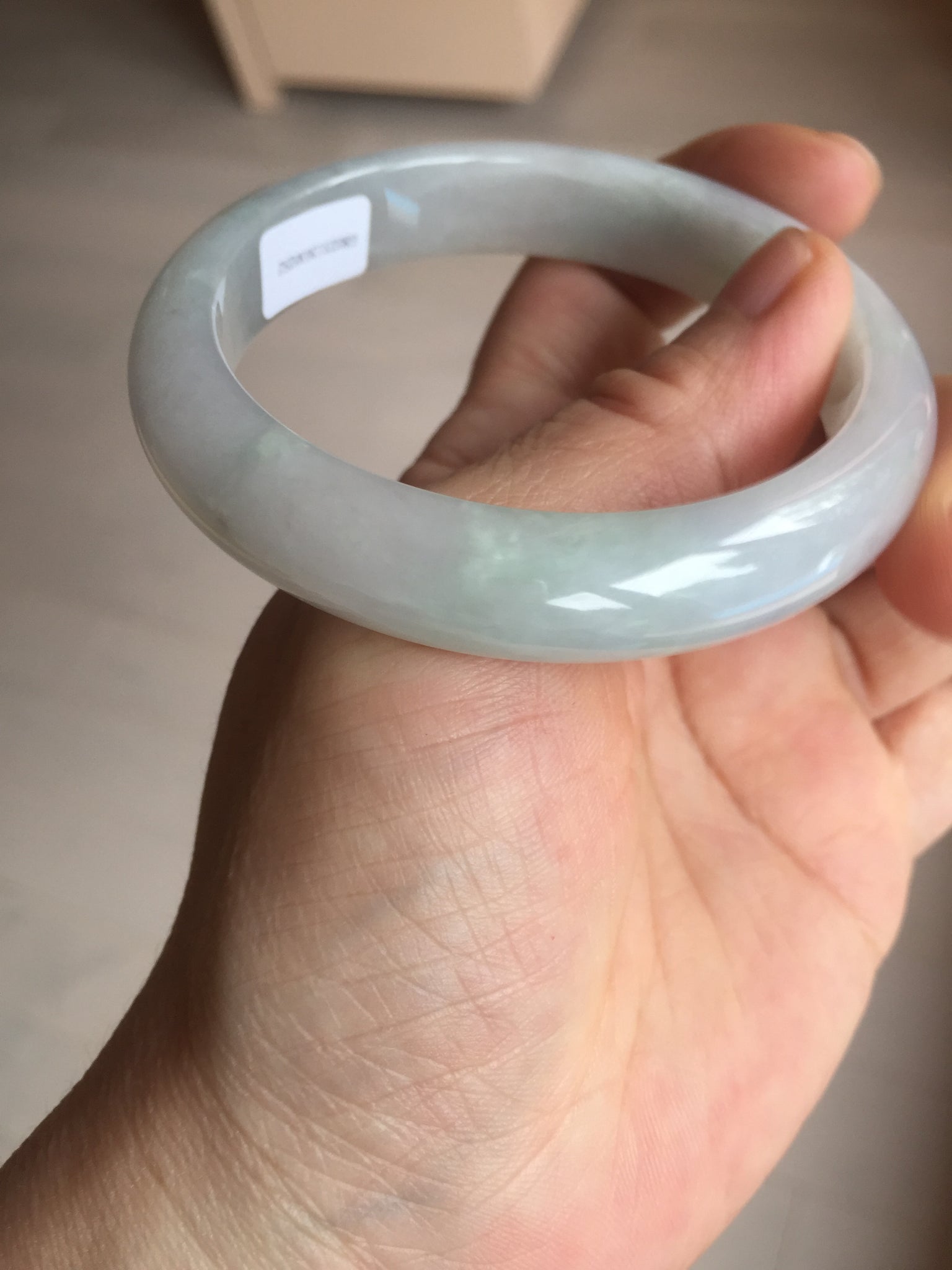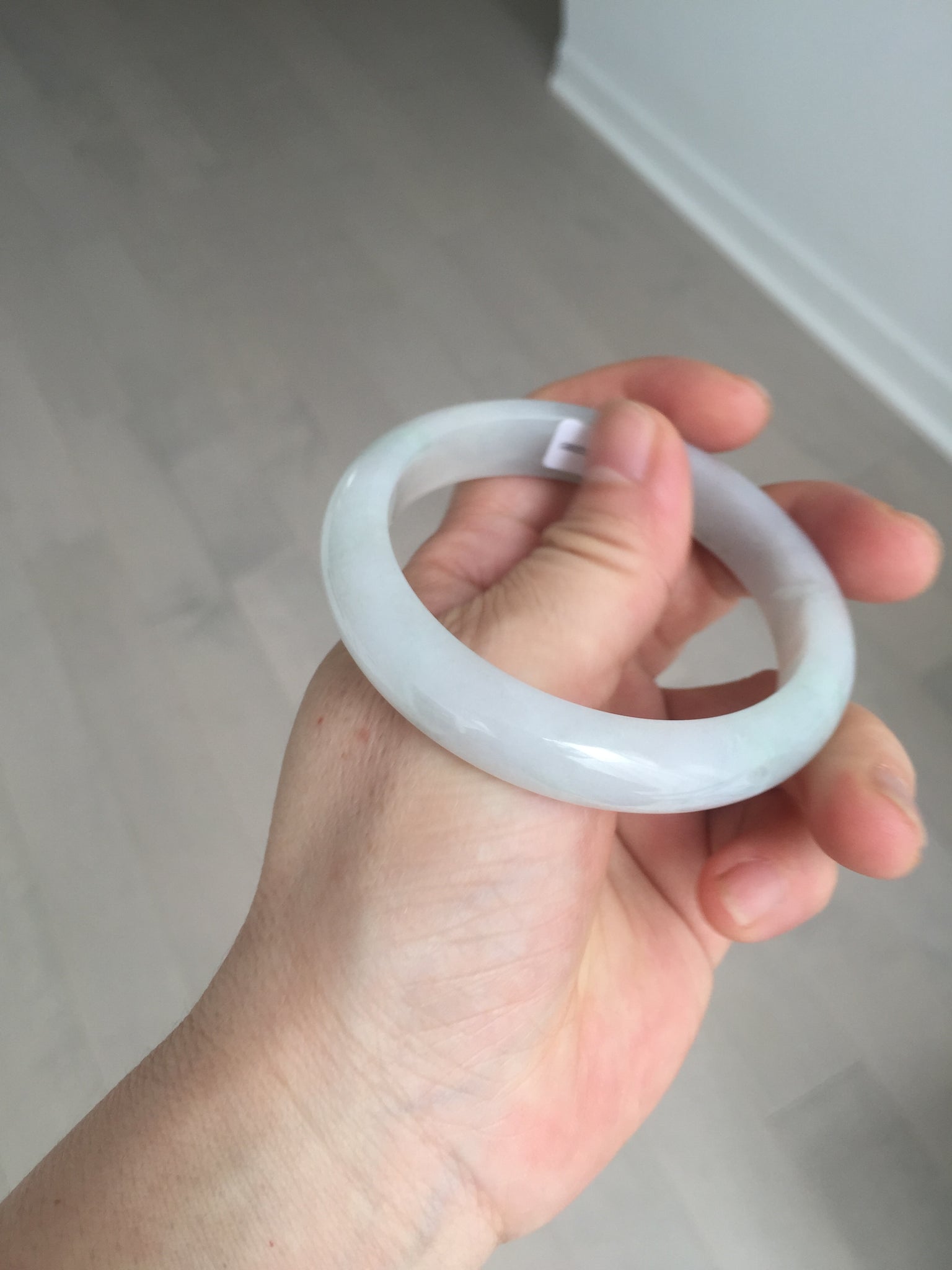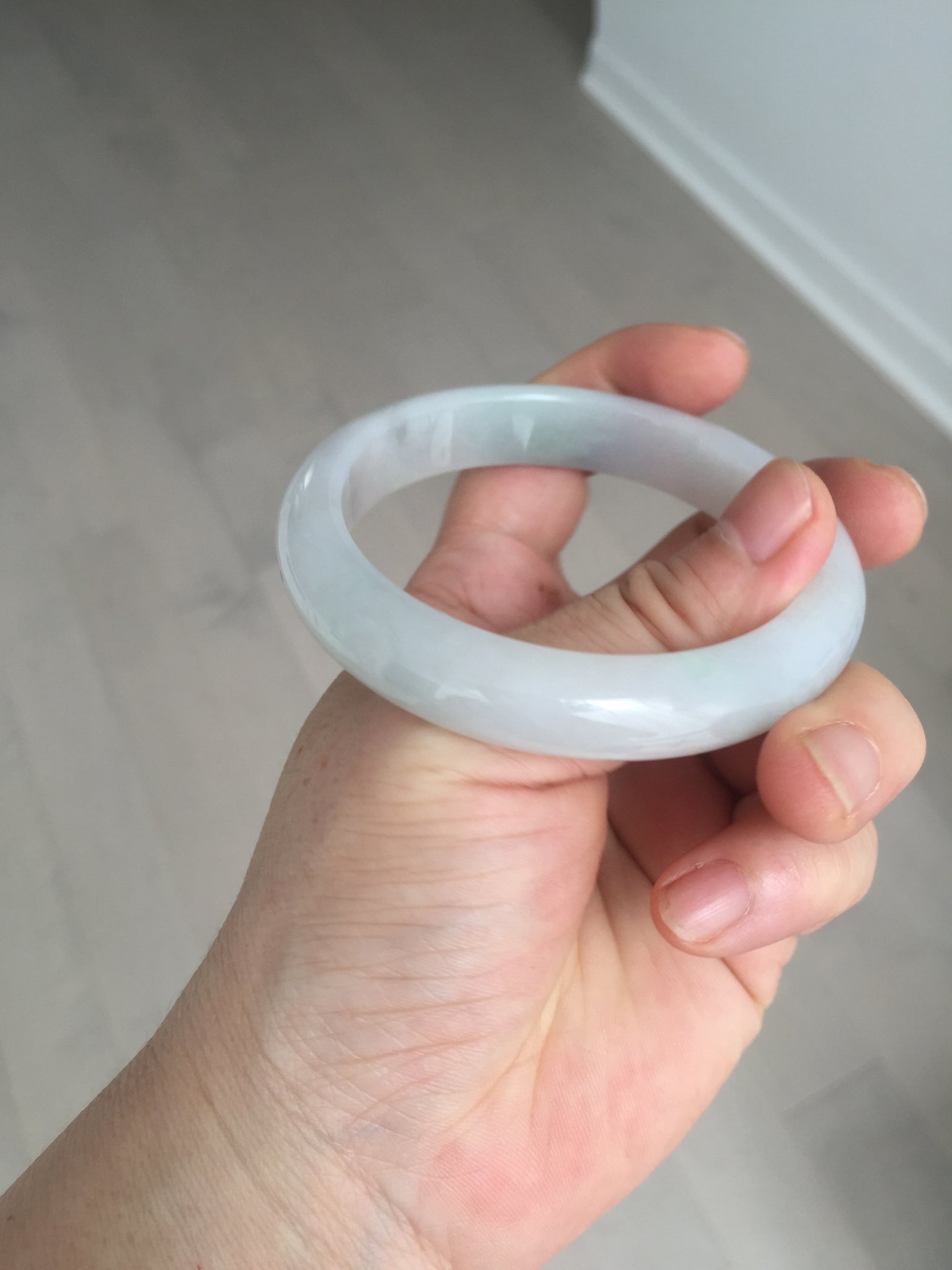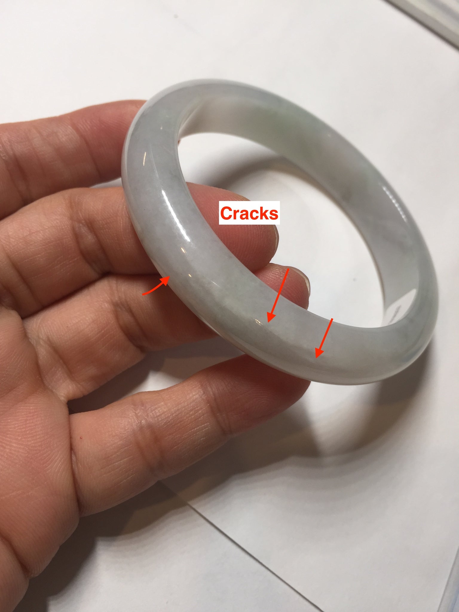 Some cracks. The bangle is sturdy (Guaranteed, refund if it breaks). Some cotton lines, areas, and cotton spots. The purple is lighter than in the photos due to the purple color always being more camera-friendly.