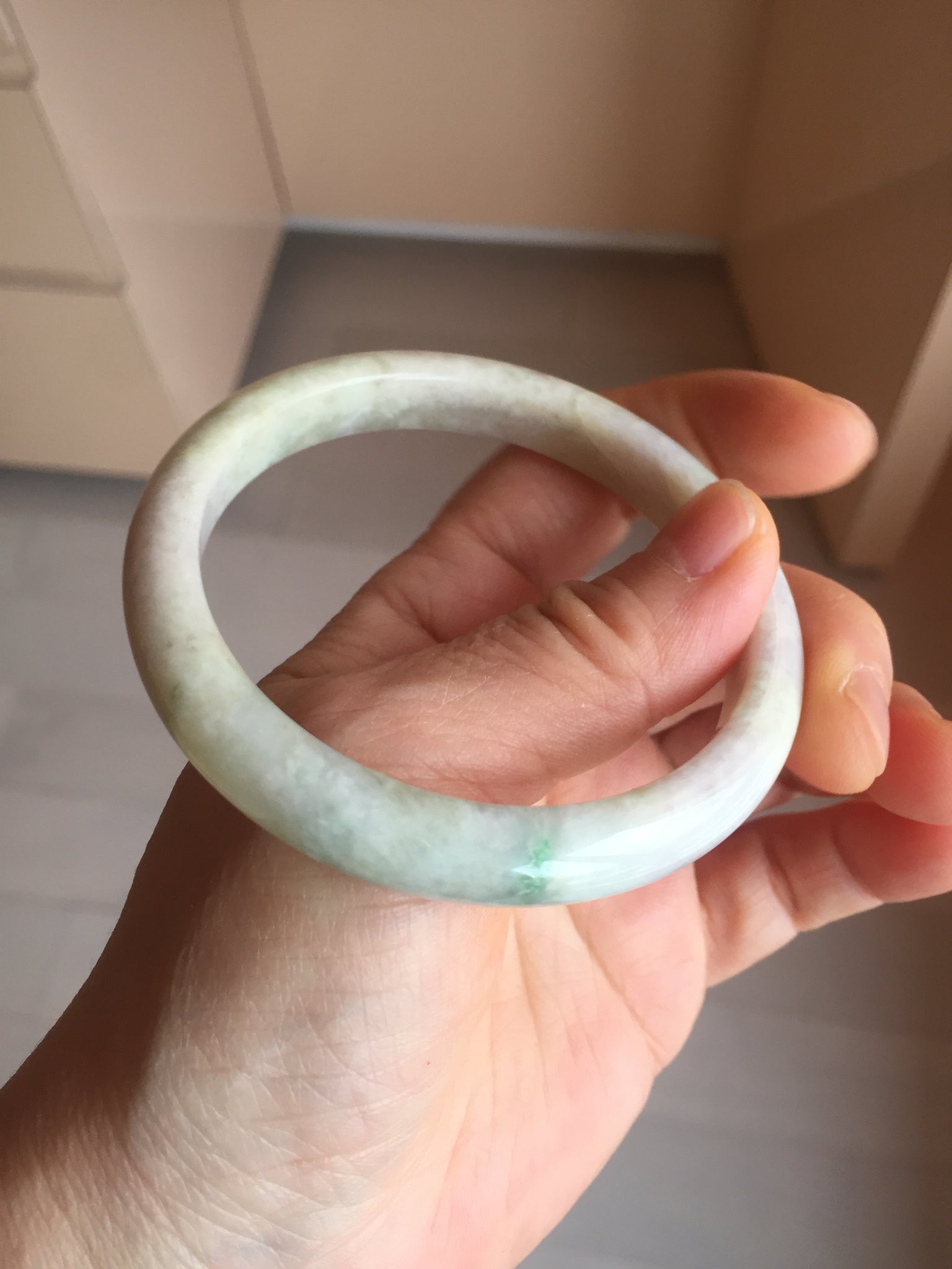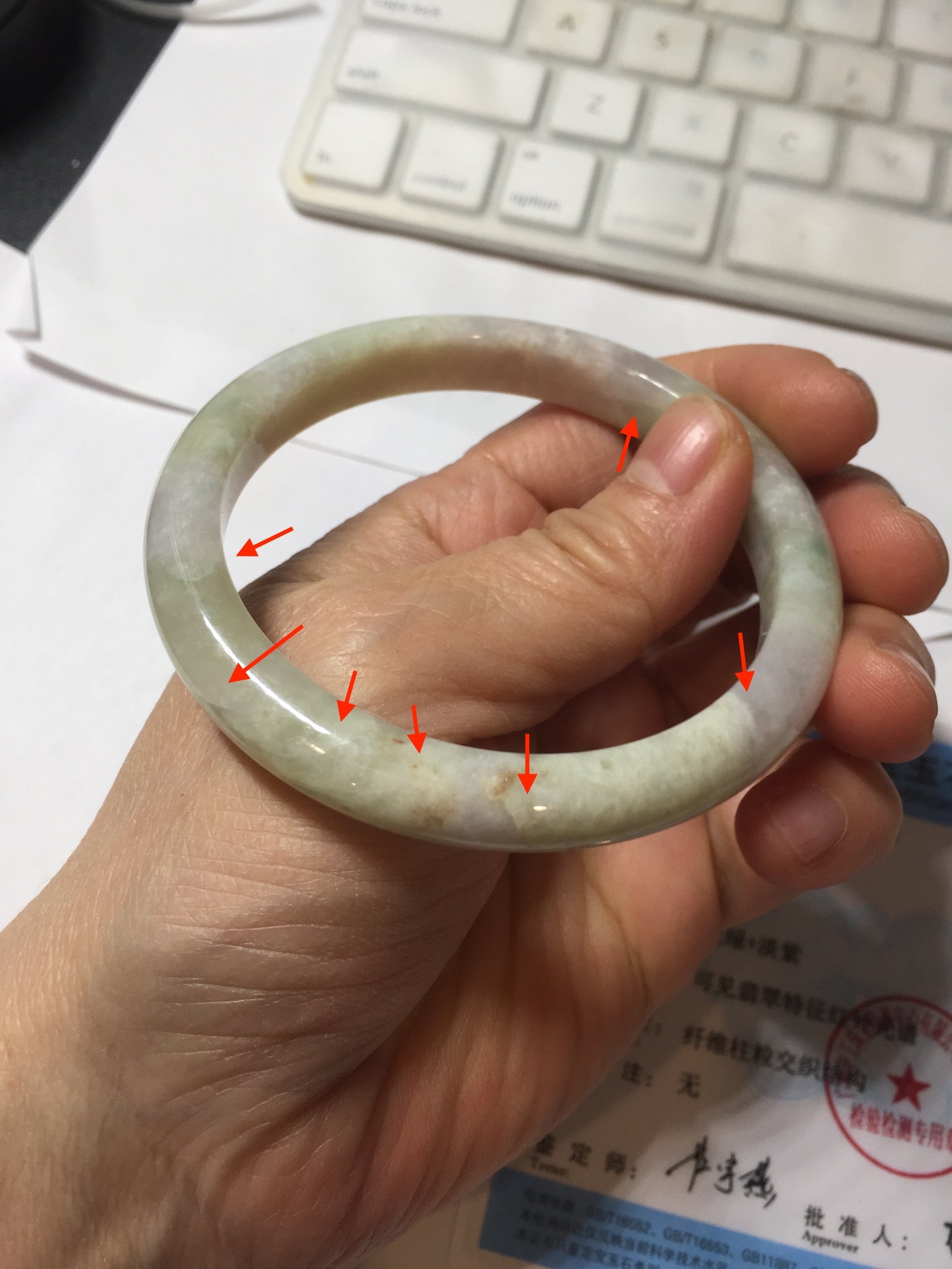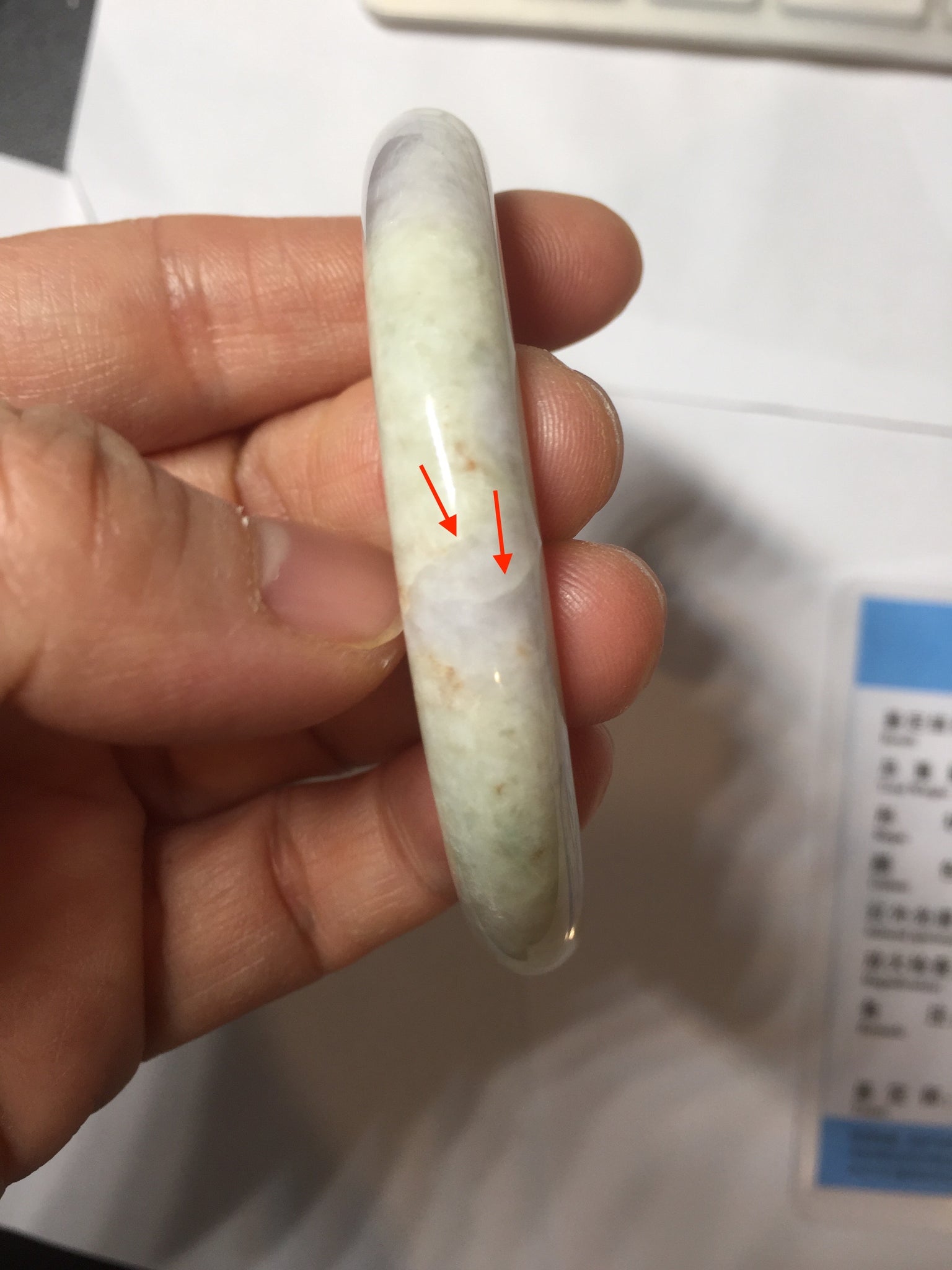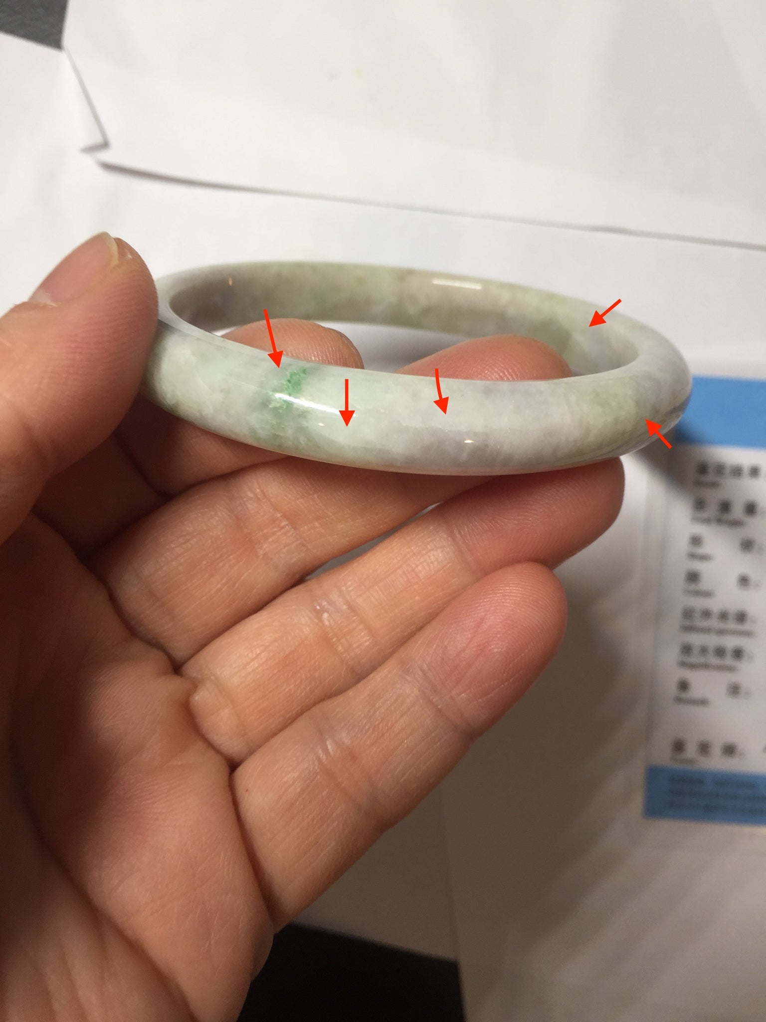 Some cracks. The bangle is solid (guaranteed!). The texture is not delicate. Some blisters, structure lines, cotton lines, cotton areas, and cotton spots. Some rough surfaces.The purple is super light, just a hint of it.