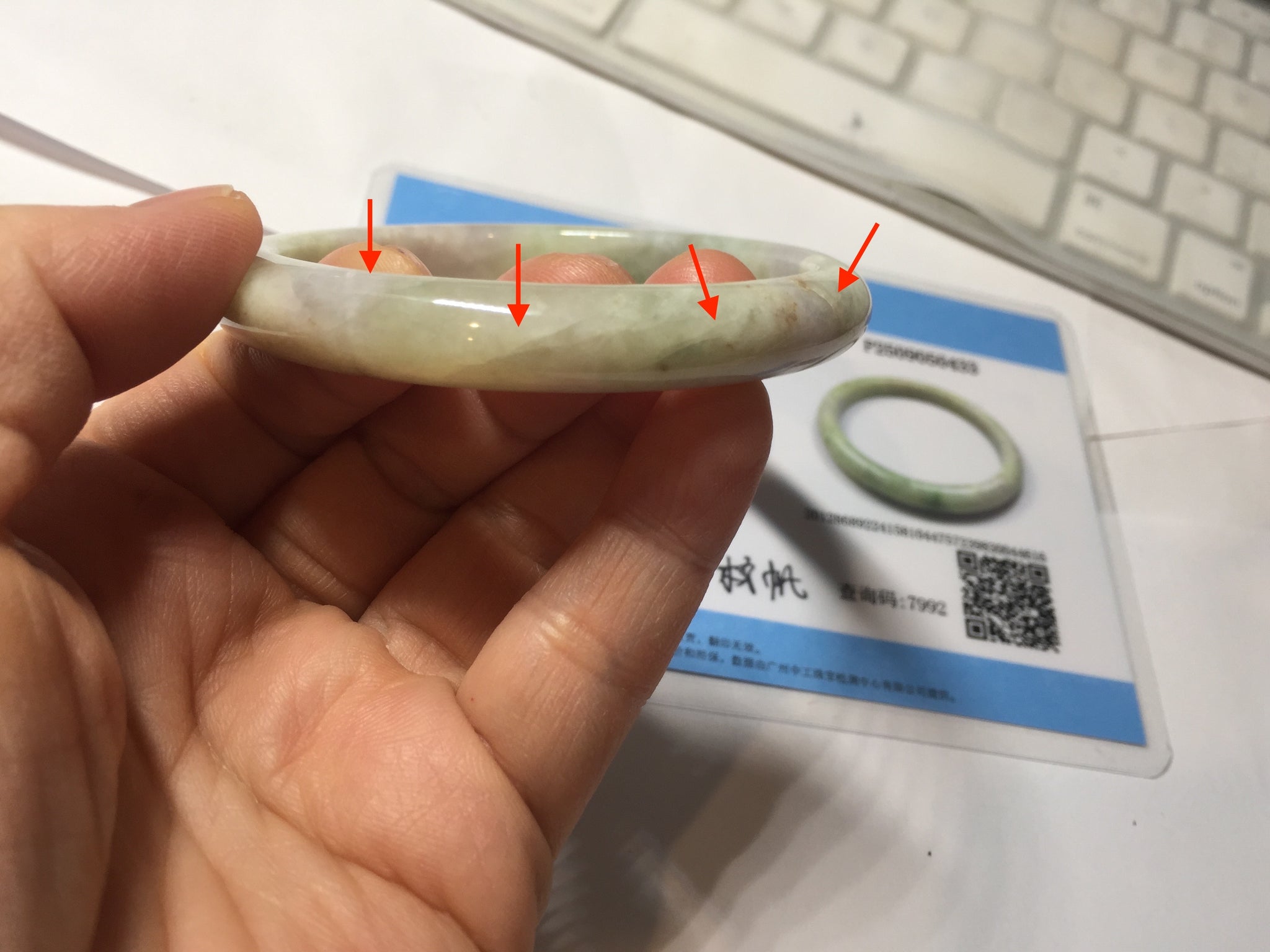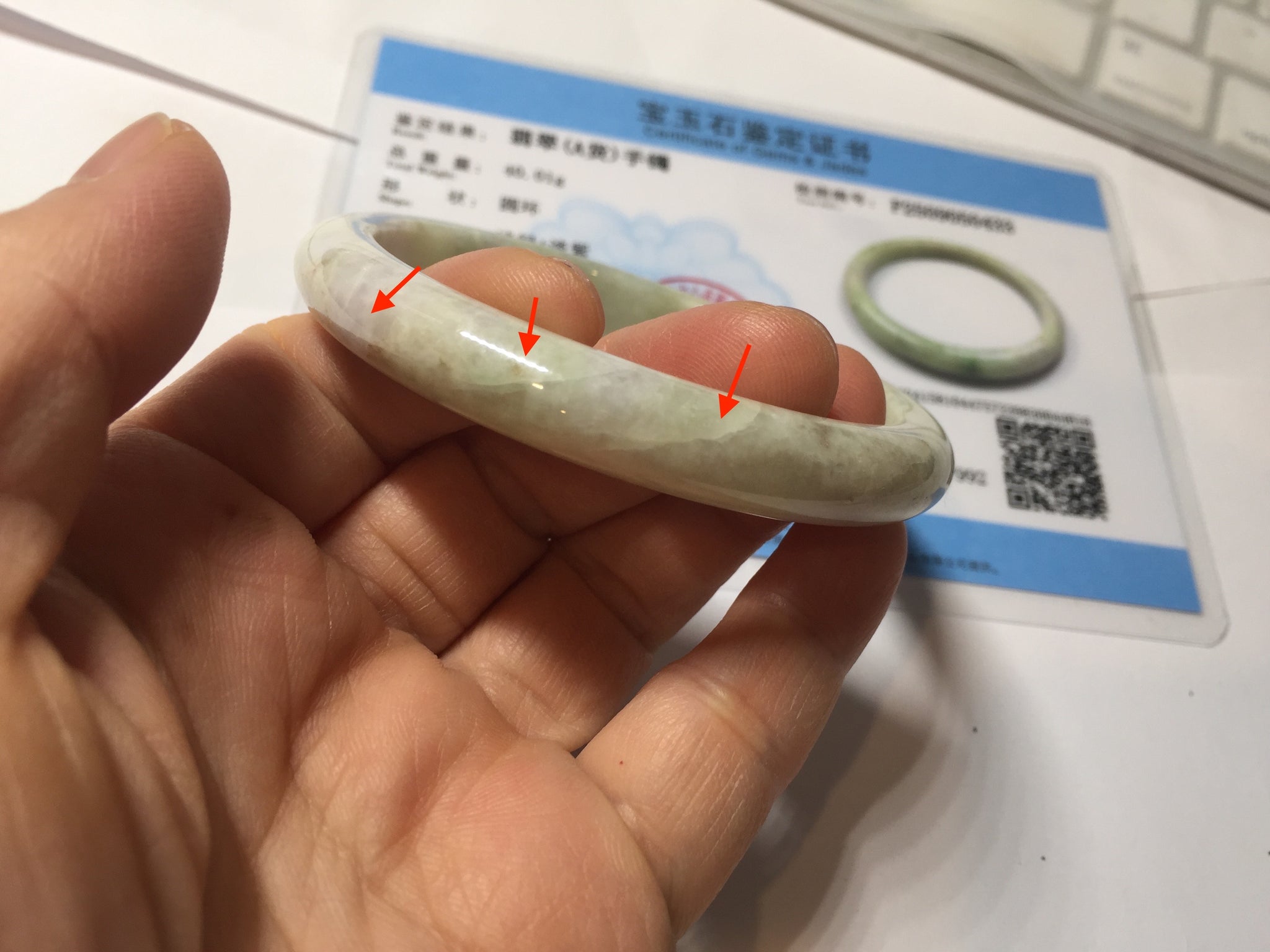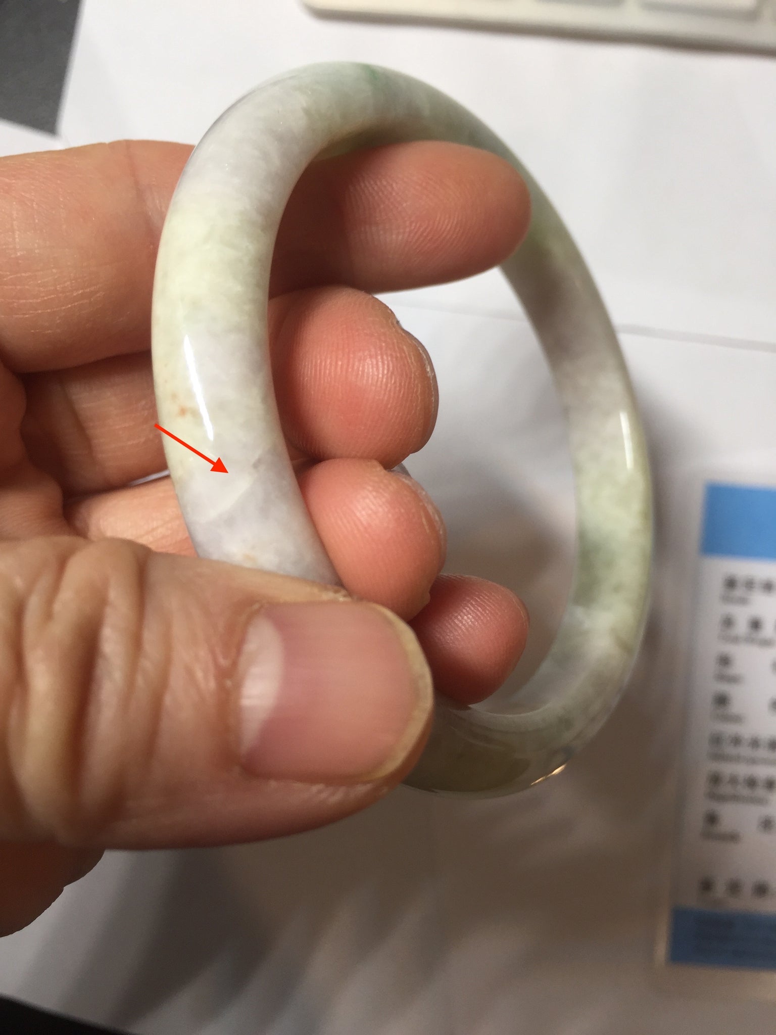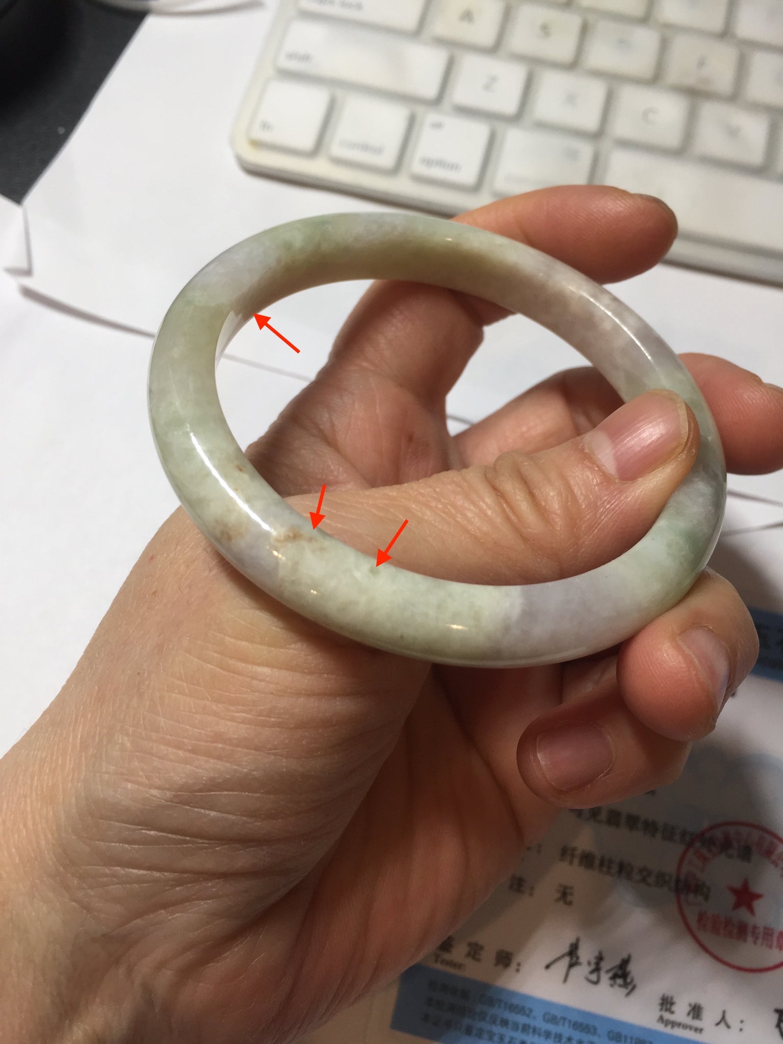 Some cracks. The bangle is solid (guaranteed!). The texture is not delicate. Some blisters, structure lines, cotton lines, cotton areas, and cotton spots. Some rough surfaces.The purple is super light, just a hint of it.