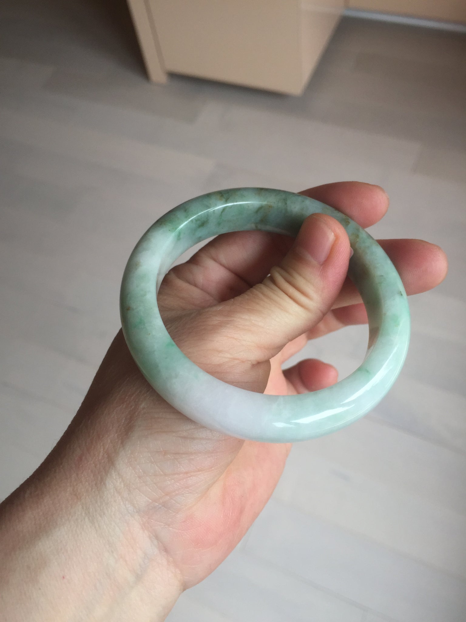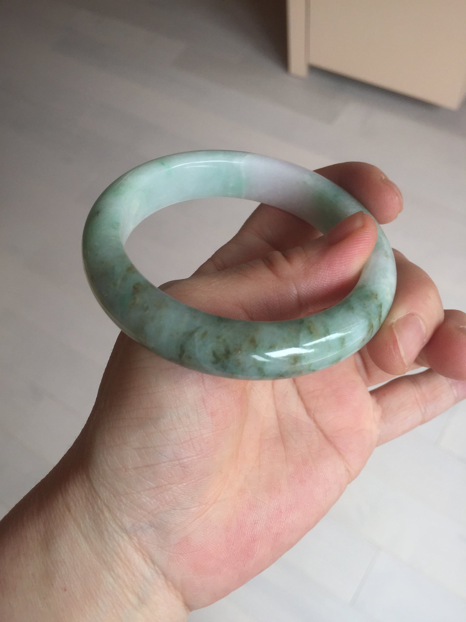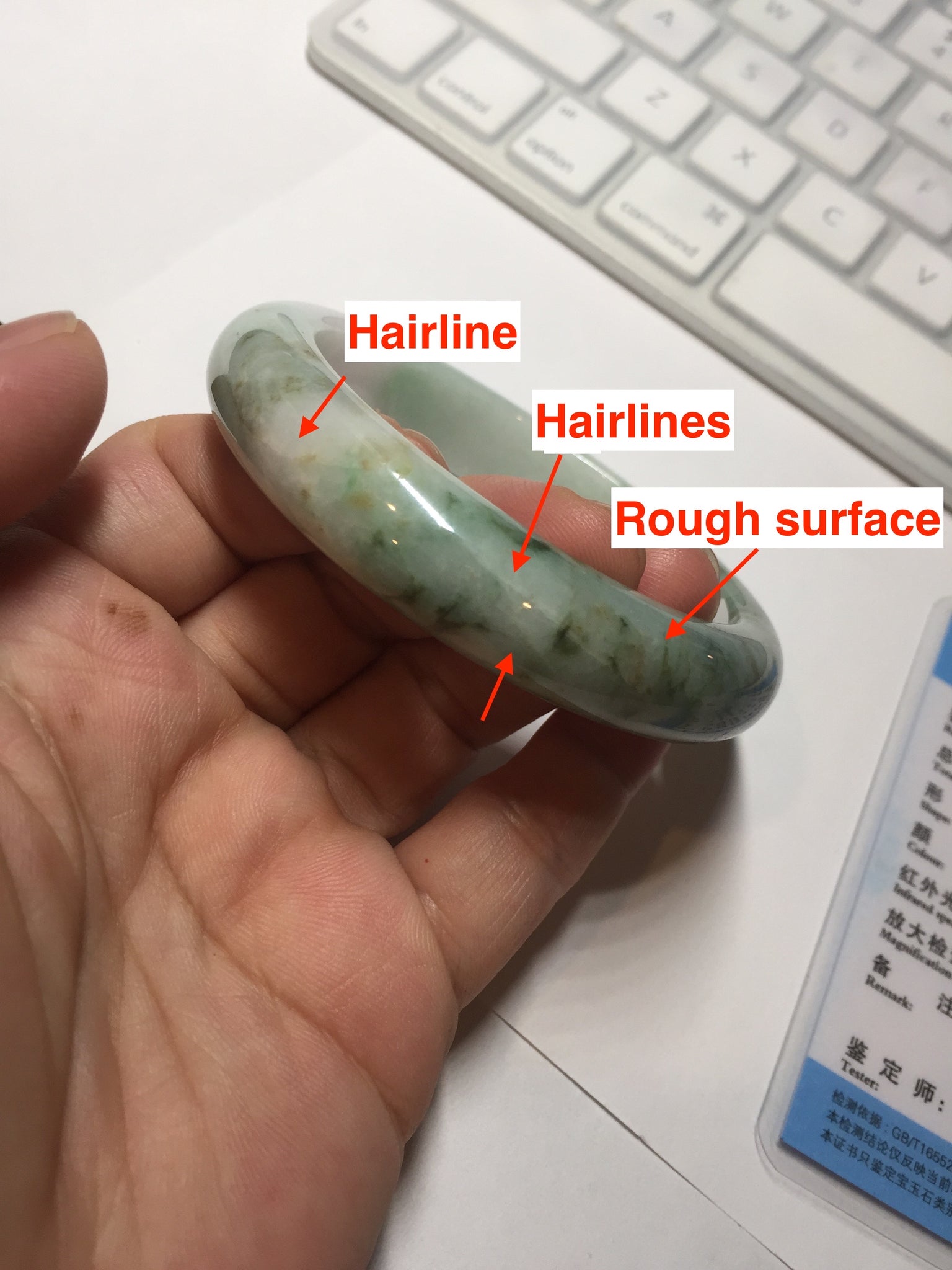 No crack. Some hairlines and one of them is an around-the-bangle hairline. All hairlines won't influence the firmness. Some brown/ black rough surfaces and spots,  cotton lines, and cotton areas. The purple is lighter than in the photos.