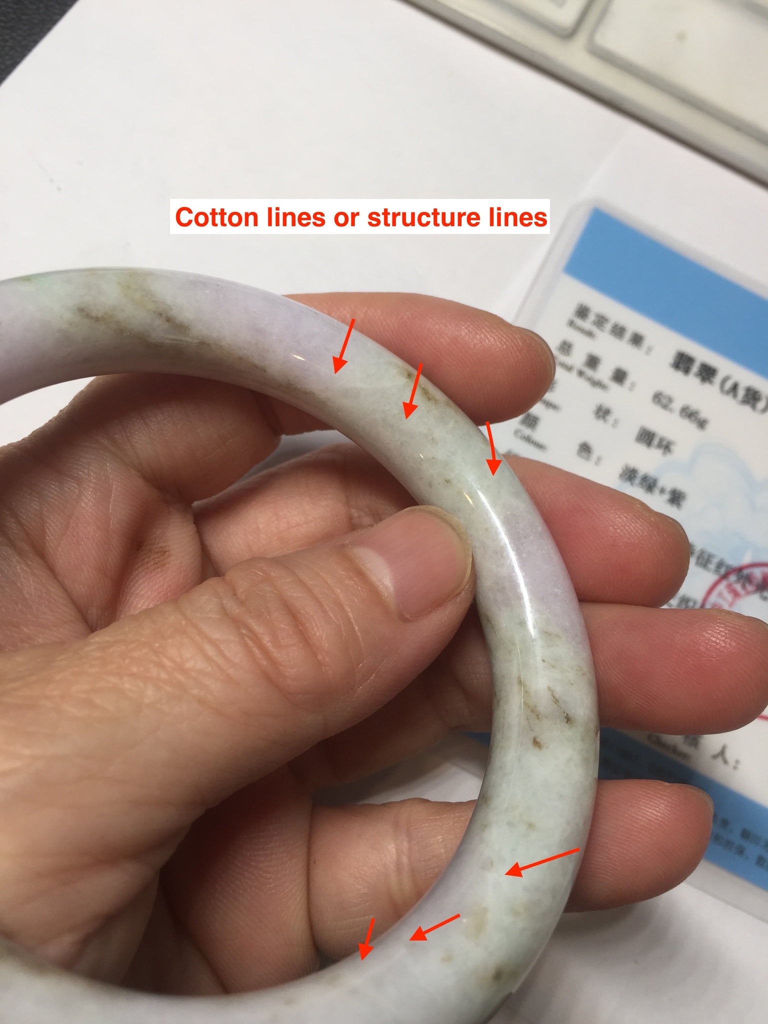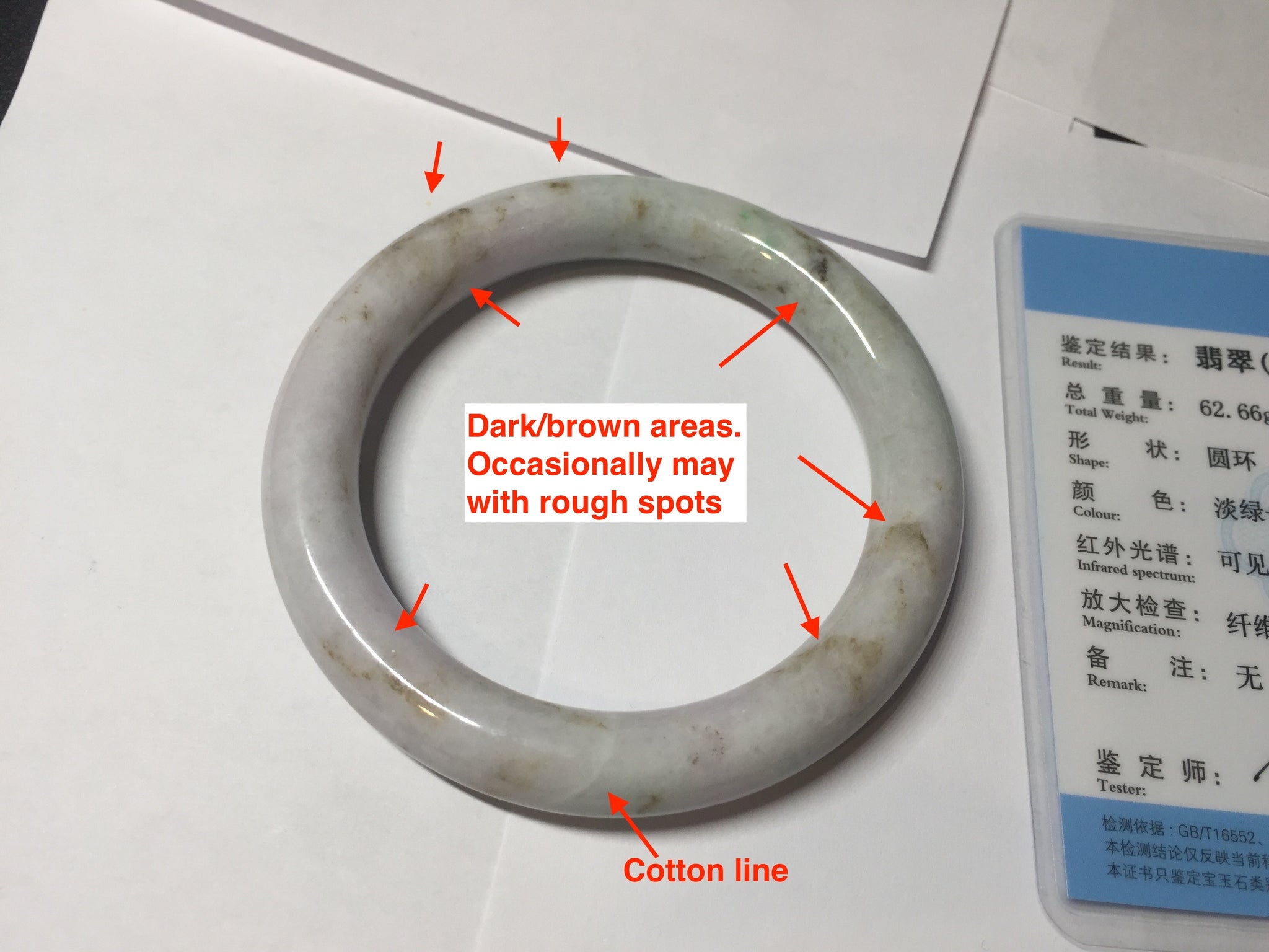 Some dark/brown areas. Occasionally may with rough spots. Some cotton area, cotton lines, structure lines, and cotton spots. Not transparent. Not watery.