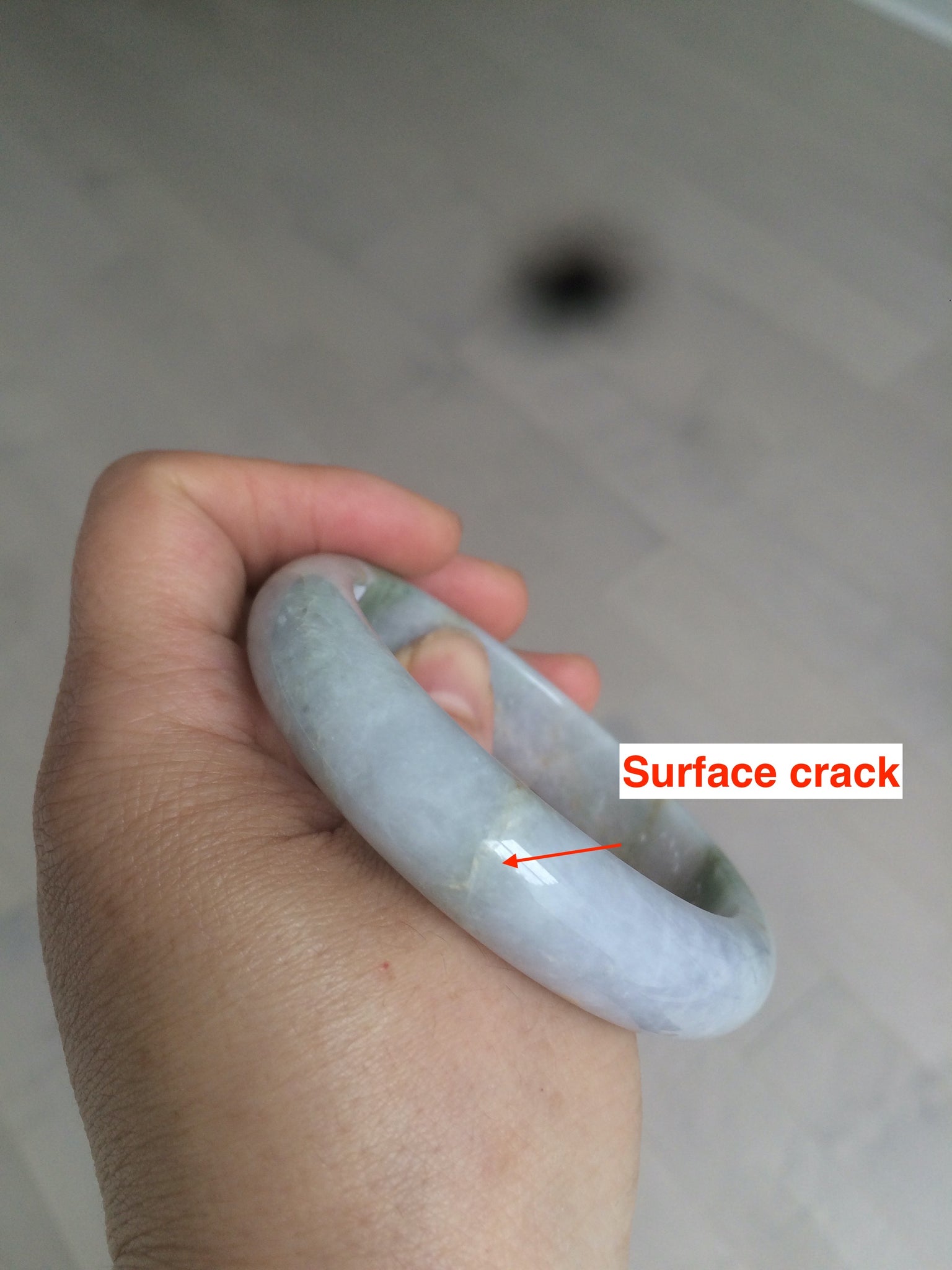 Some sufrace cracks.  Won't influence the firmness. some cotton lines and cotton spots. The  texture is not so fine. No transparent. Not watery. Some rough surface with a tiny bit of wax. The purple is extremely light.  lighter than photos due to the purple being always more camera-friendly.
