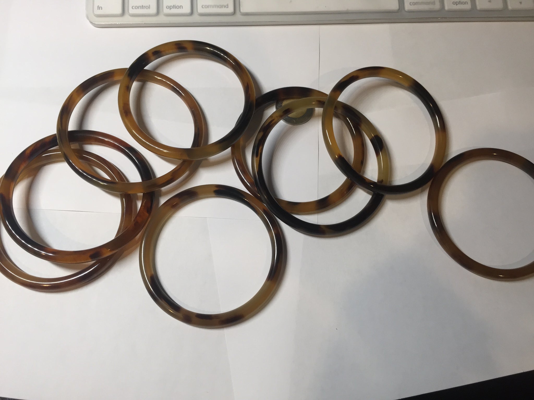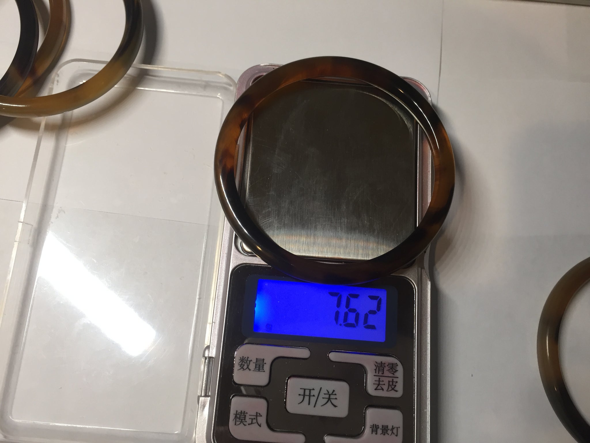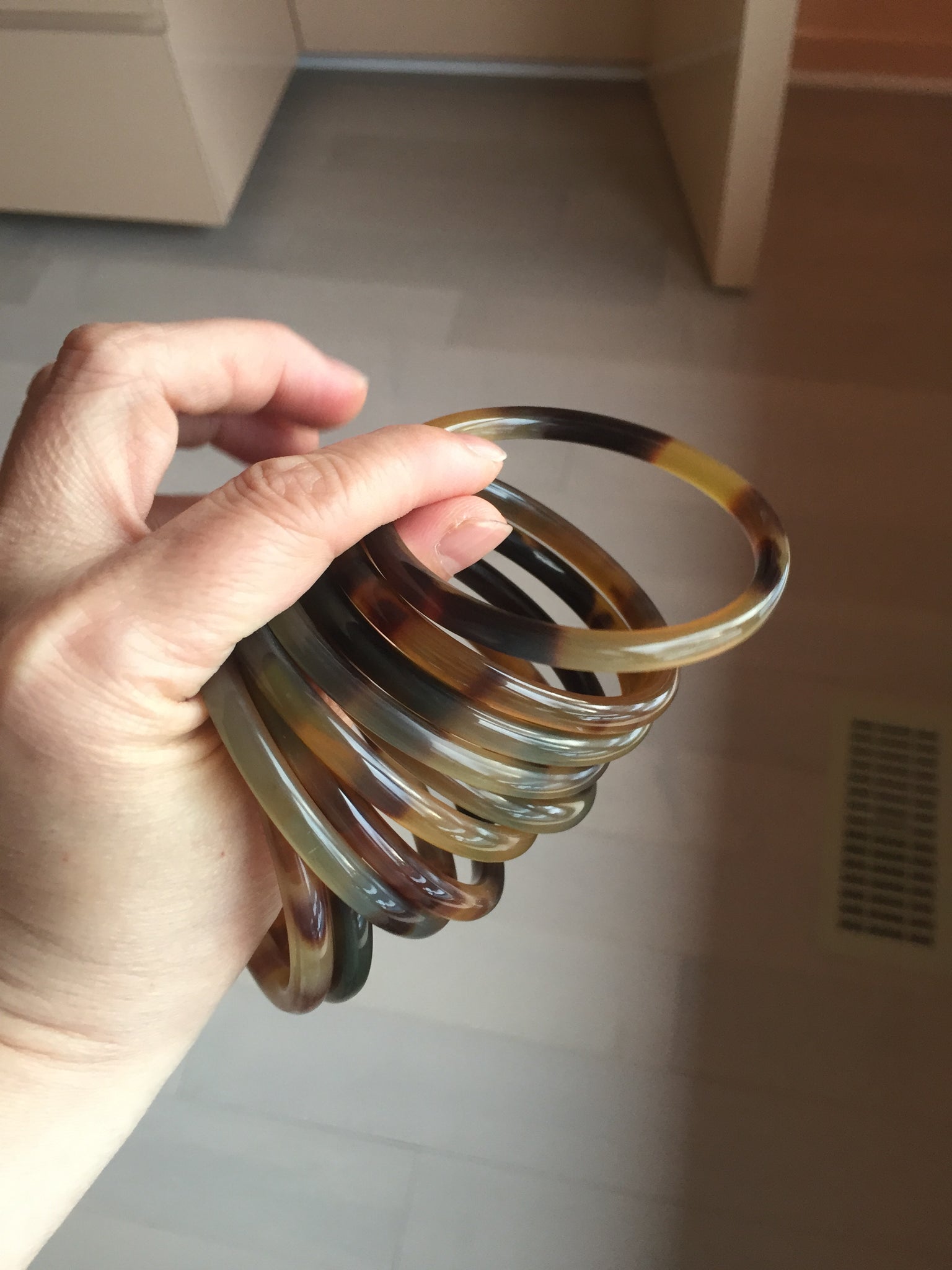 May have white/beige areas which is the horn keratin layer. Tiny scratches. Unnoticeable processing mark. One bangle has a tiny dent.