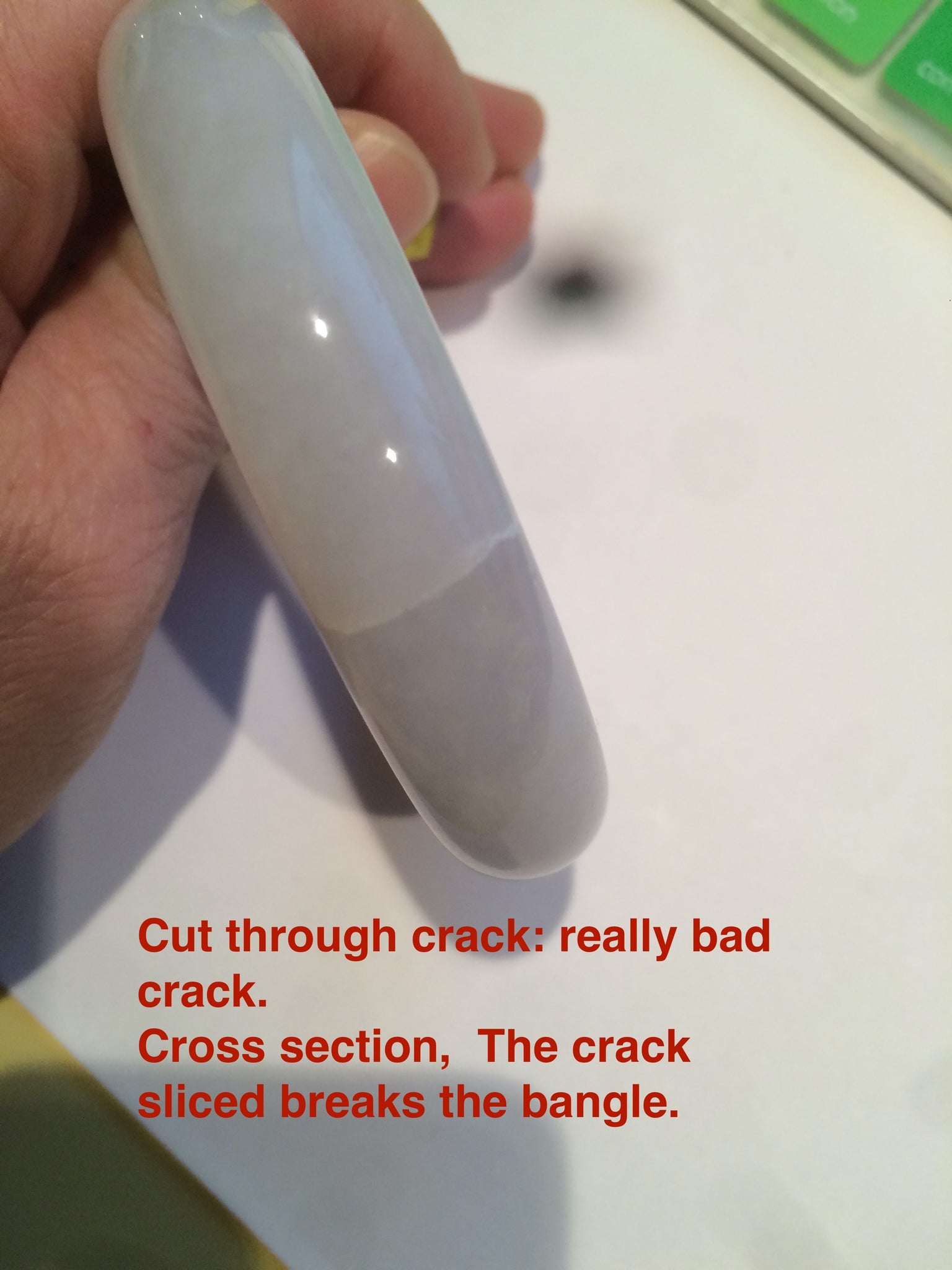 Cut through crack(贯穿裂): really bad crack. Cross-section, The crack sliced breaks the bangle. This will fatally influence firmness. Usually, The bangle needs to be size down.