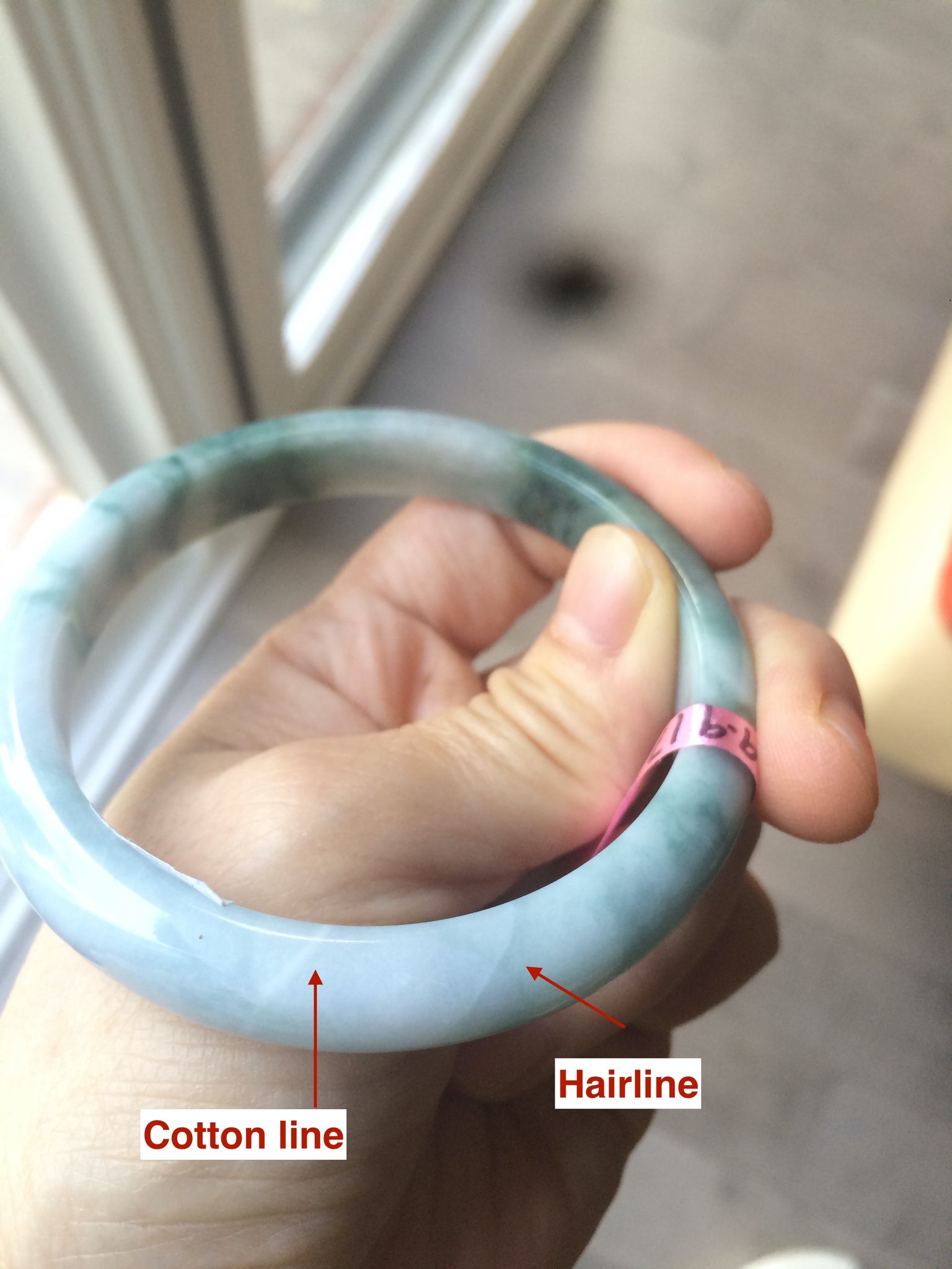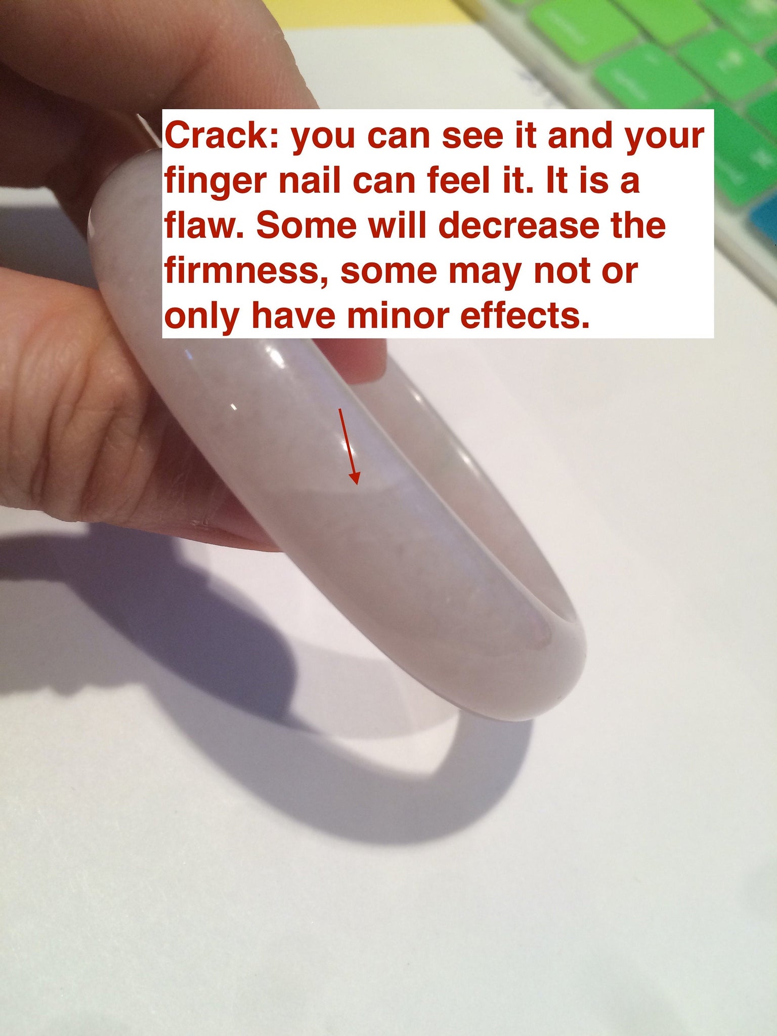 Waterline (水线): you can see it, but your fingernail can’t feel it. it is a natural structure of jade. Won’t influence the firmness. The texture is more denseness in that area that makes it more transparent.Actually, make the bangle firmer.