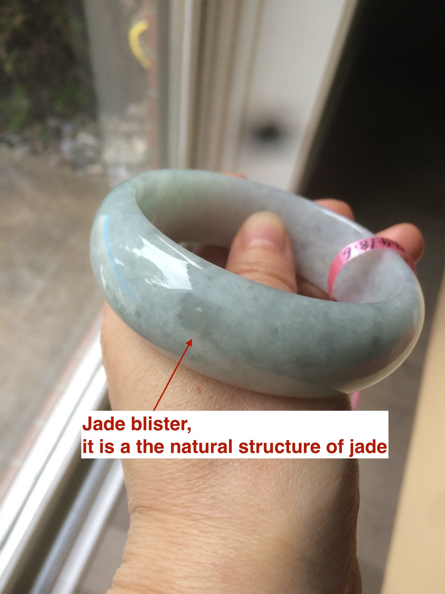 Jade blister(水痘):it is the shorter/bigger version of the waterline. looks like a bean with water in it. it is a natural structure of jade. Won’t influence the firmness. Actually, make the bangle firmer.