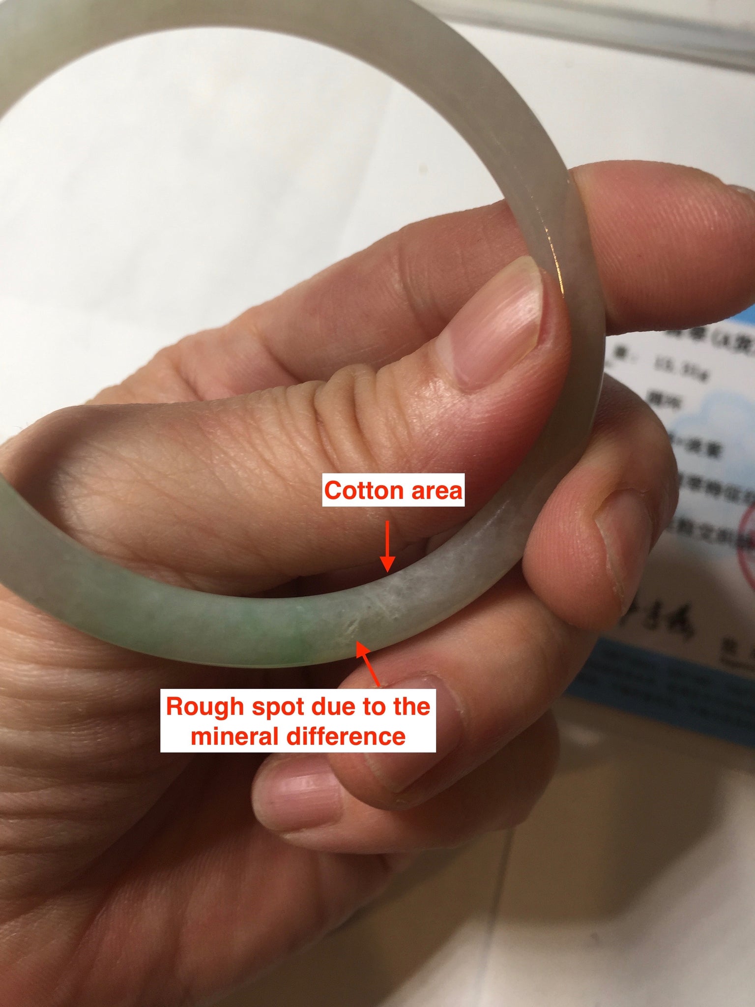No crack. No hairline. One tiny rough spot due to the mineral difference. One yellow/brown area. Some cotton lines, cotton spots, cotton areas. The purple is very light. It just a hint of it, lighter than in the photos.