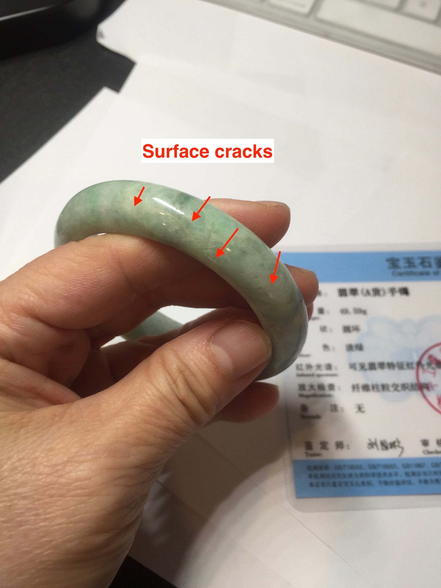 Imperfections: Quite a lot of surface cracks or fissures. Some rough surfaces. The bangle is still firm. Some hairlines, cotton lines, and cotton areas.