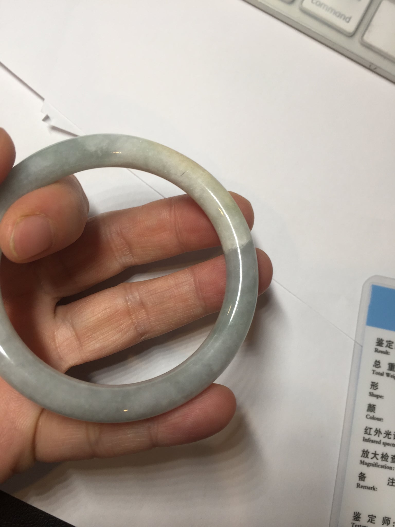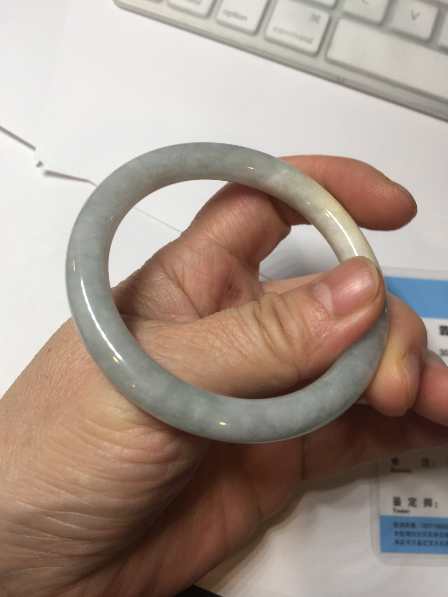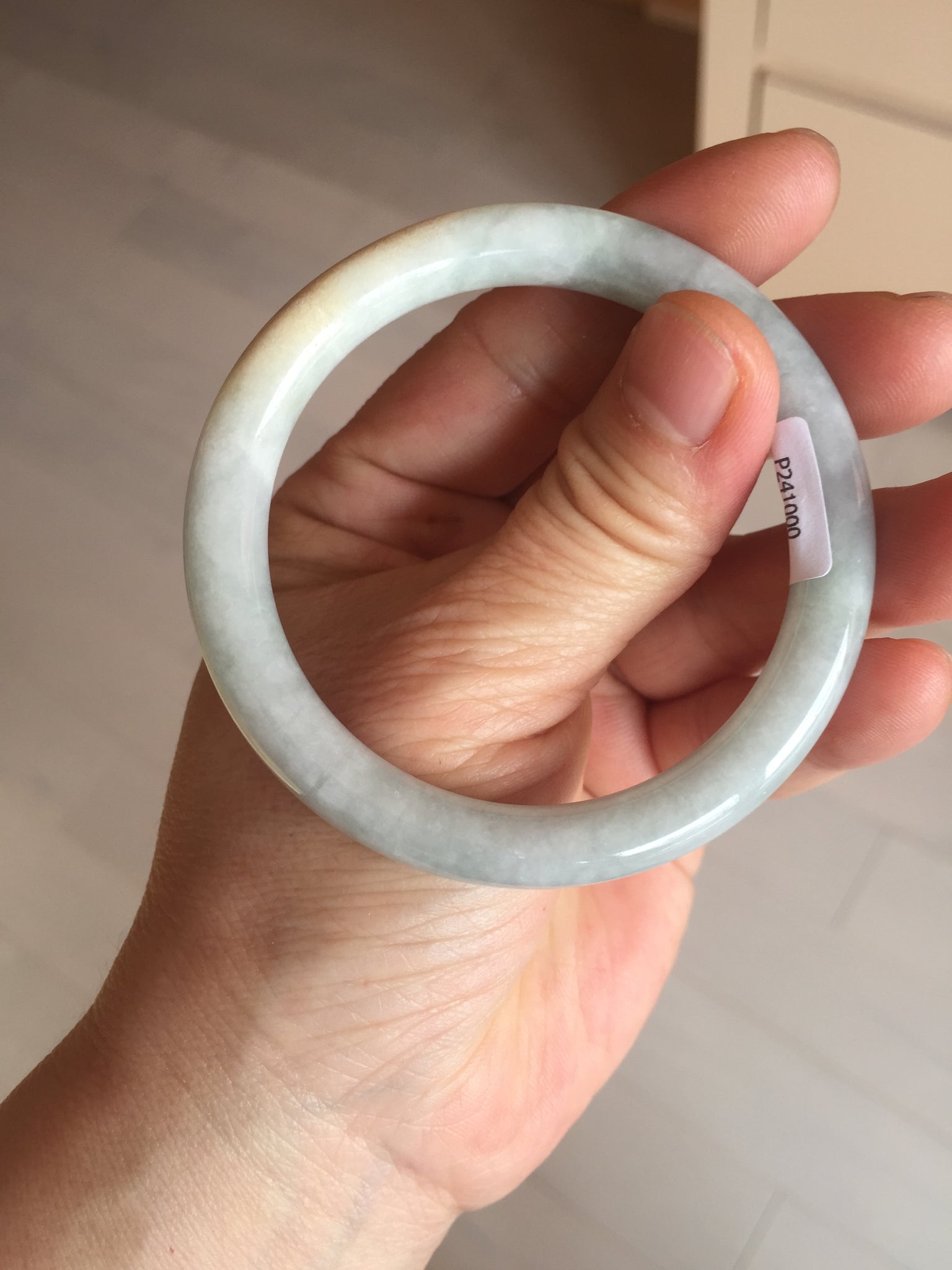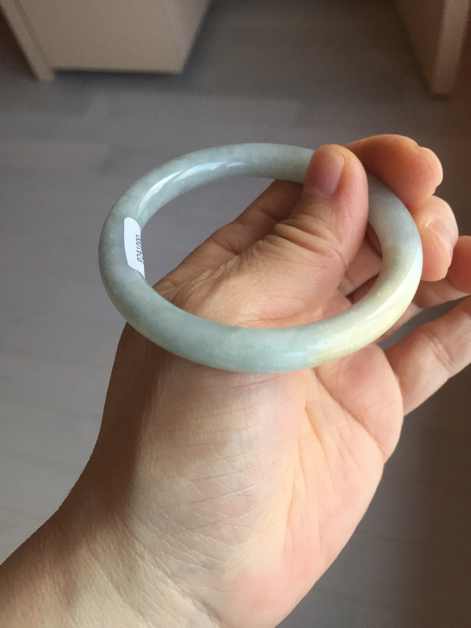 One crack. One rough surface and cotton area. One black spot. Some cotton lines and cotton spots. Not transparent. Not watery.