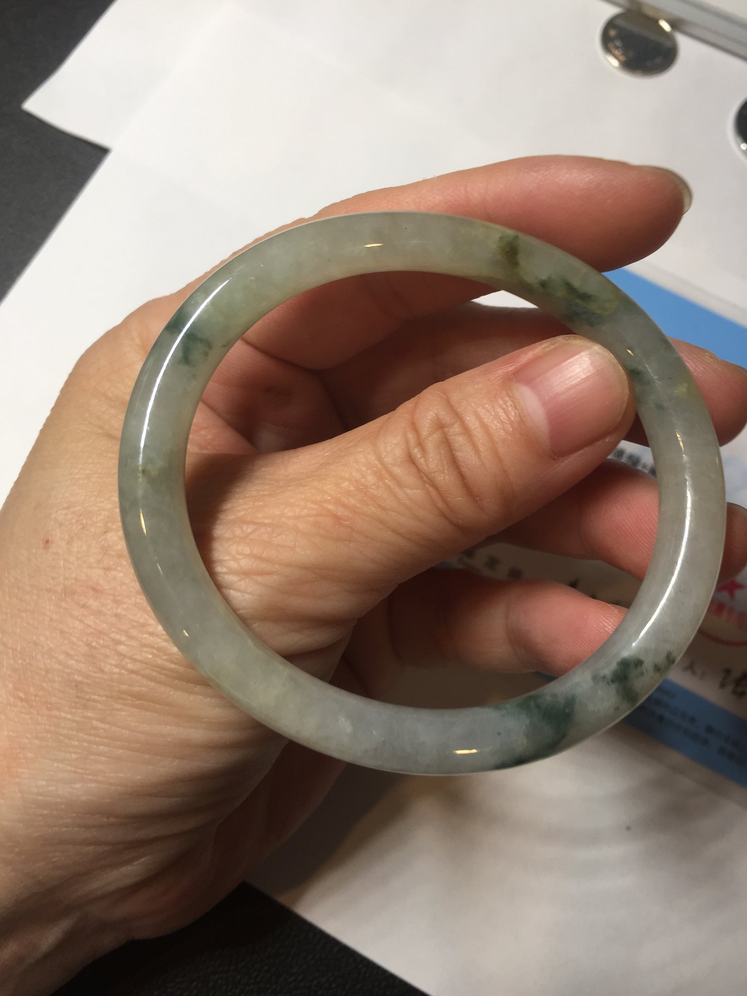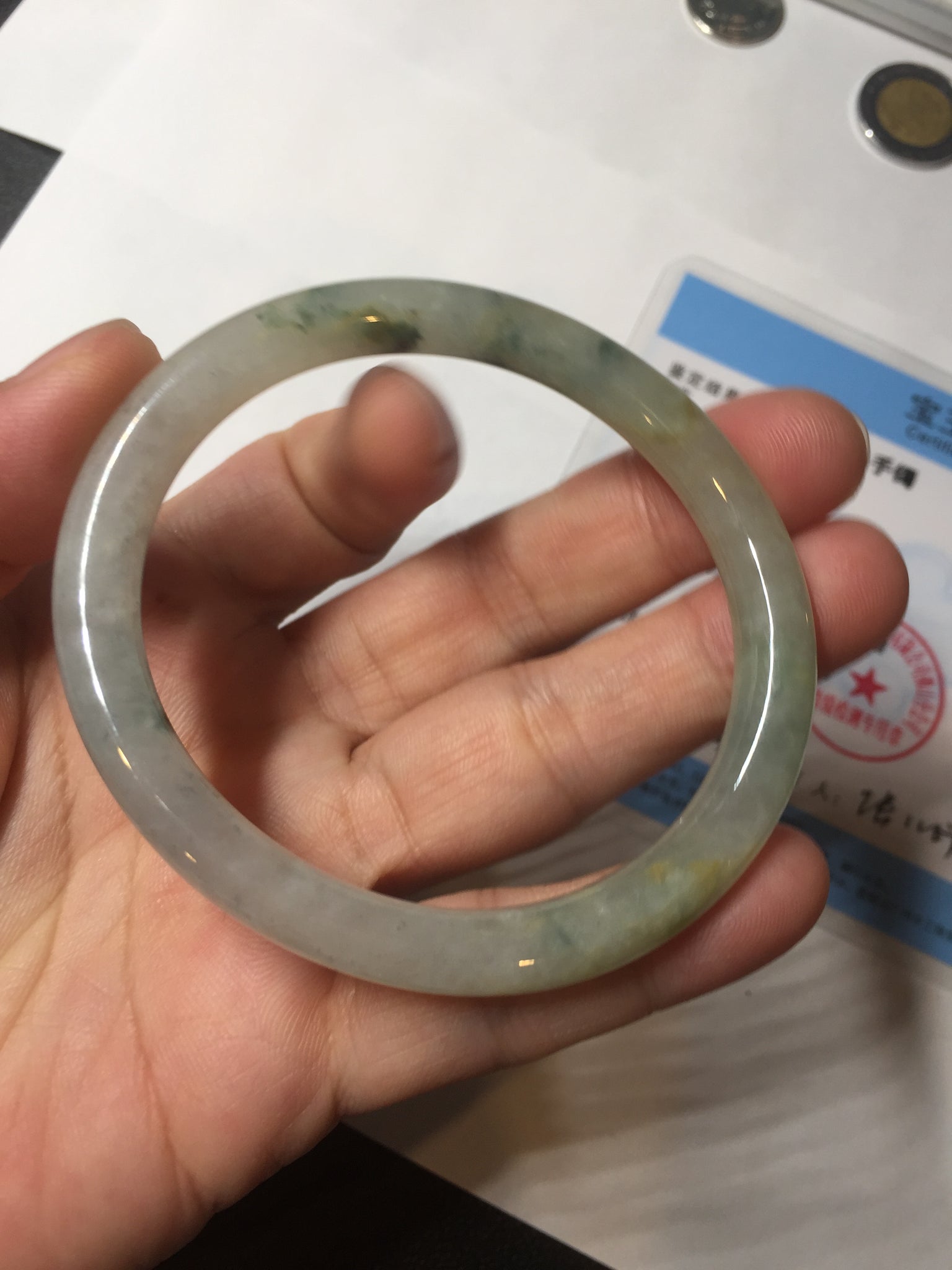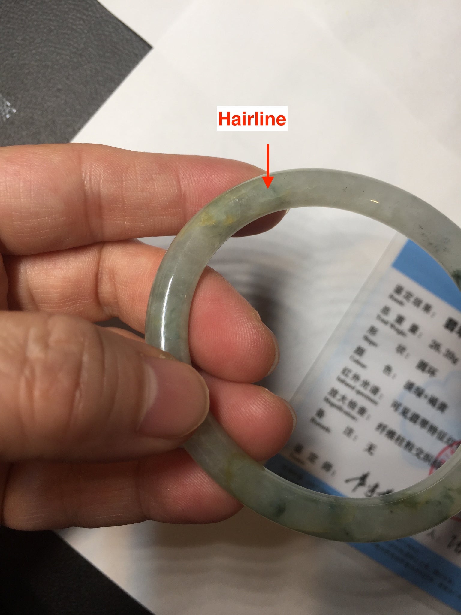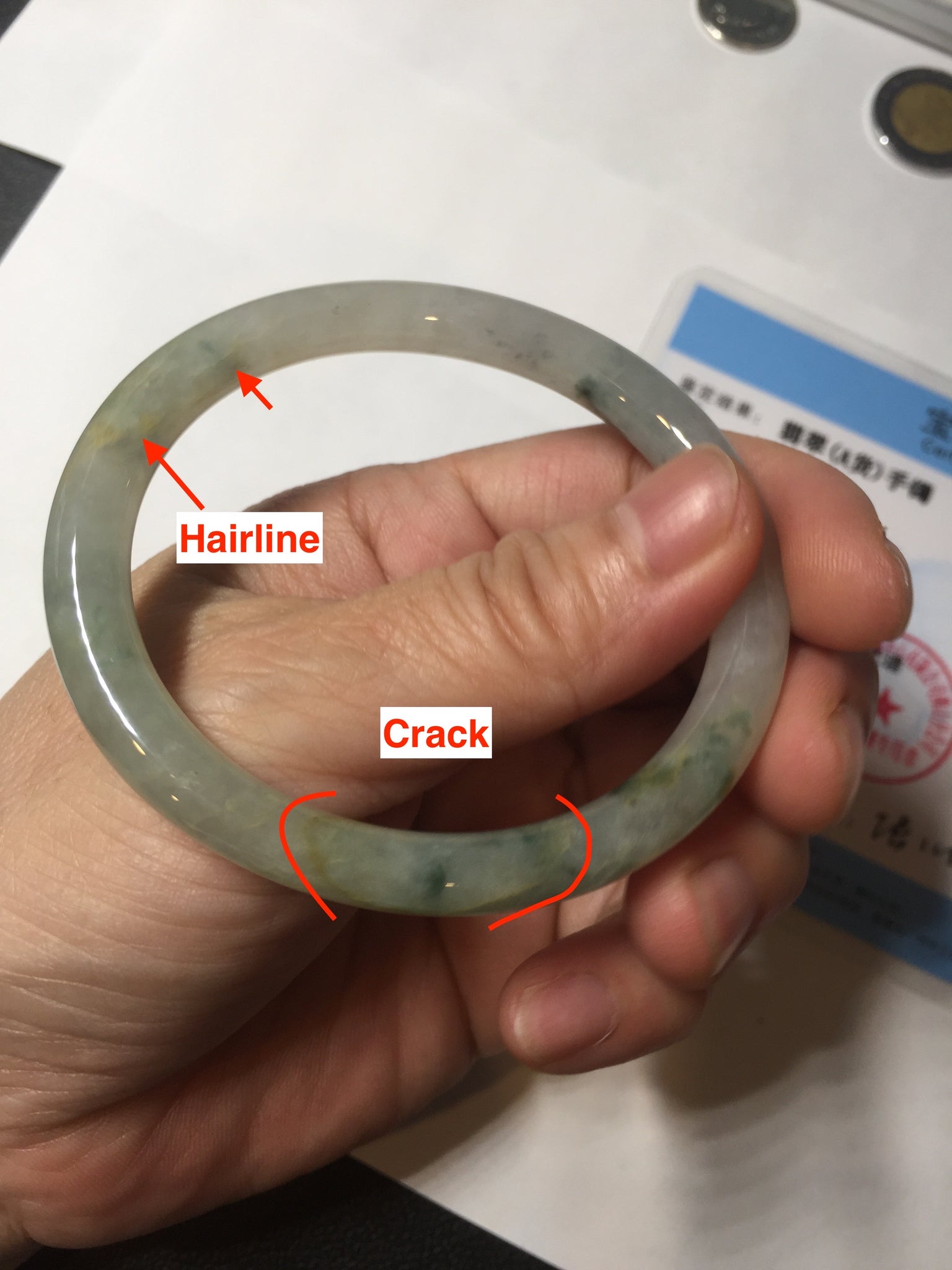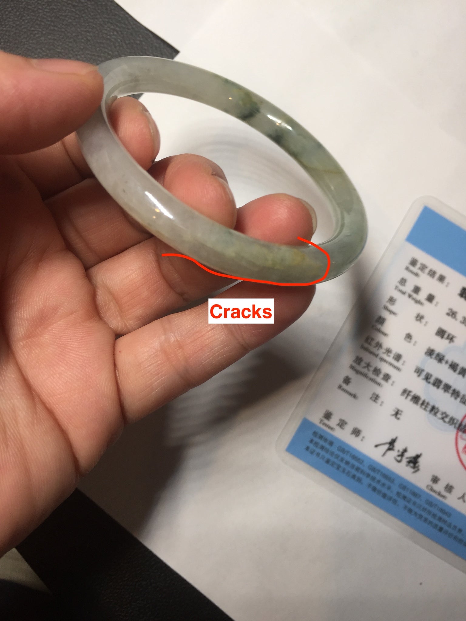 Some cracks. The bangle is solid (guaranteed!). Some hairlines, cotton lines, and cotton spots.