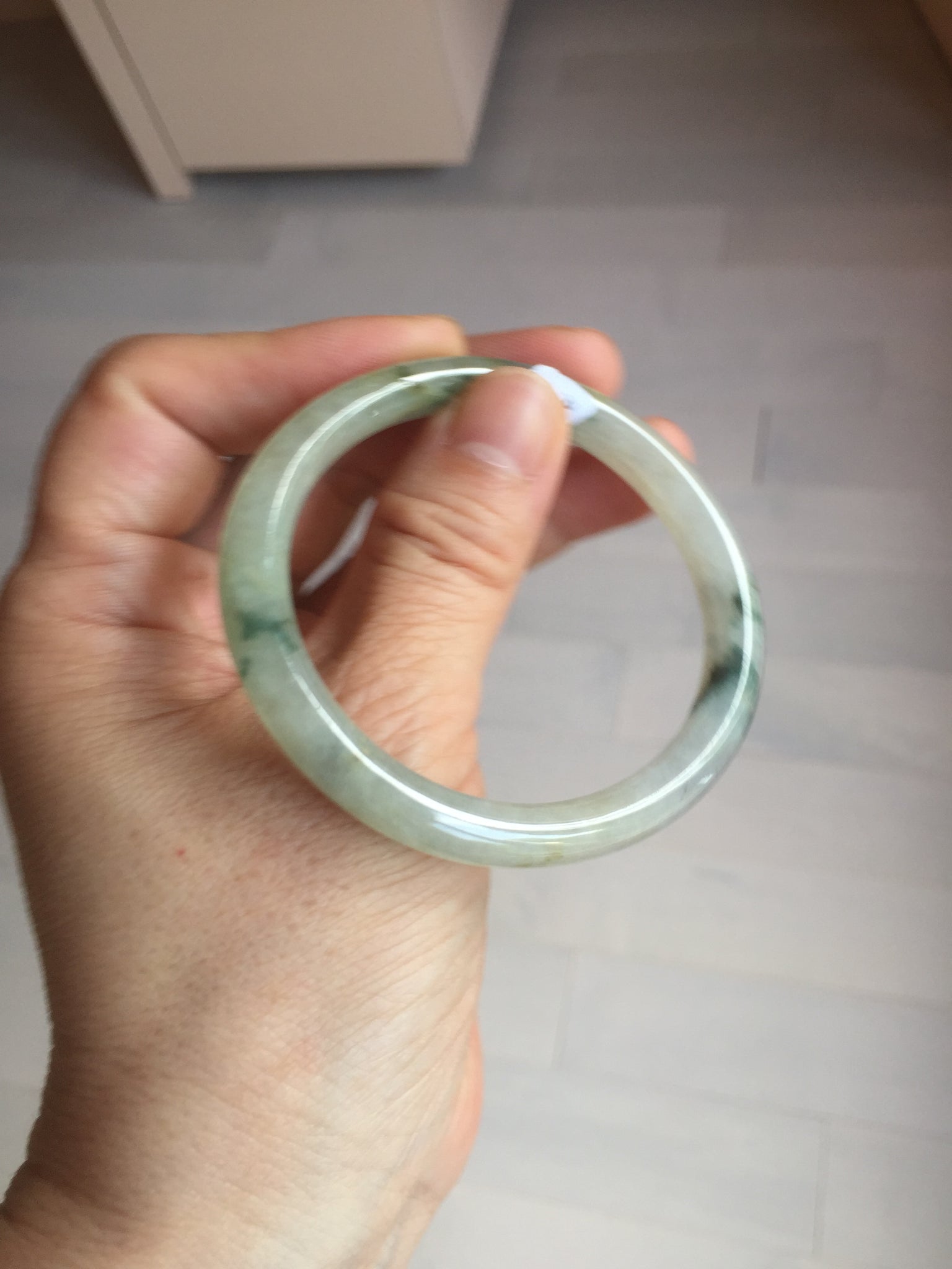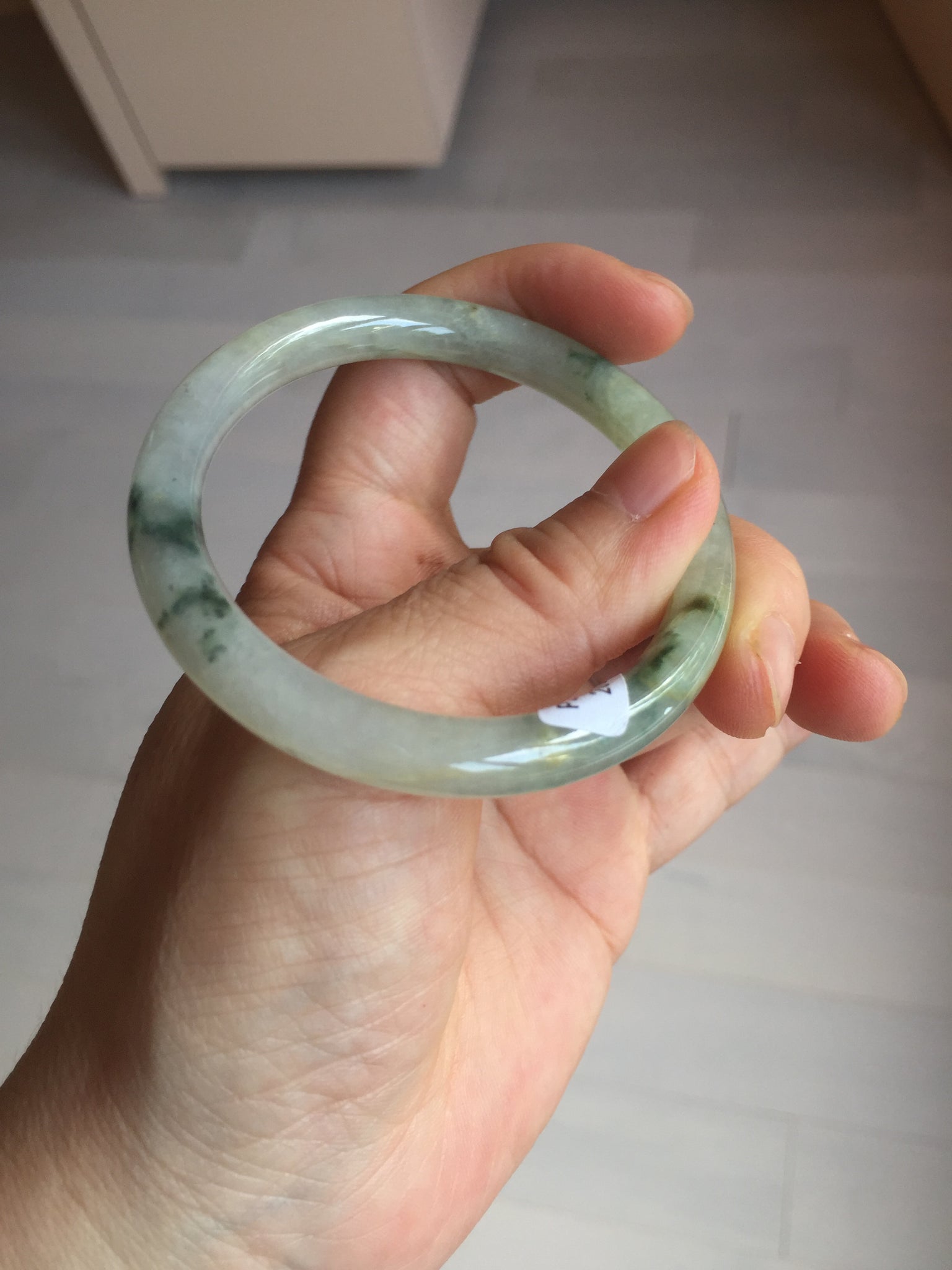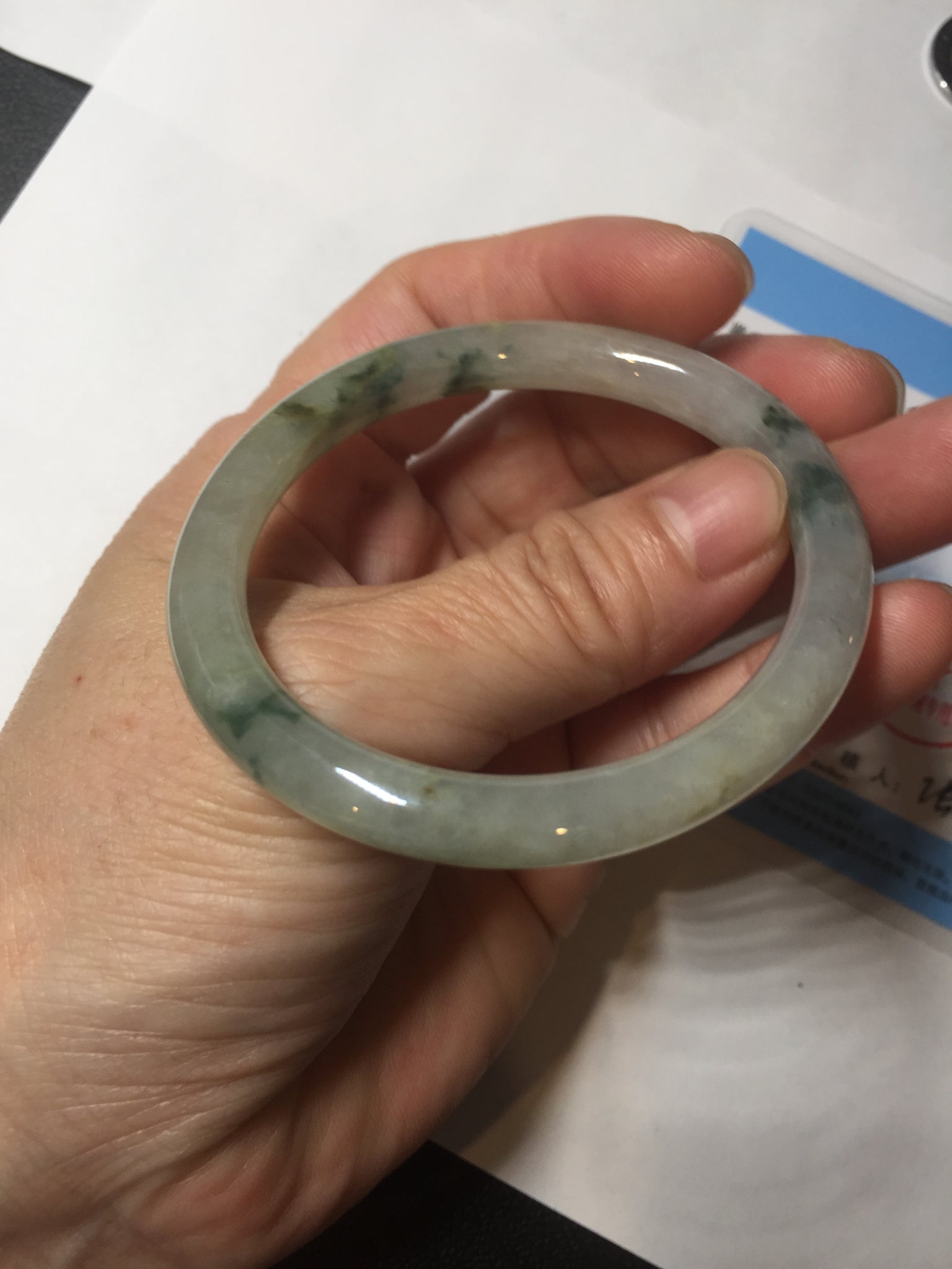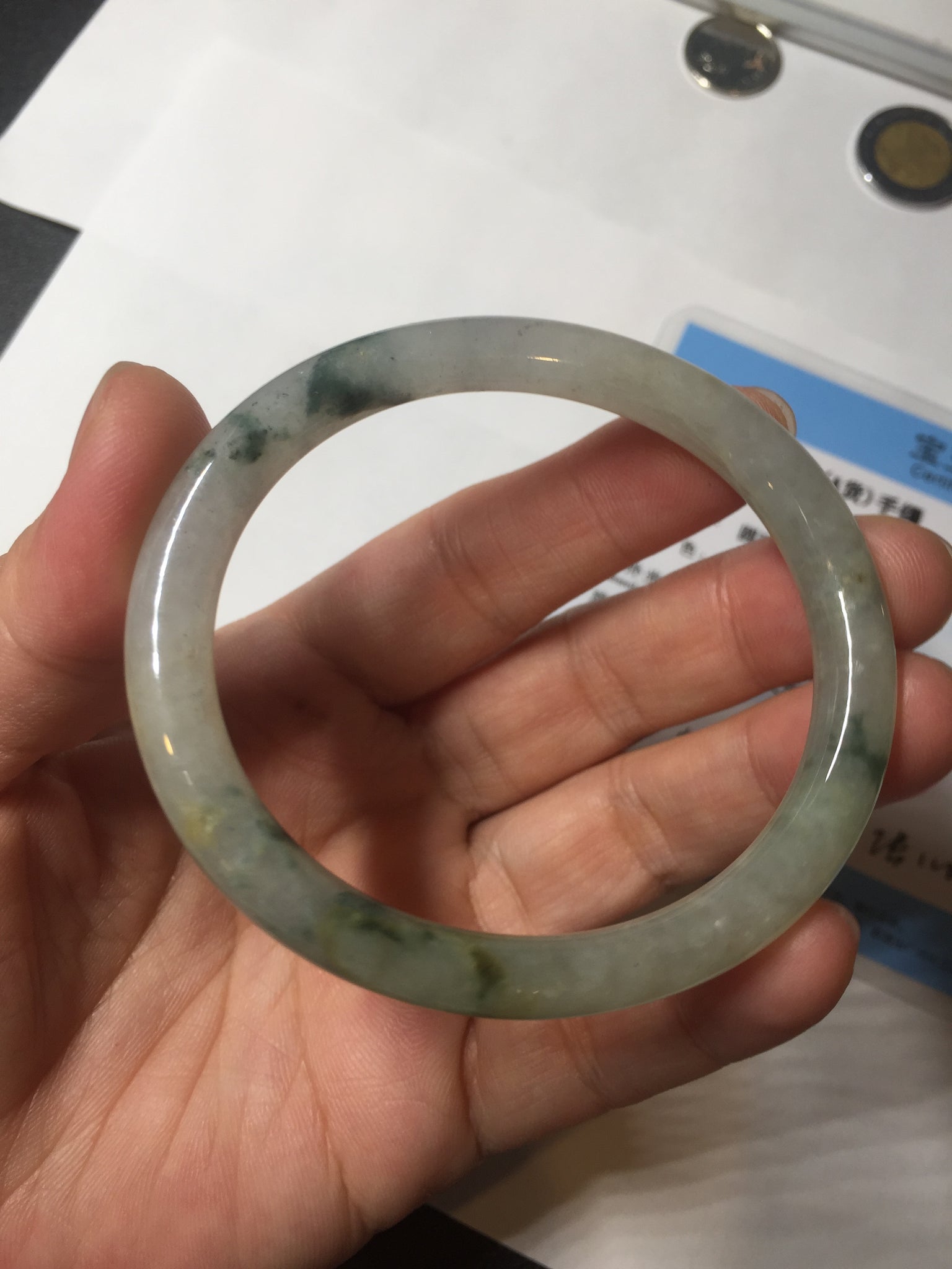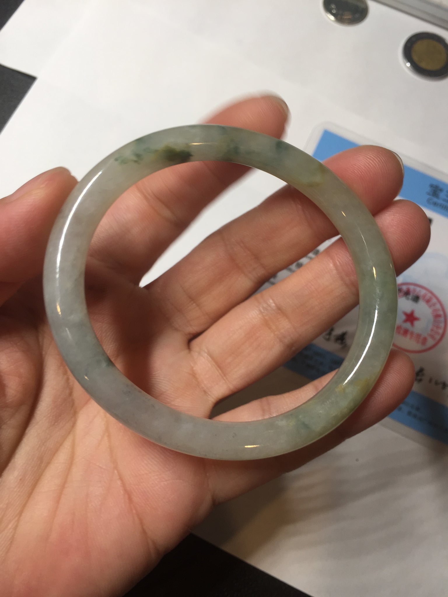 Some cracks. The bangle is solid (guaranteed!). Some hairlines, cotton lines, and cotton spots.