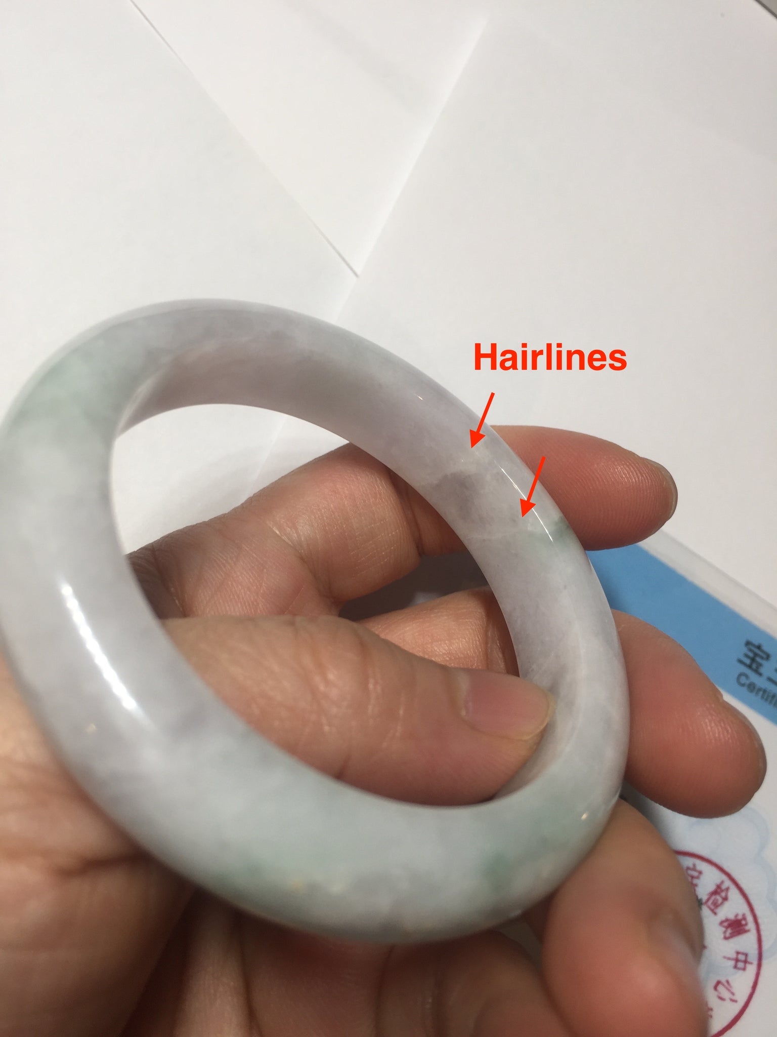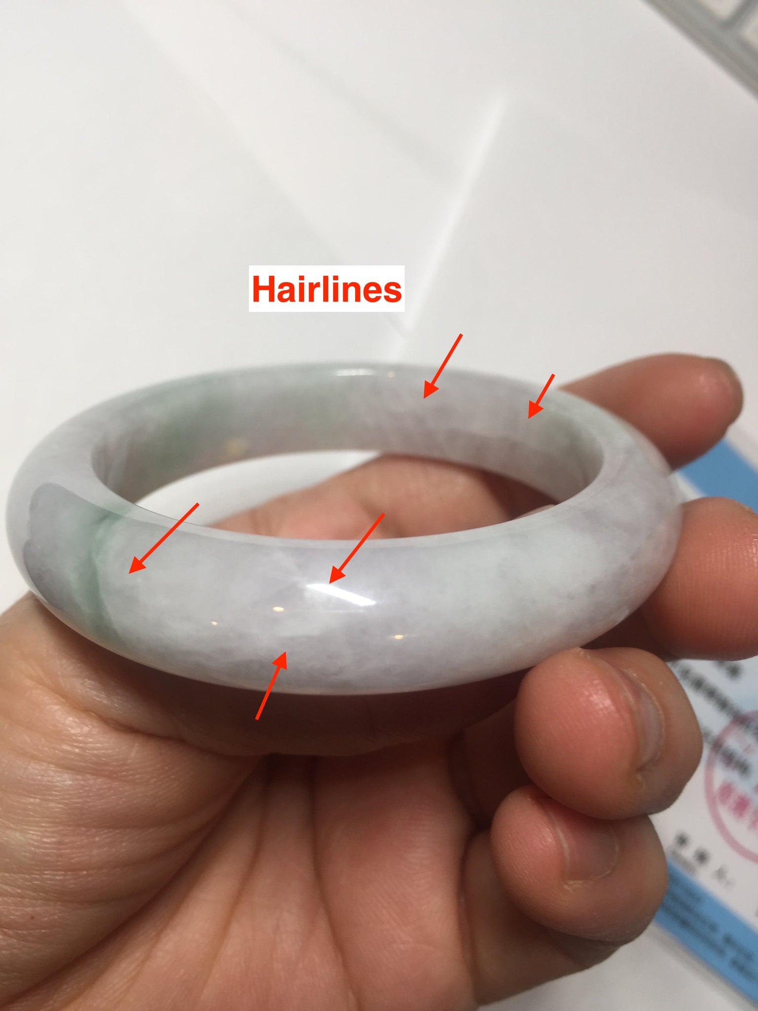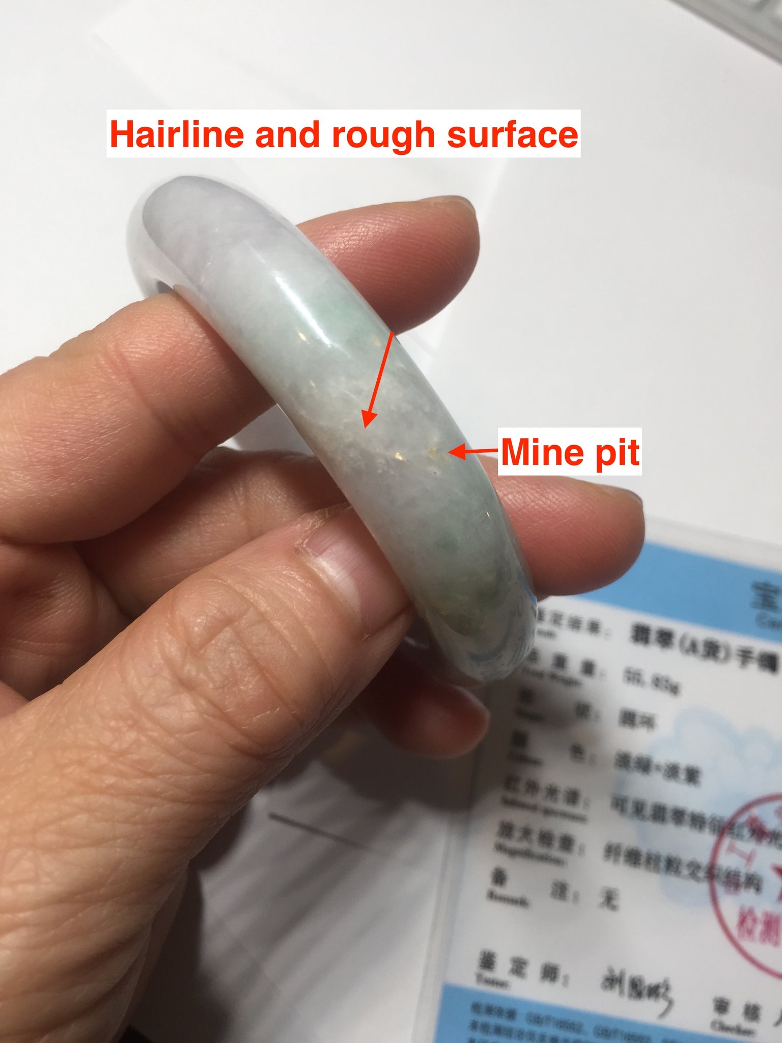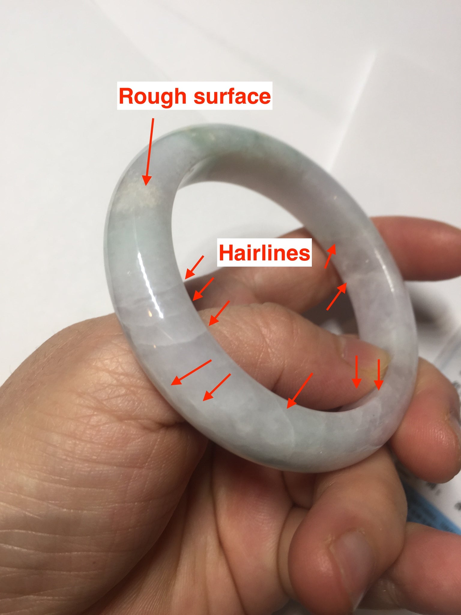 No crack. Some hairlines. Some cotton lines, spots, and area. Some rough surfaces and small mine pits. The purple is lighter than in the photos.