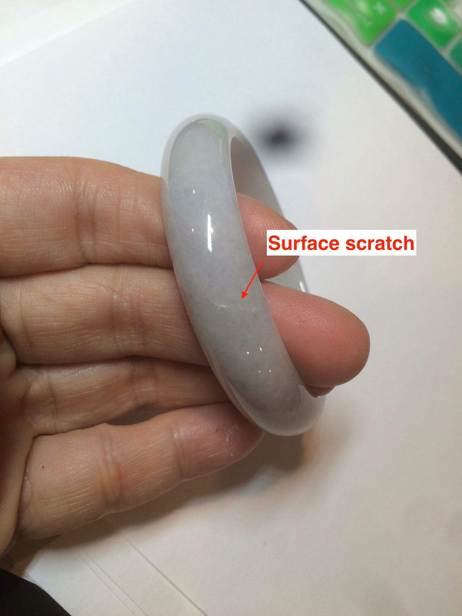 One surface scratch. One around the bangle hairline.  Won't influence the firmness. Some cotton spots. Not transparent. The purple is super light. Lighter than in photos.