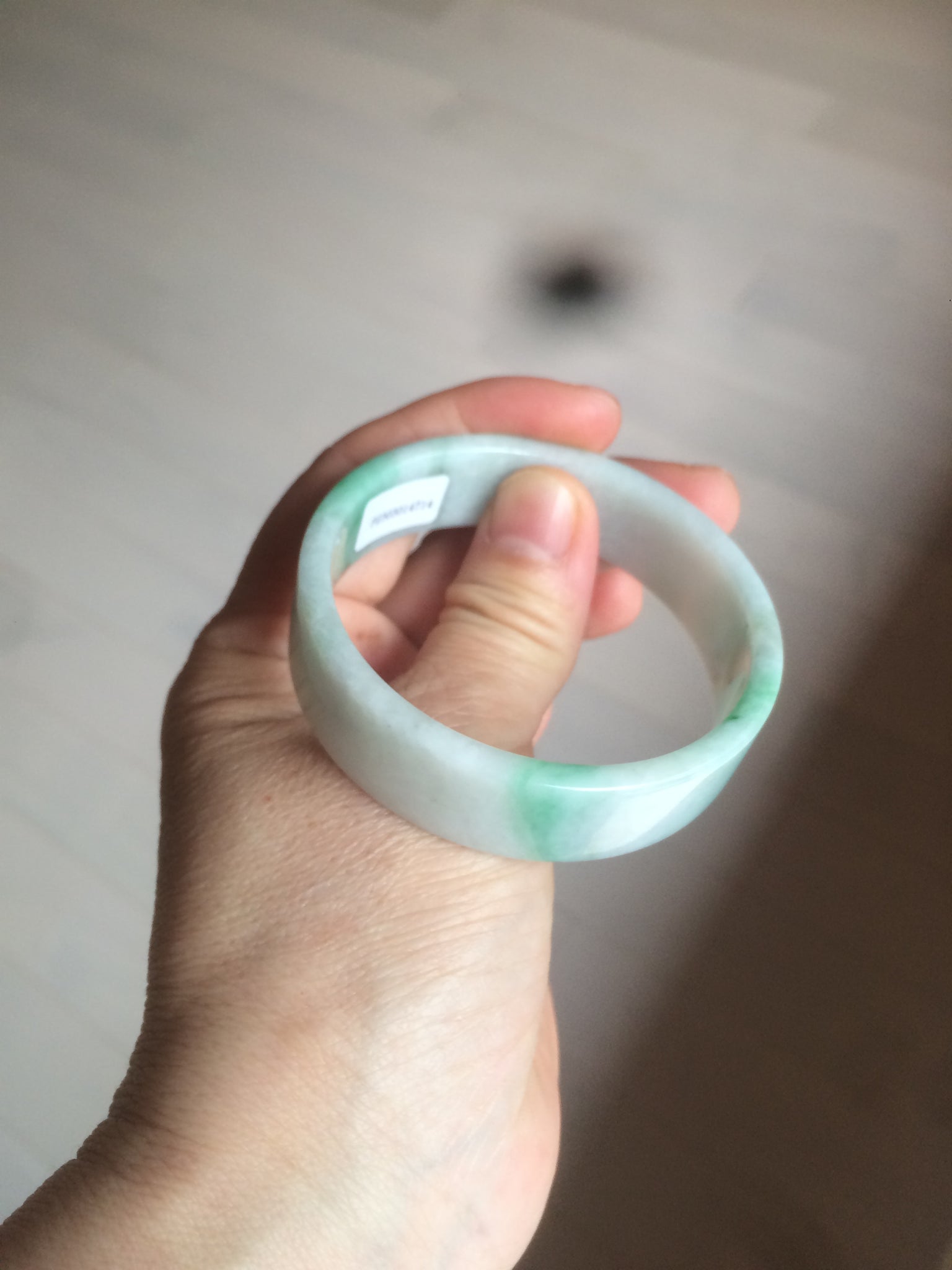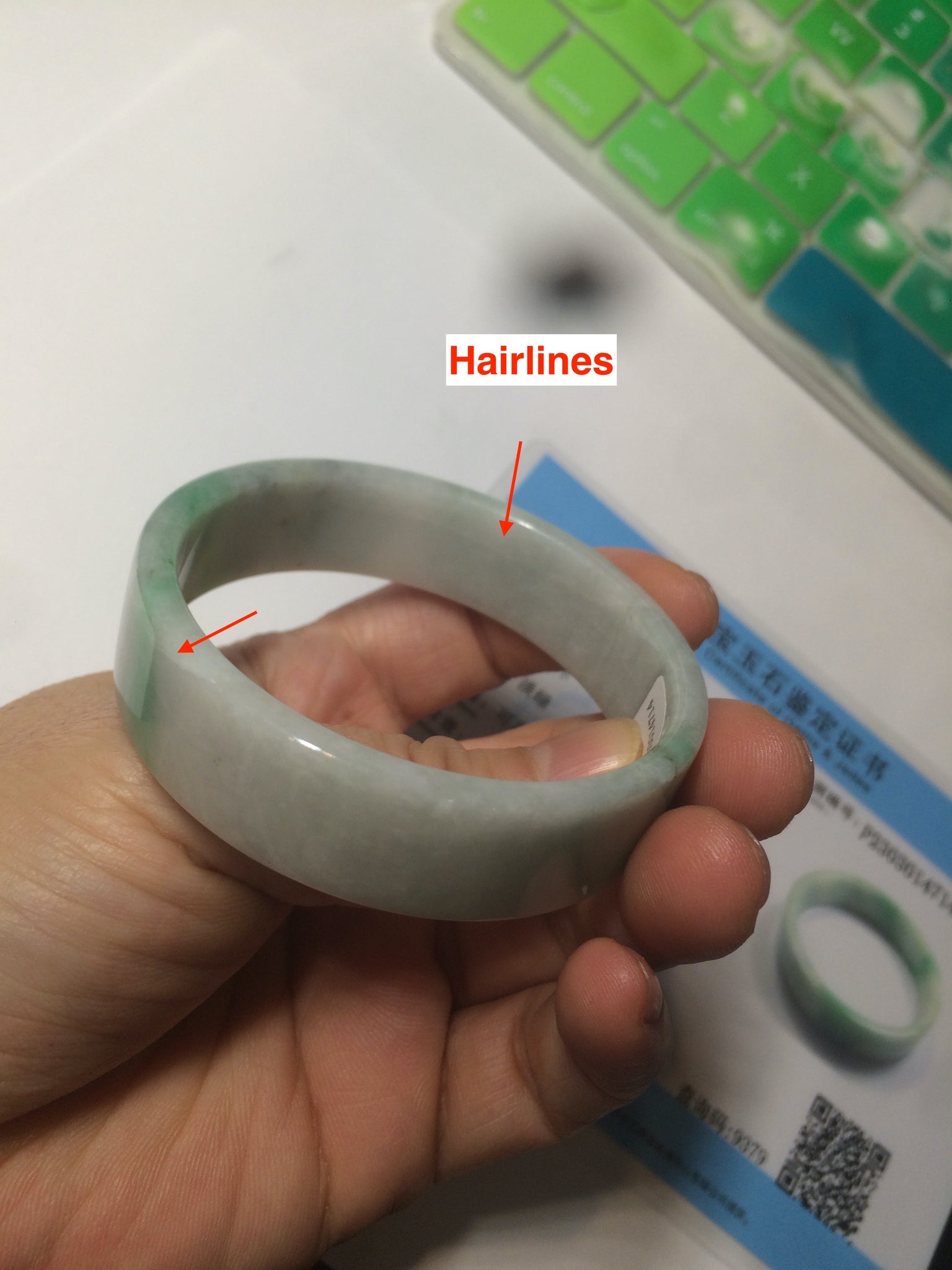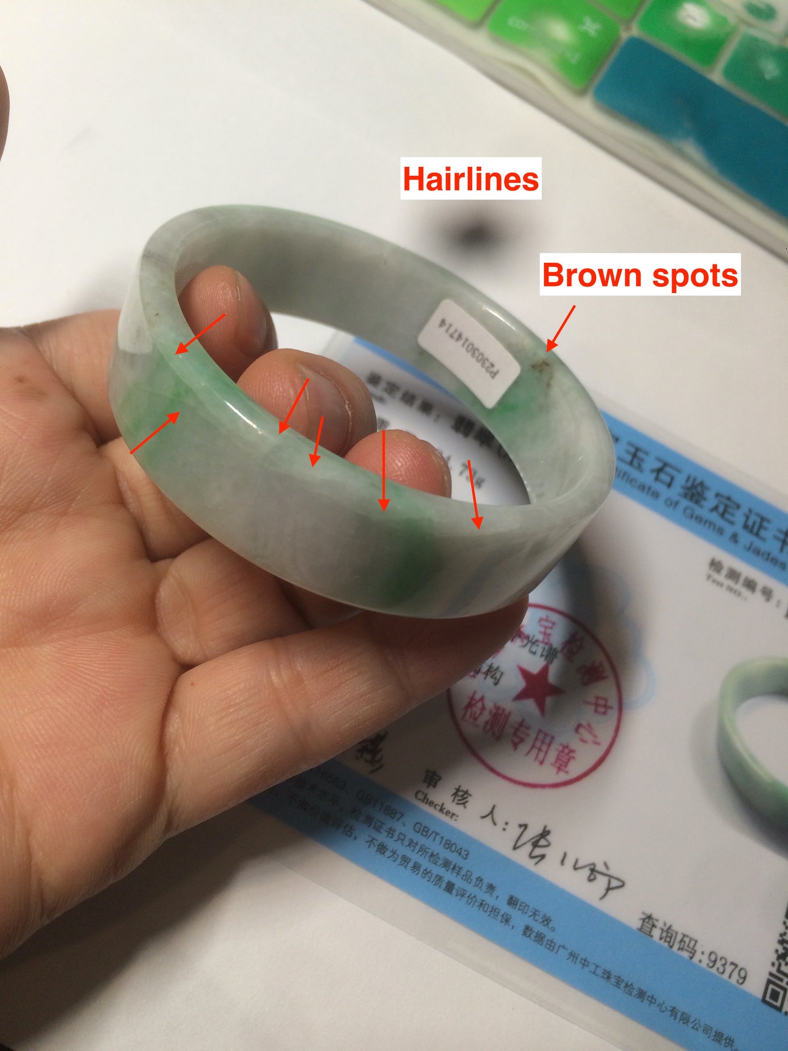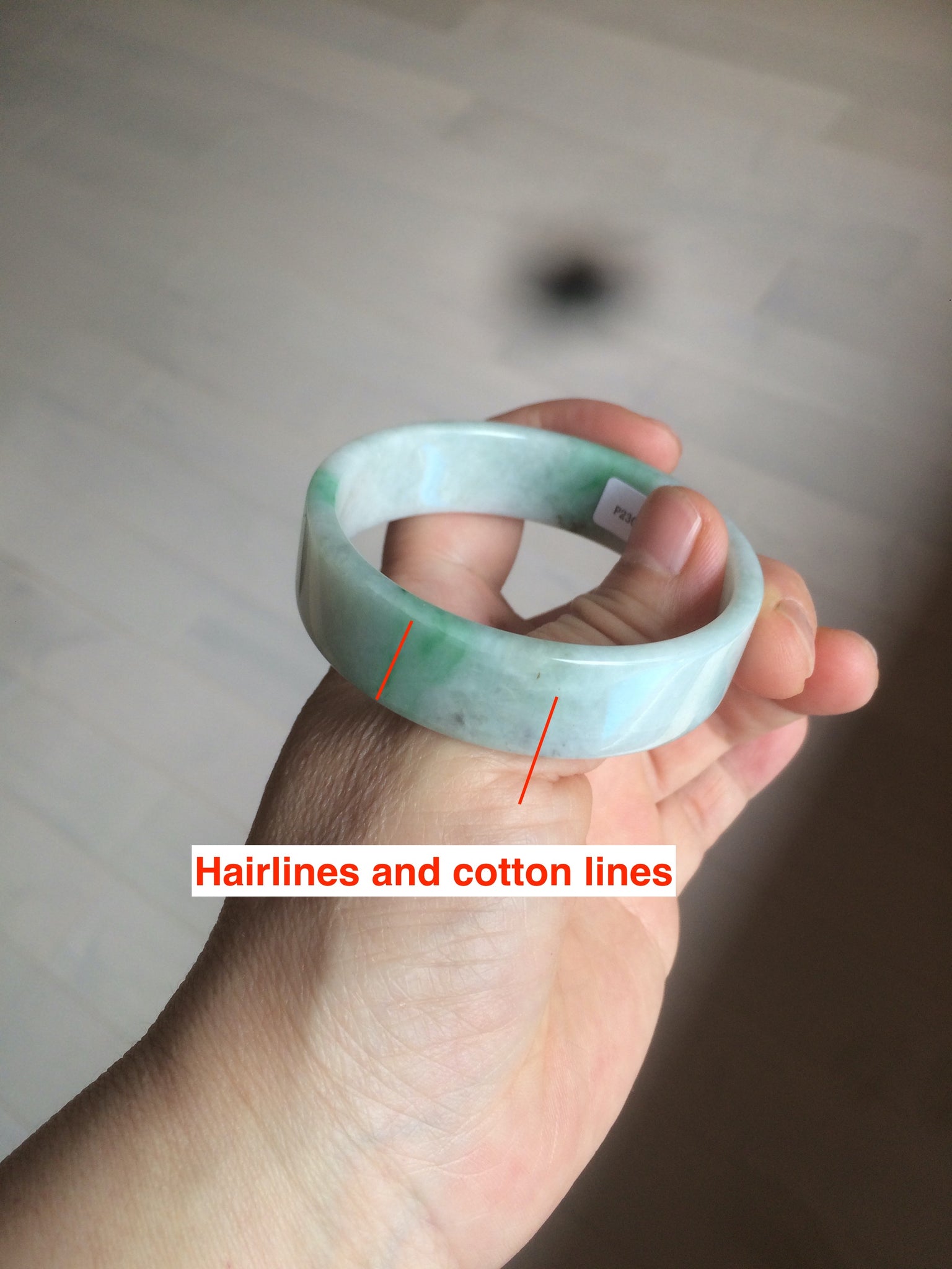 No crack. Some hairlines or cotton lines. The bangle is solid(Guaranteed!). Makes a high-pitched sound when clicked. Some of the hairlines are long. Some black/dark purple spots. Some cotton spots. The purple is super light. Lighter than in photos due to the purple color always being more camera friendly.