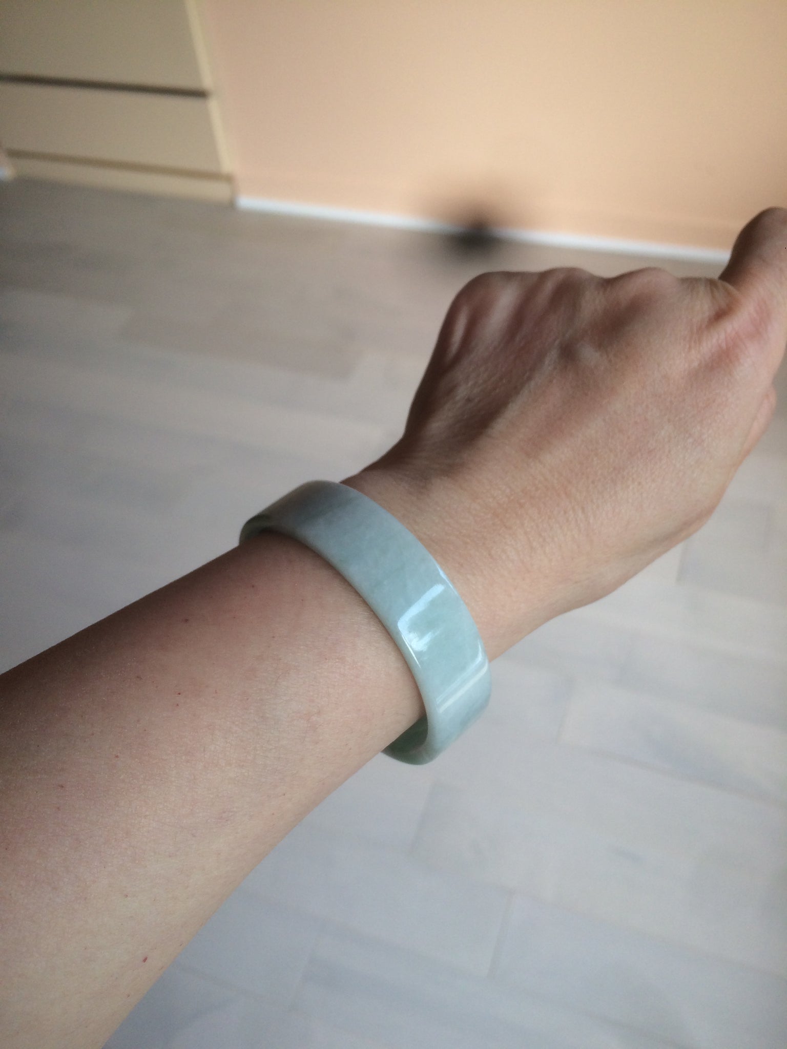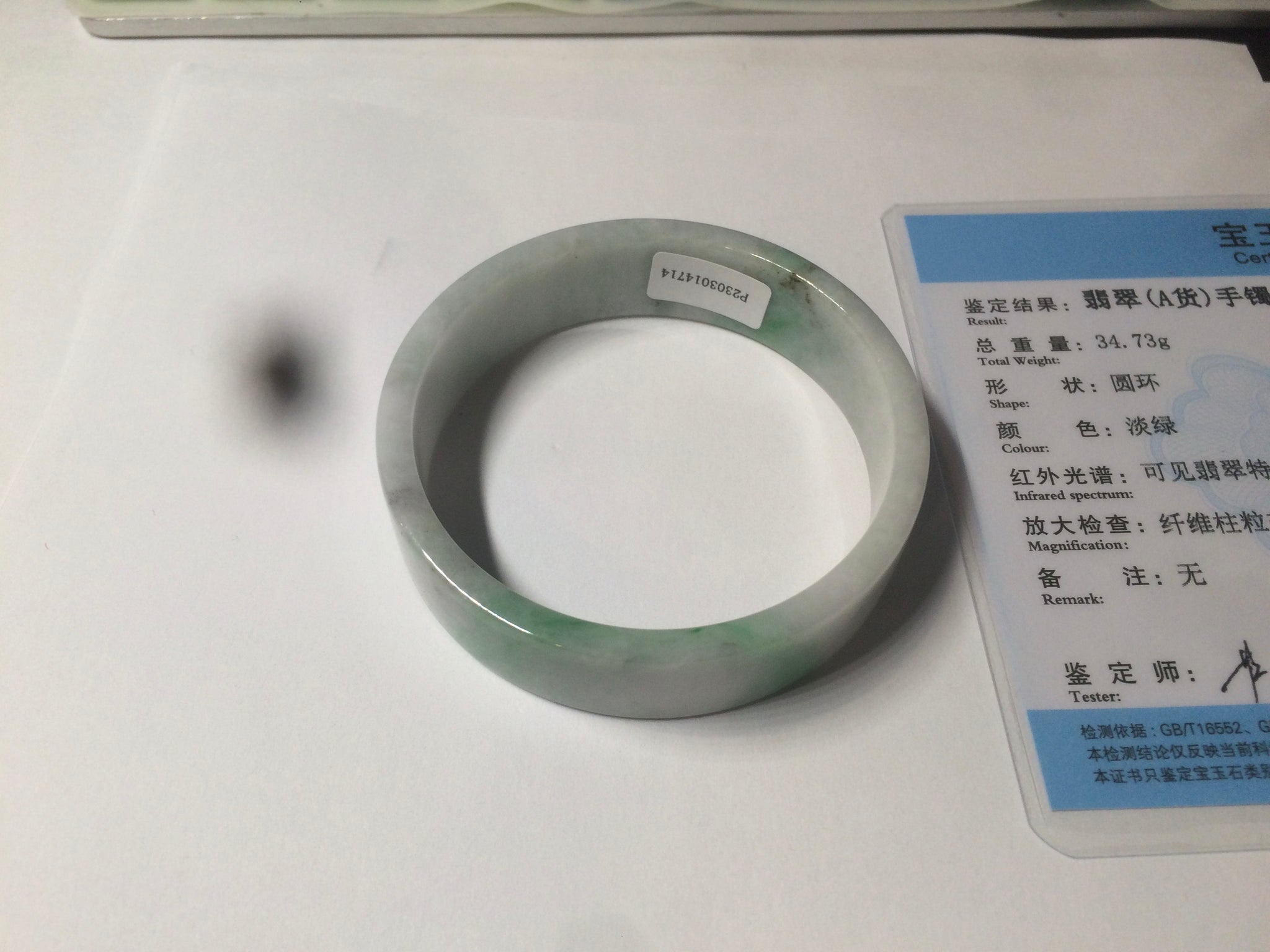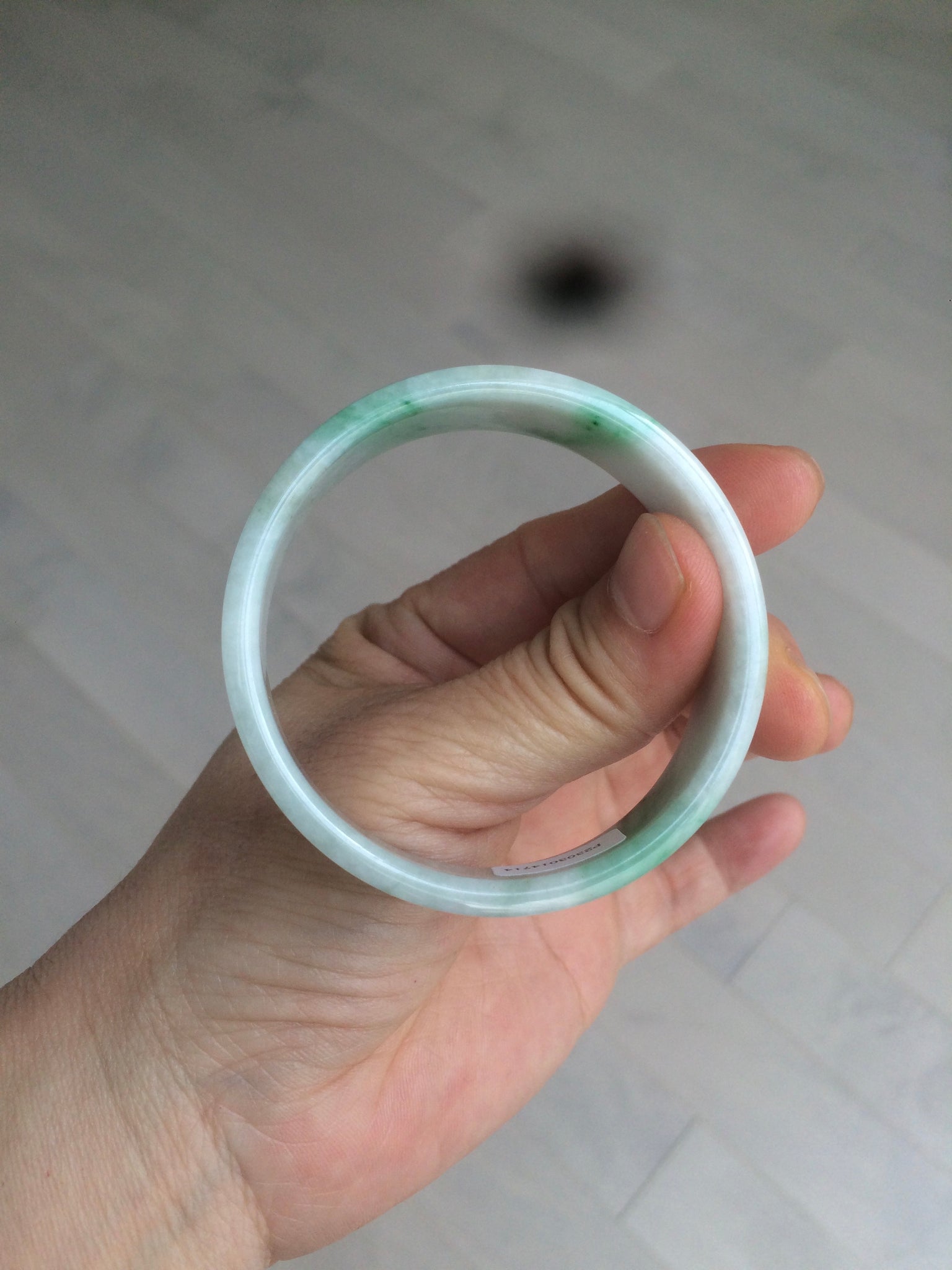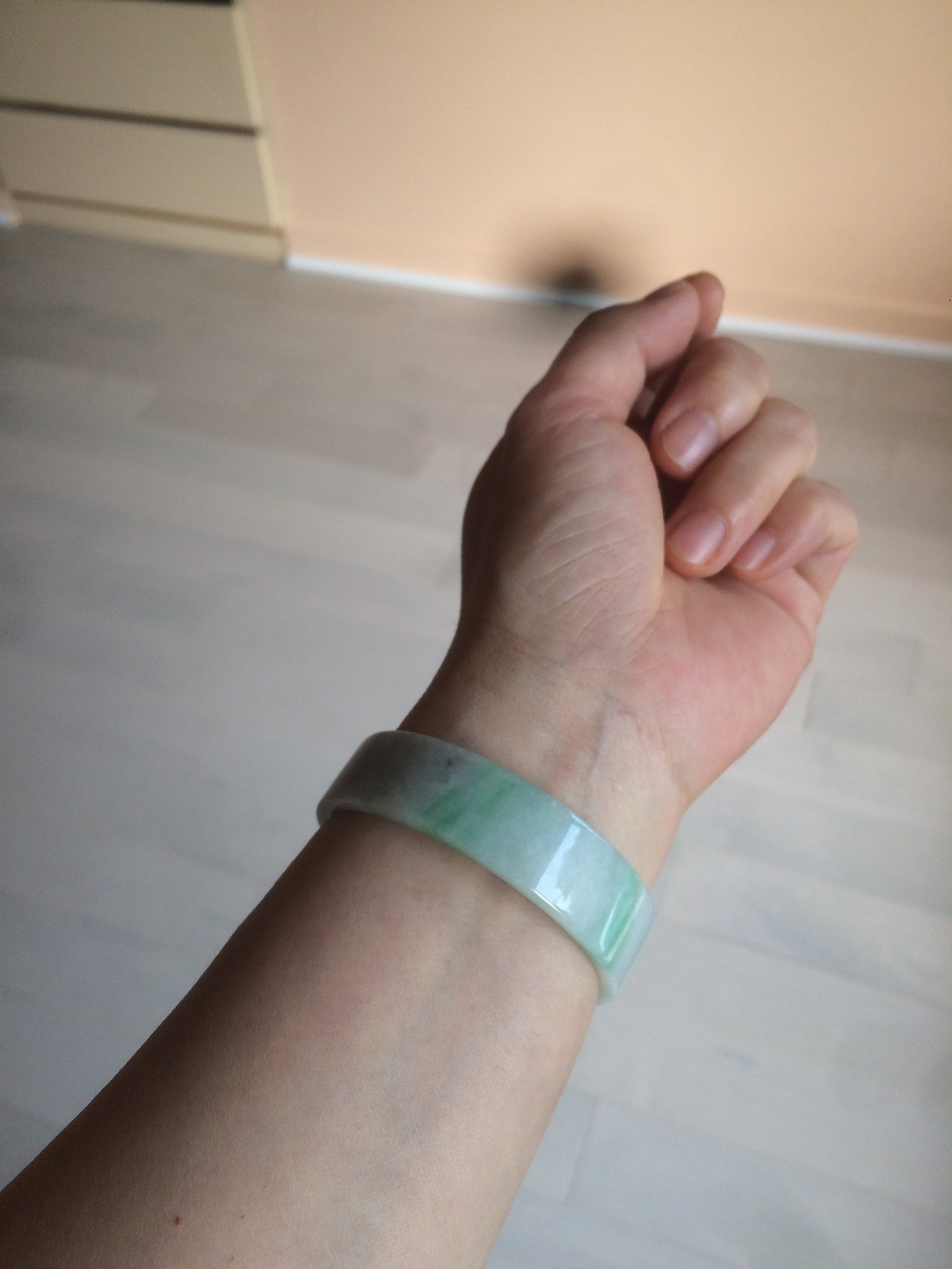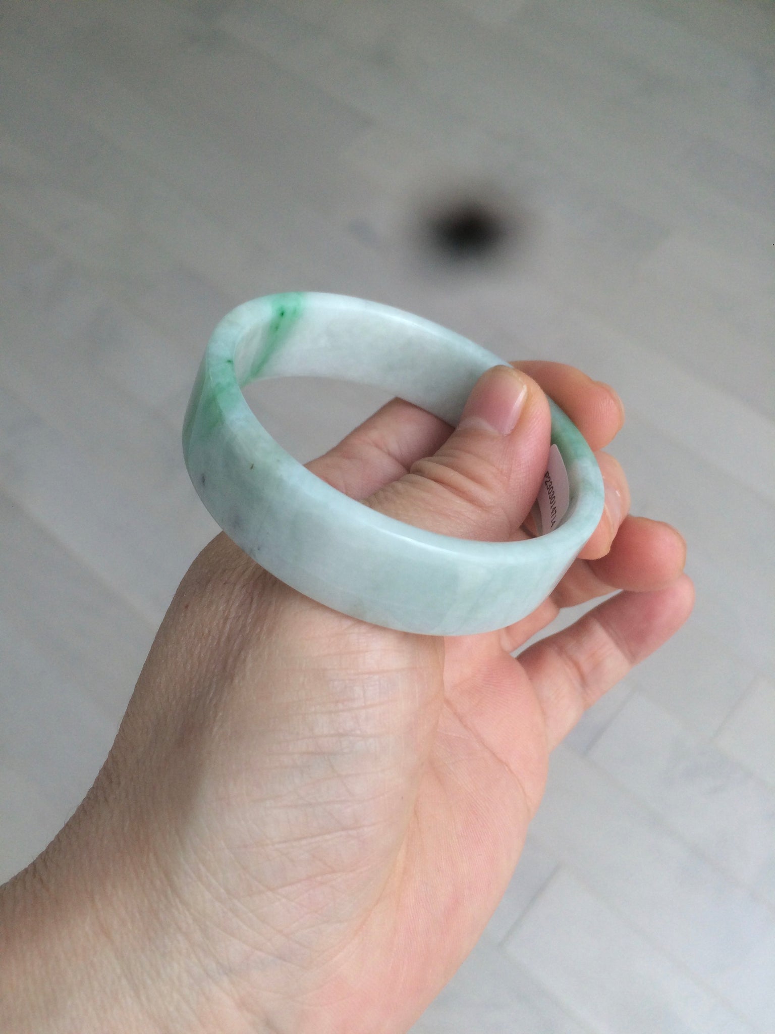 No crack. Some hairlines or cotton lines. The bangle is solid(Guaranteed!). Makes a high-pitched sound when clicked. Some of the hairlines are long. Some black/dark purple spots. Some cotton spots. The purple is super light. Lighter than in photos due to the purple color always being more camera friendly.