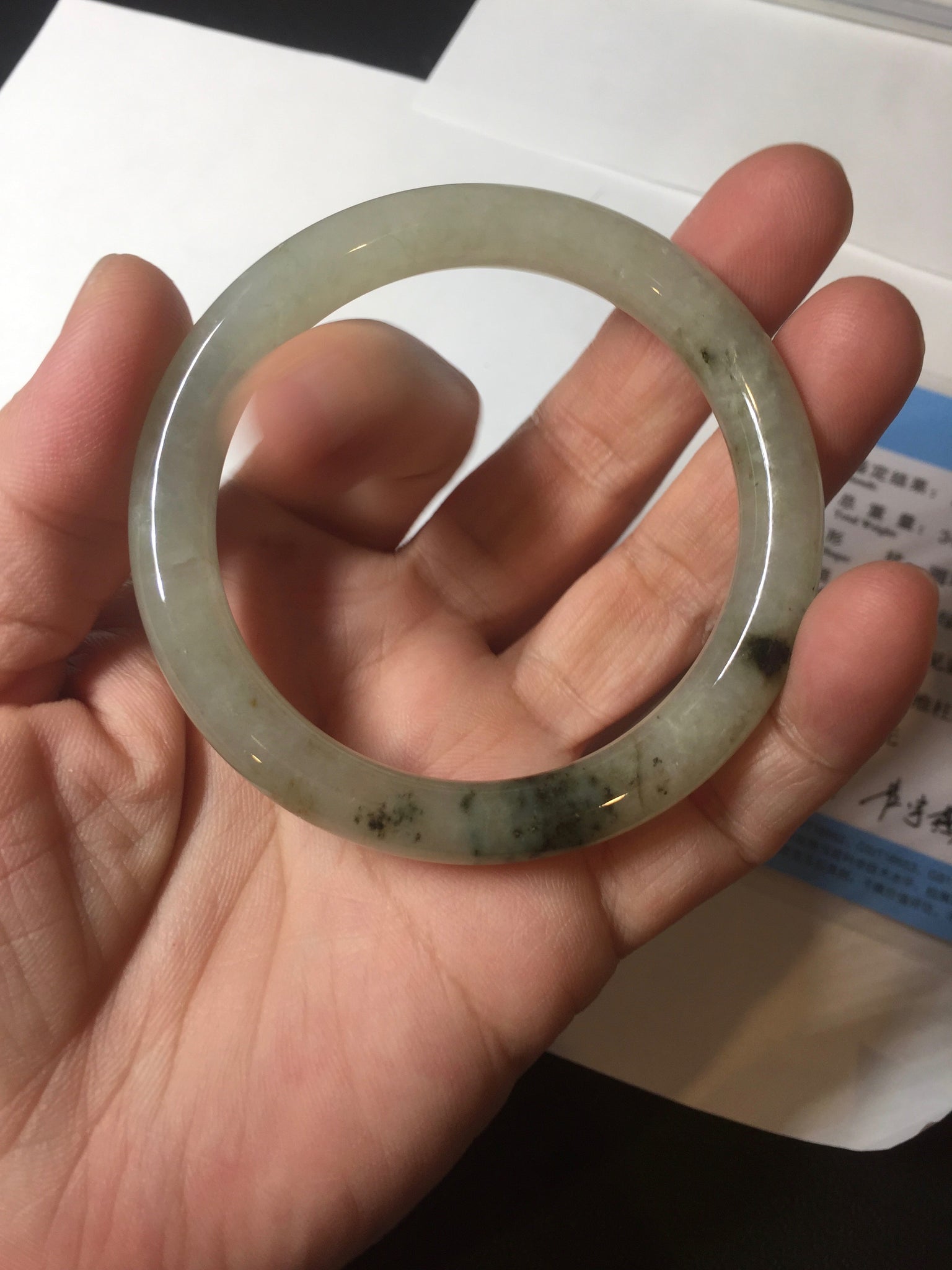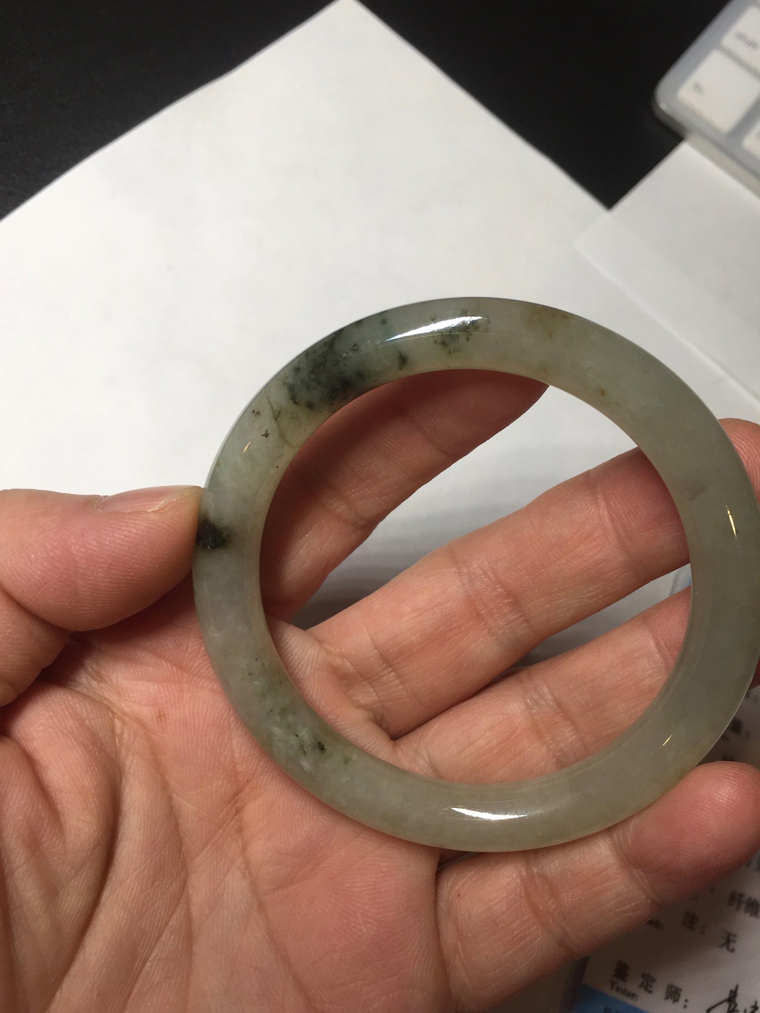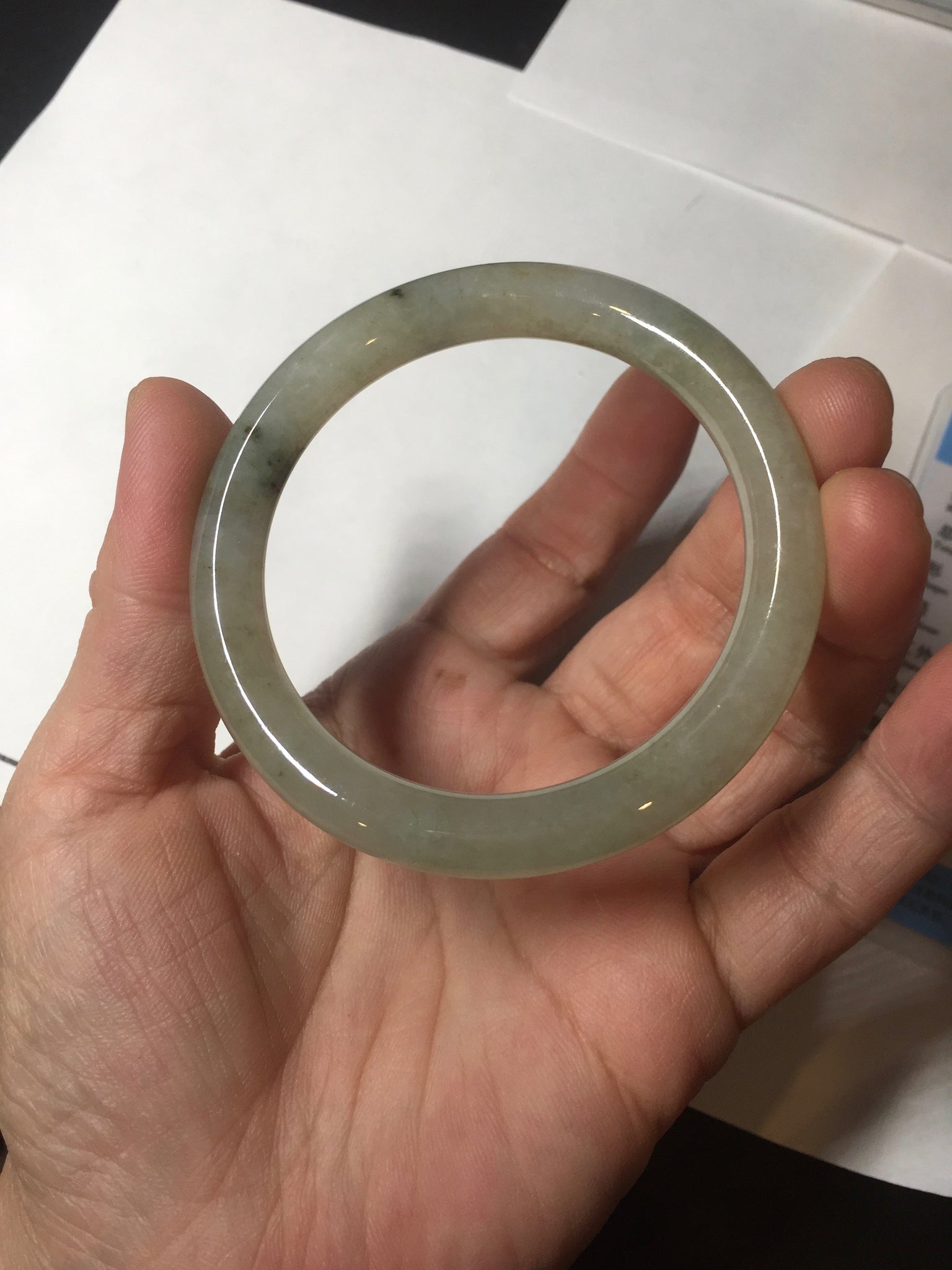 No crack. Some cotton lines and cotton areas. Some black dark green areas or spots wth not so smooth surface areas.
