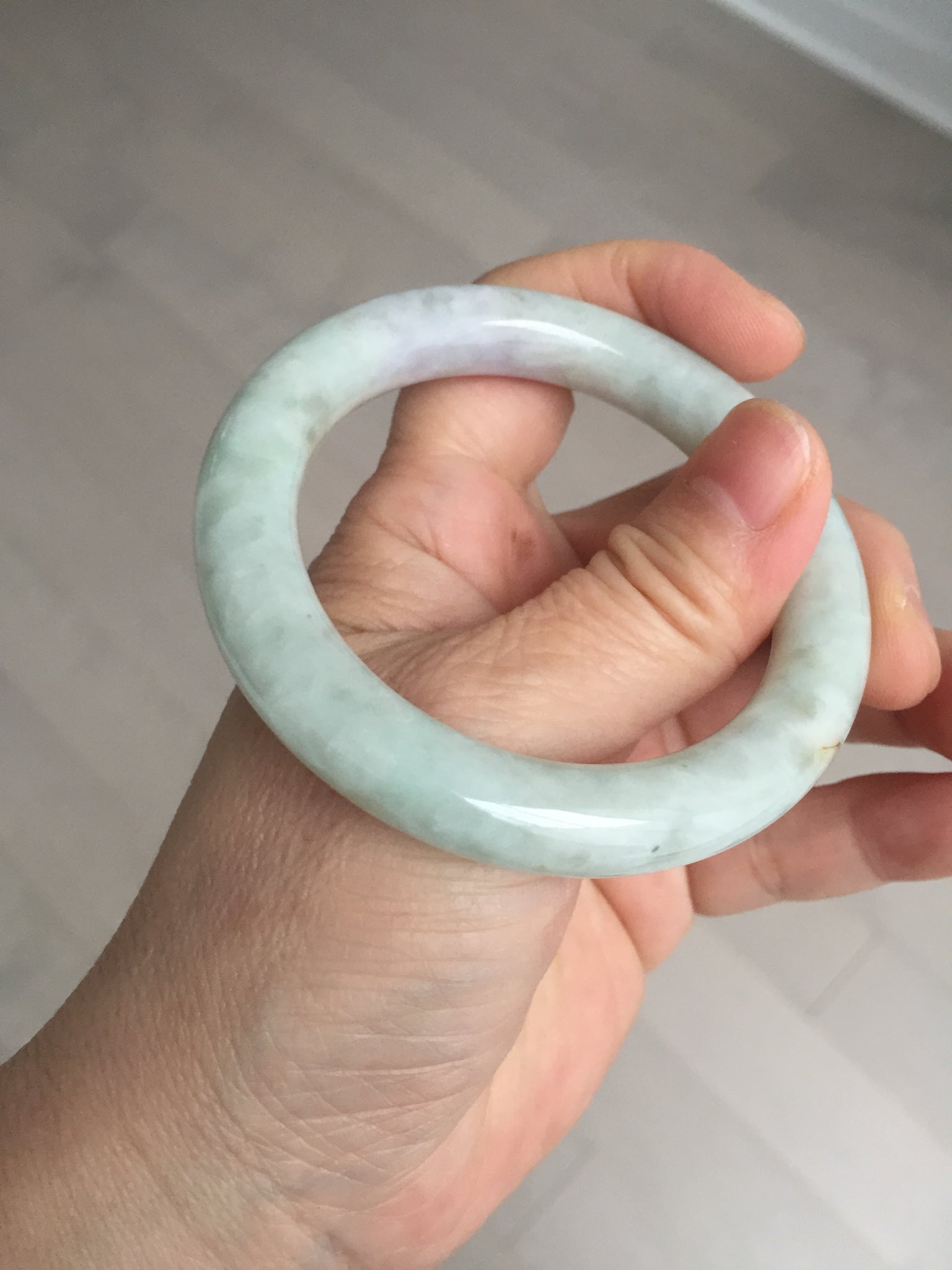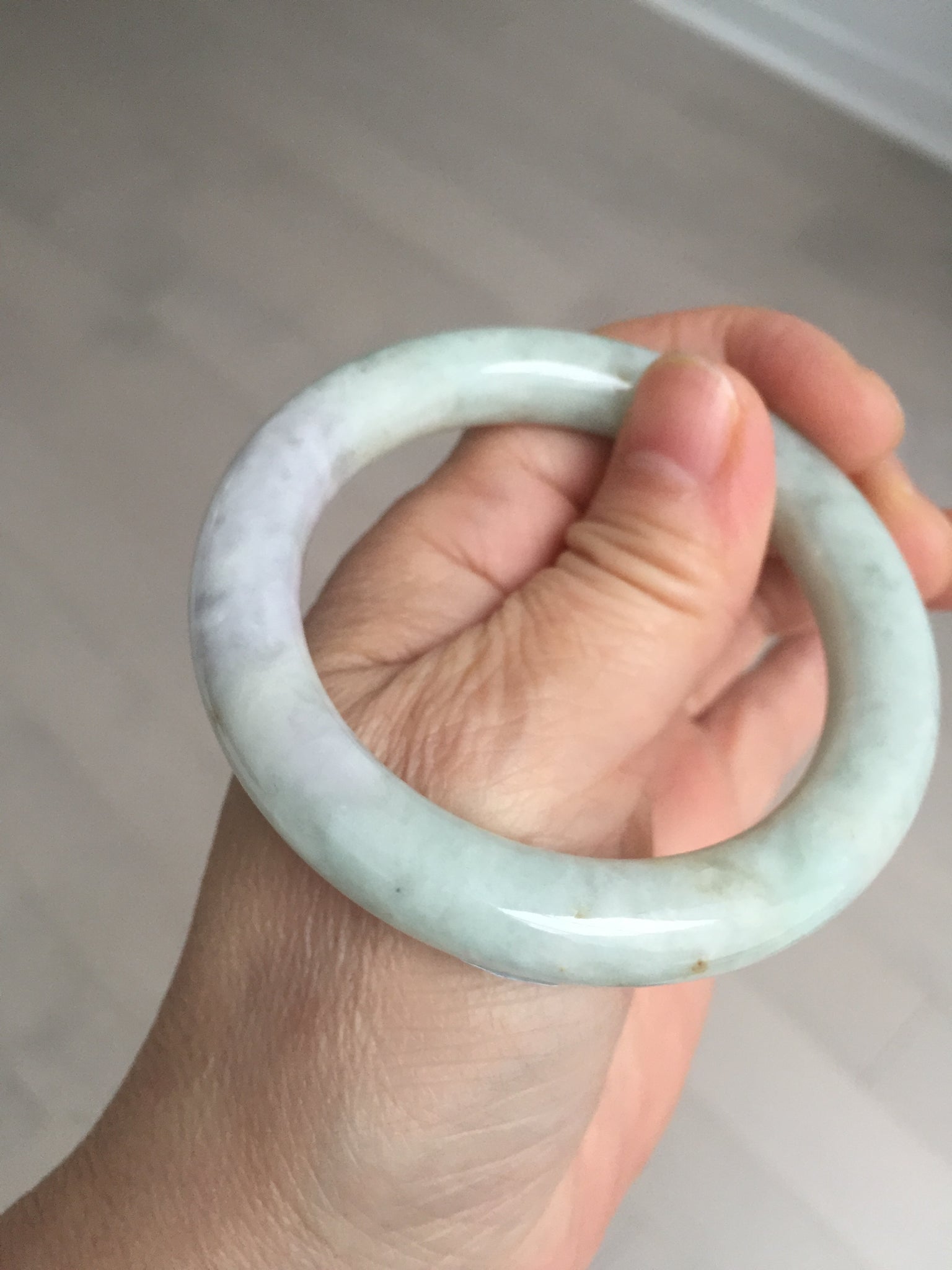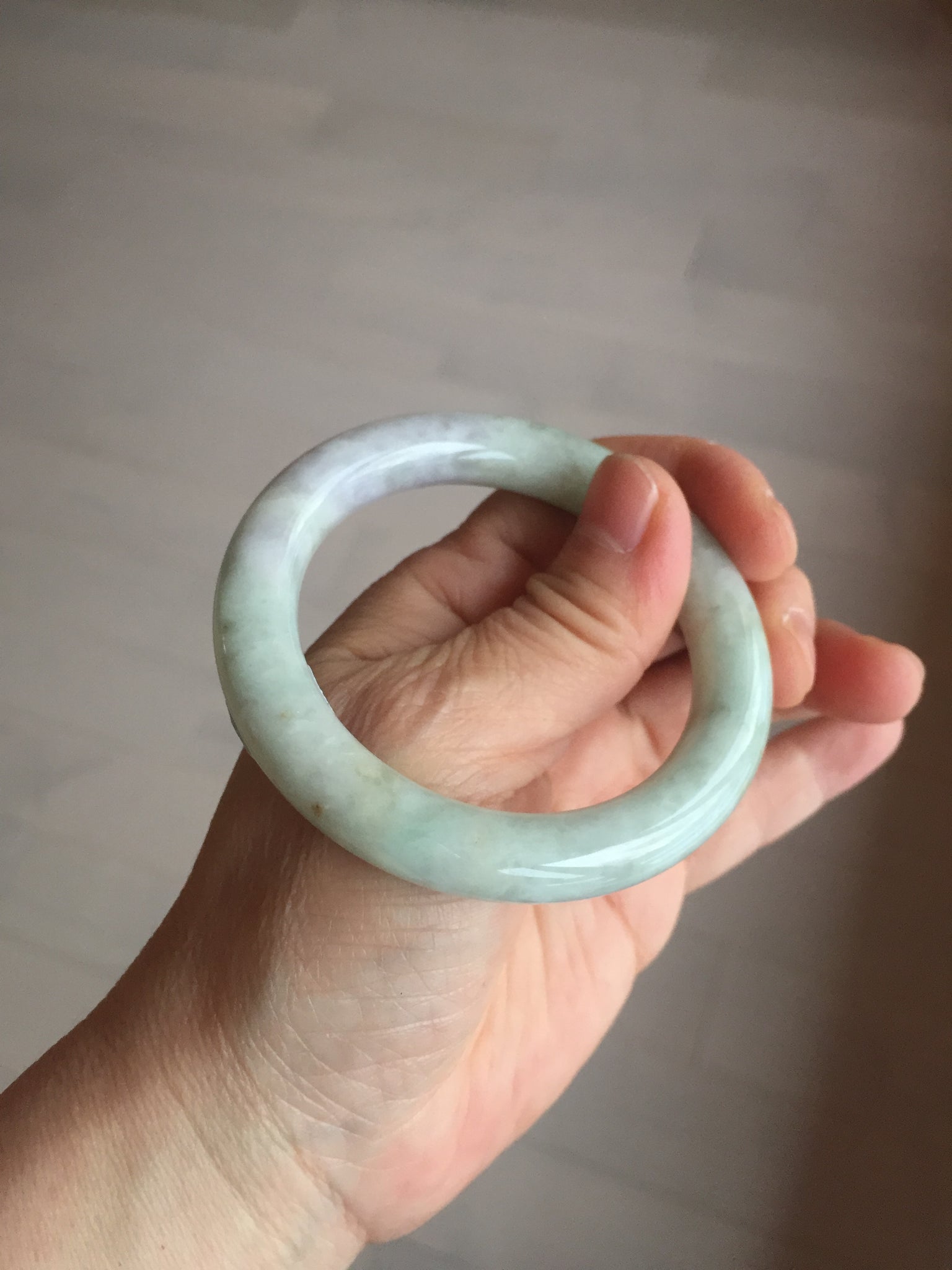 Two surface cracks and a small rough surface on the yellow jade. The texture is less fine. There are quite a lot of cotton areas and cotton lines. The bangle is not transparent. The purple is lighter than in the photos due to the purple color always being more camera-friendly.