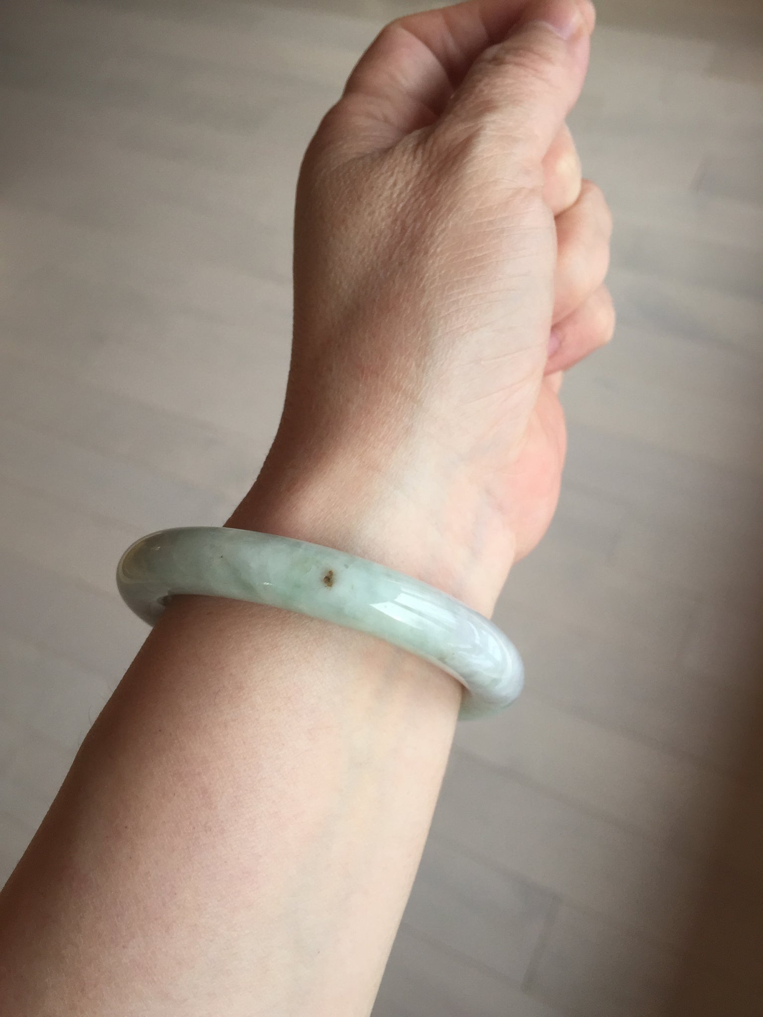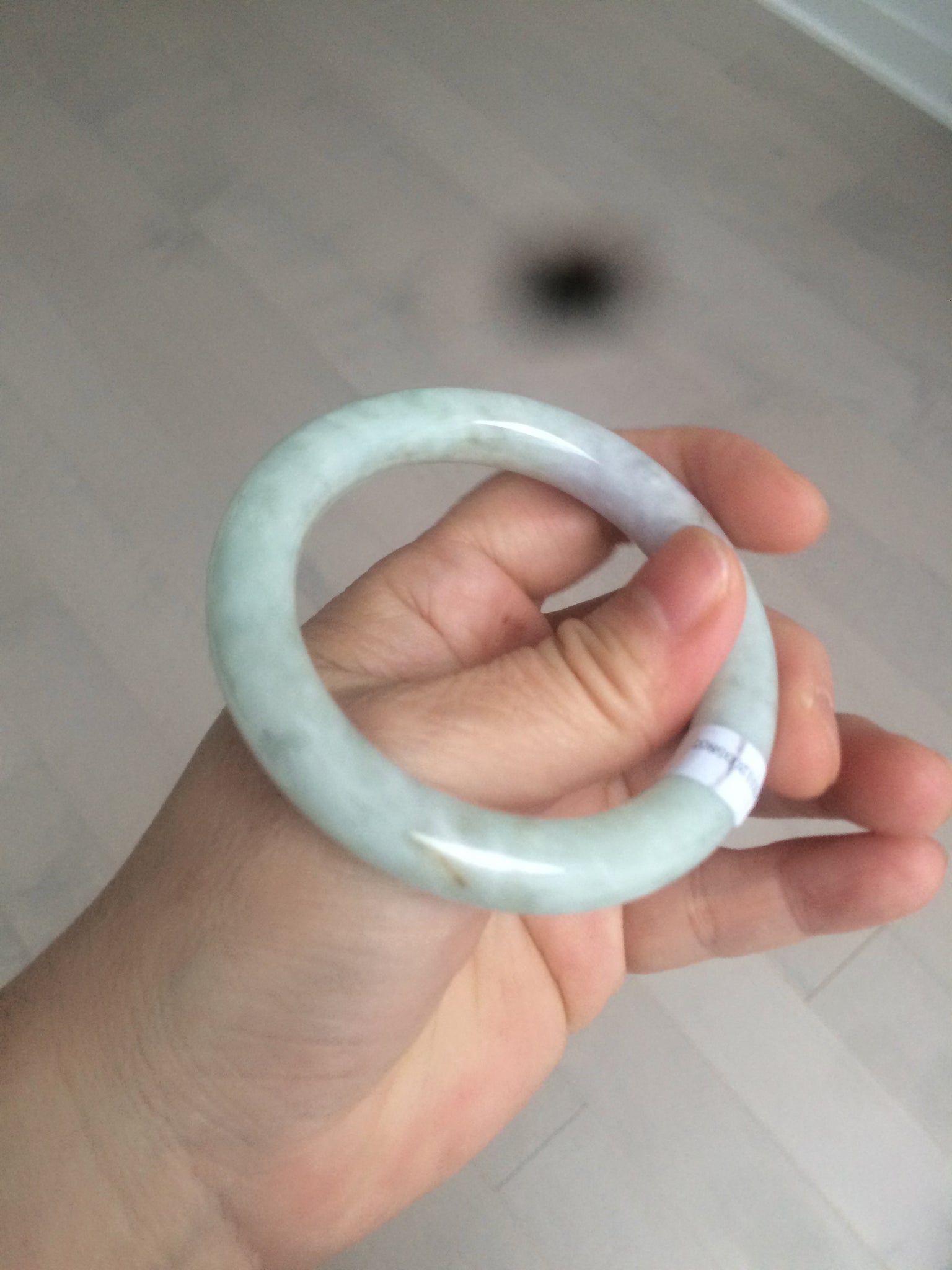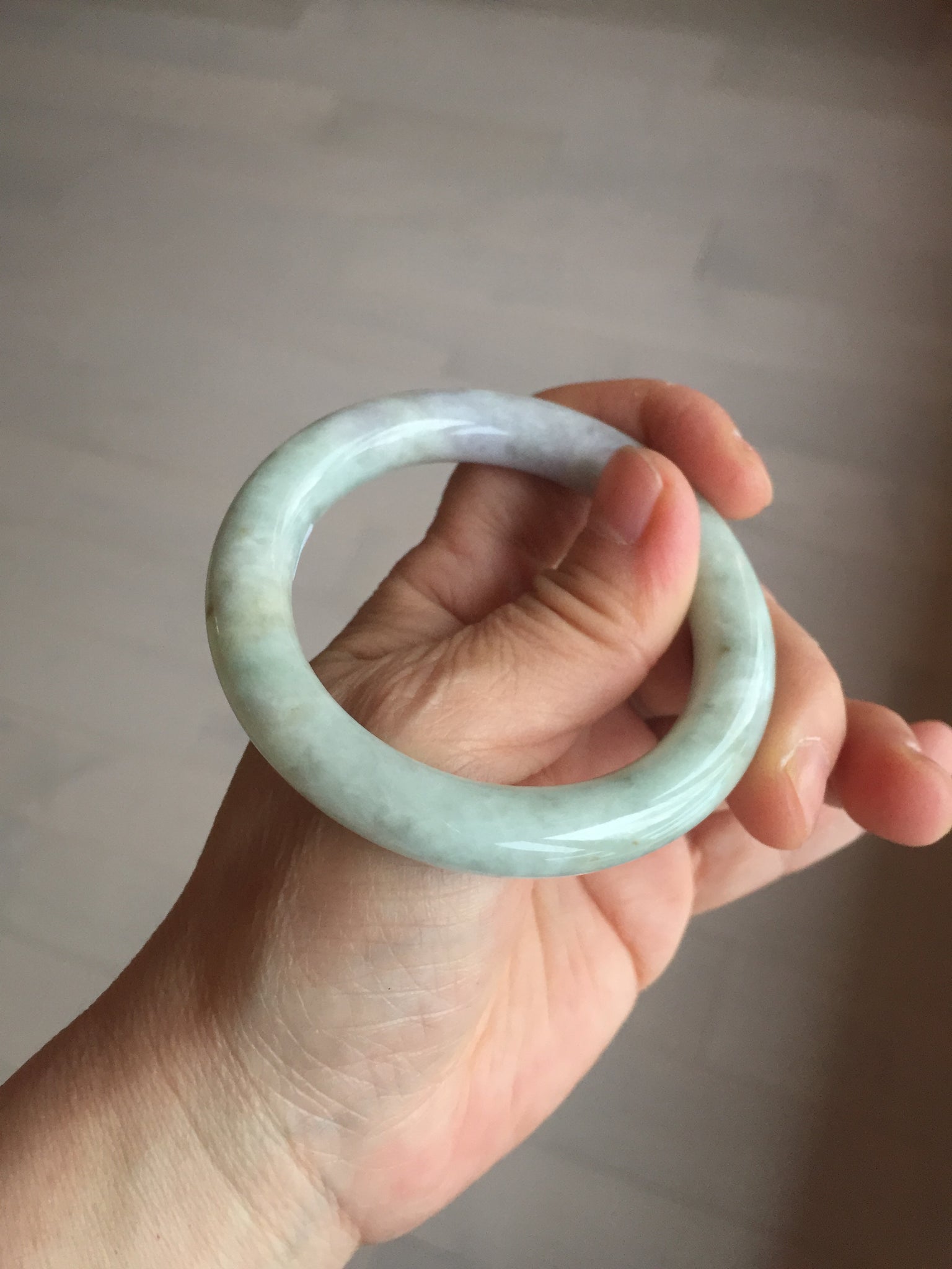Two surface cracks and a small rough surface on the yellow jade. The texture is less fine. There are quite a lot of cotton areas and cotton lines. The bangle is not transparent. The purple is lighter than in the photos due to the purple color always being more camera-friendly.