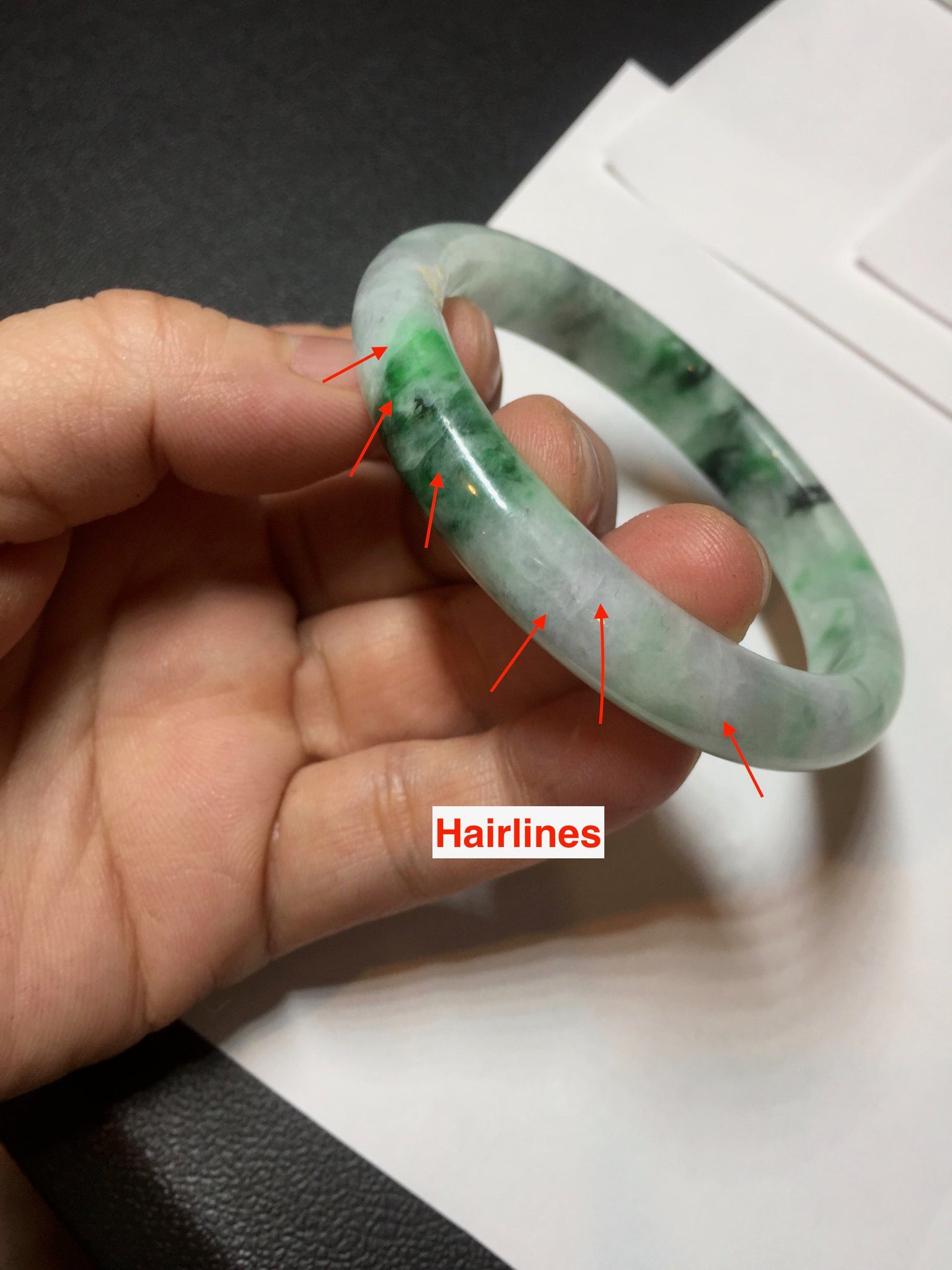No cracks. One notch due to the mineral impurity. Some hairline, cotton lines, cotton areas, and small rough surfaces. The purple is lighter than in the photos due to the purple color always being more camera-friendly.