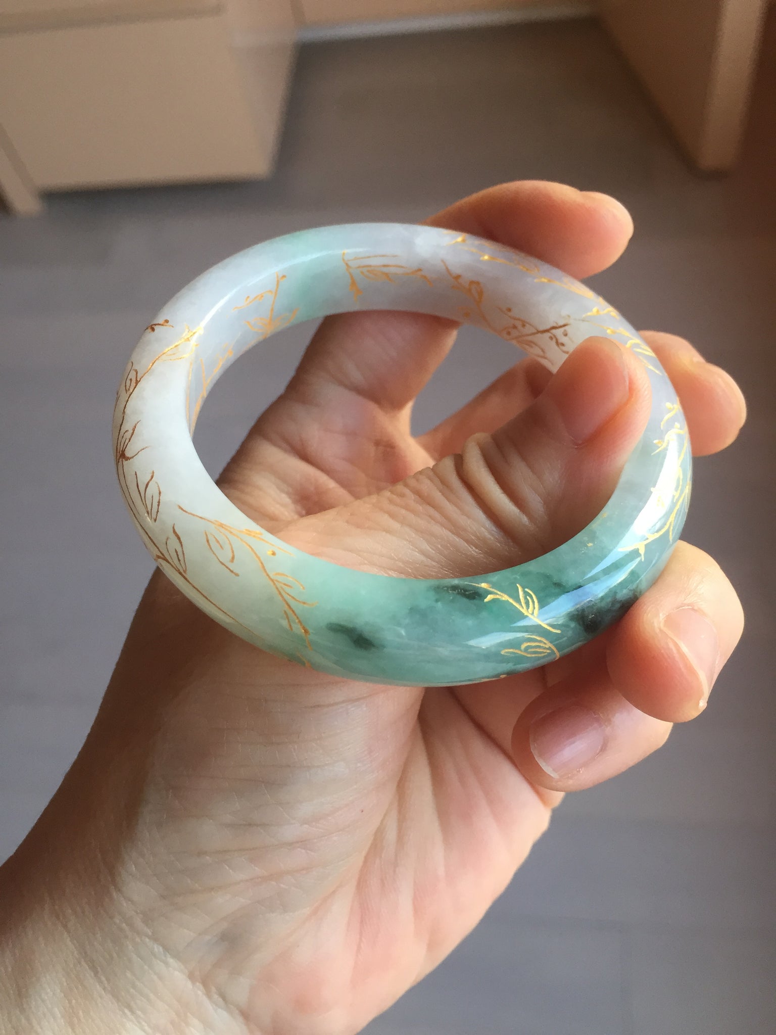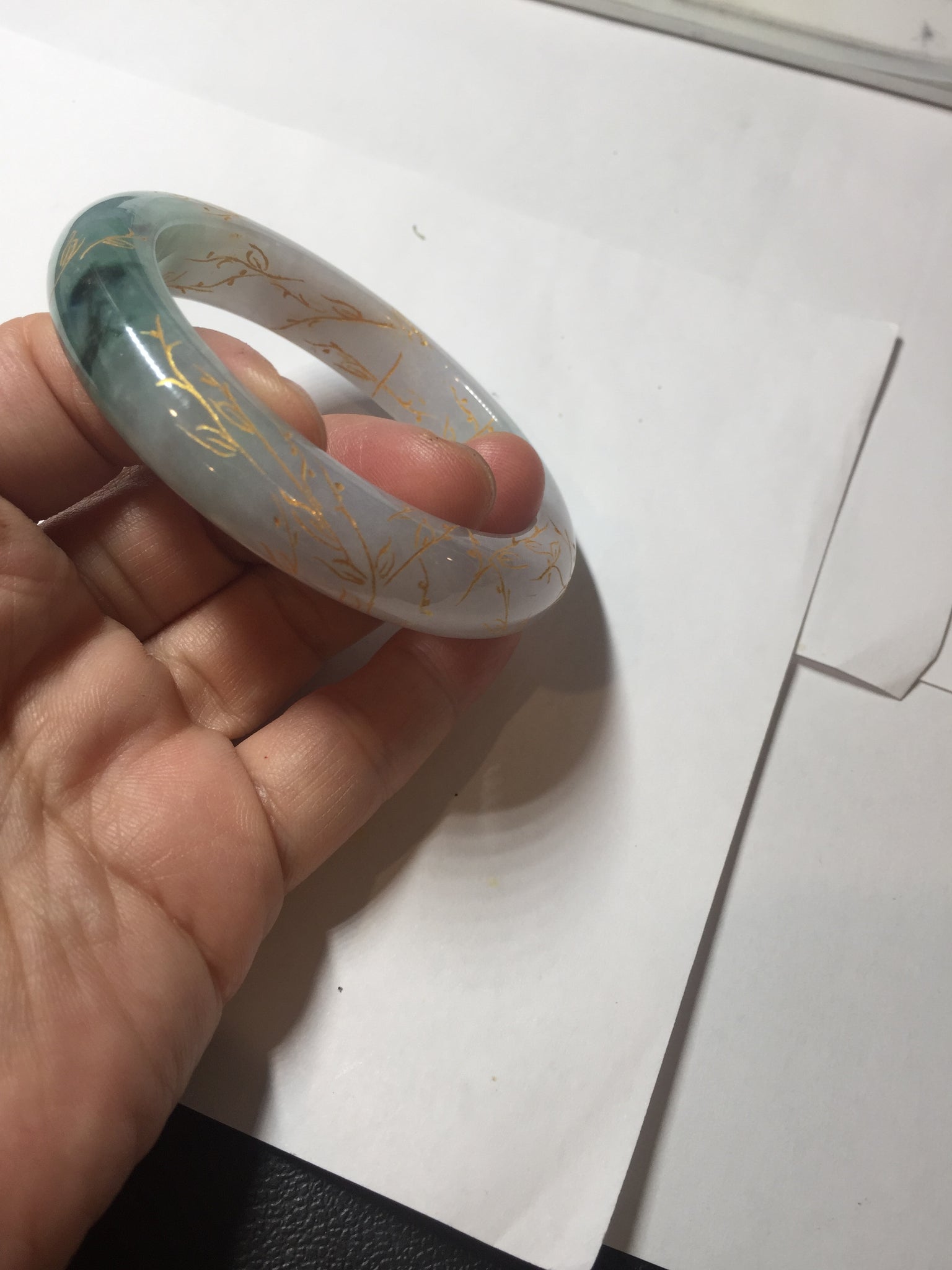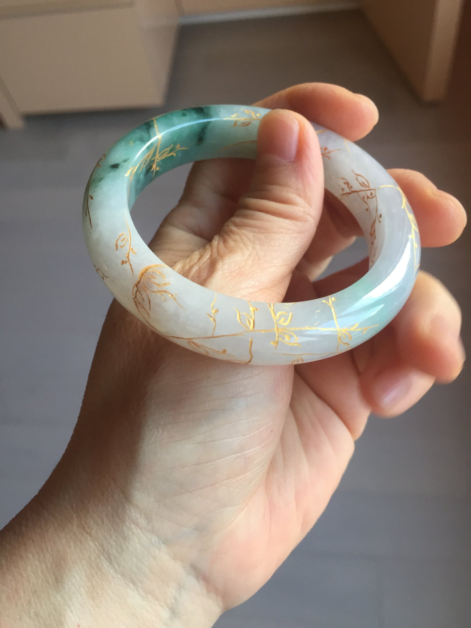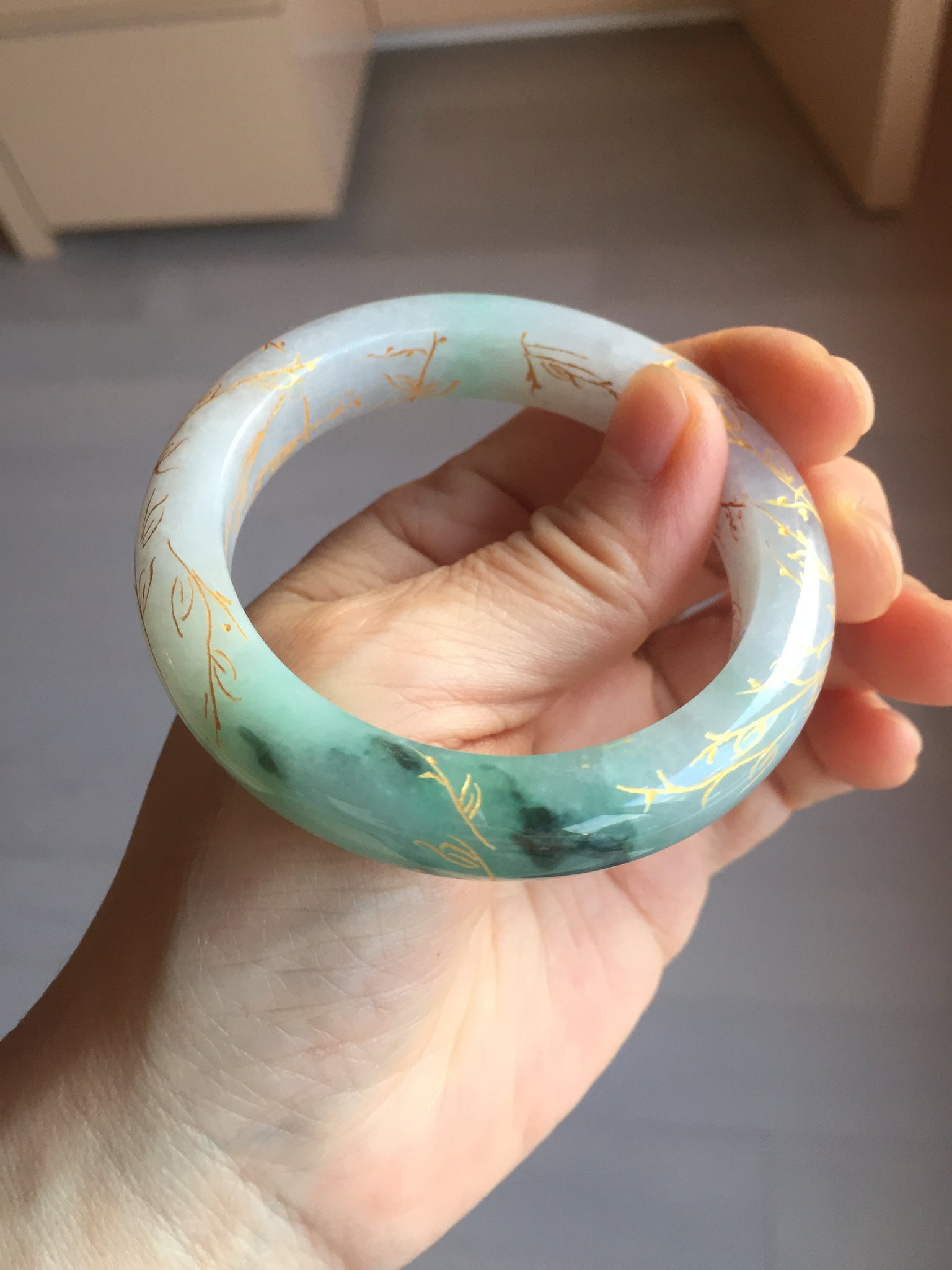May have some surface cracks or hairlines was carved off or covered by the carving. The bangle is firm(Guaranteed!). Some cotton spots, cotton lines, and cotton areas.