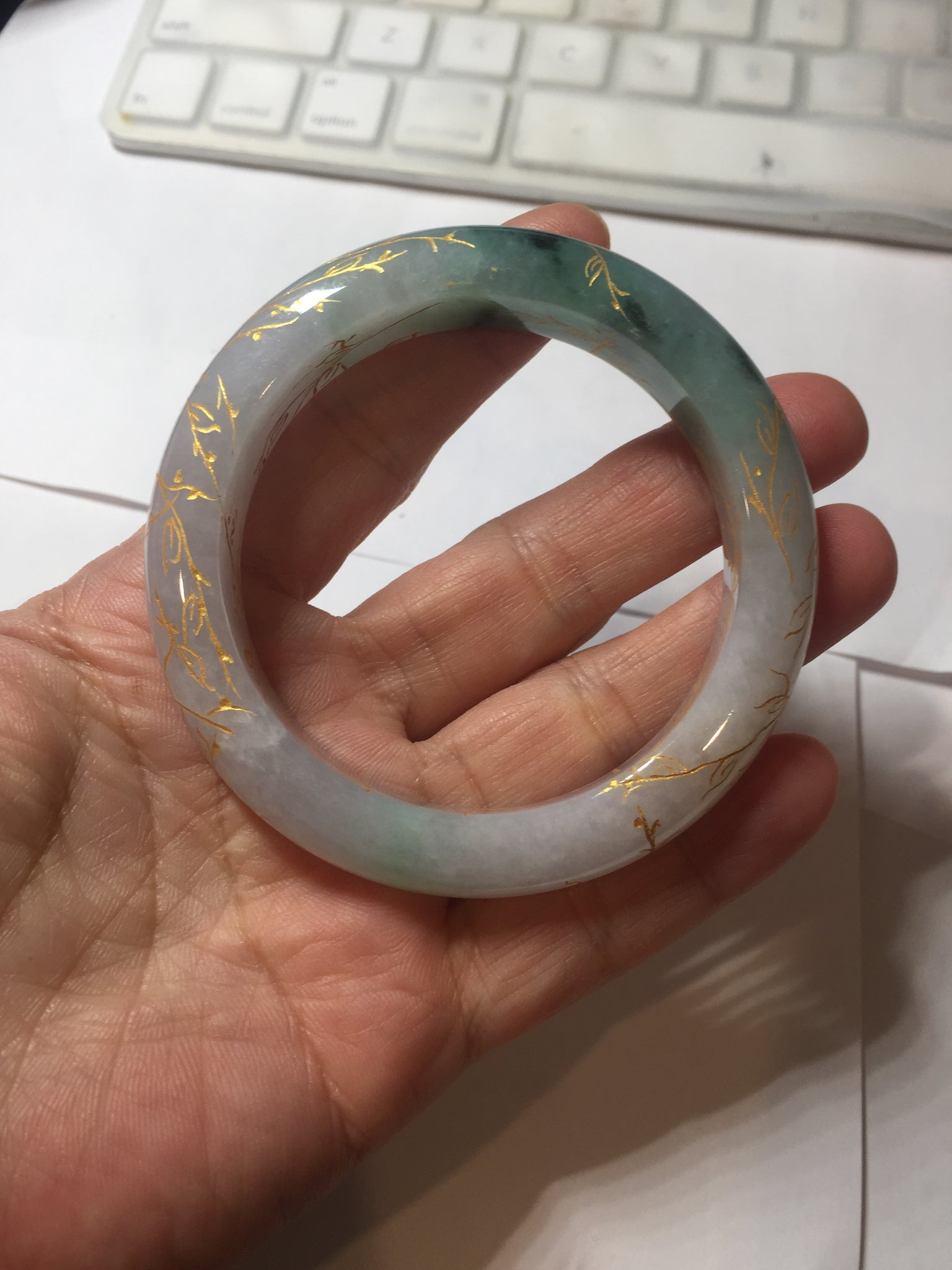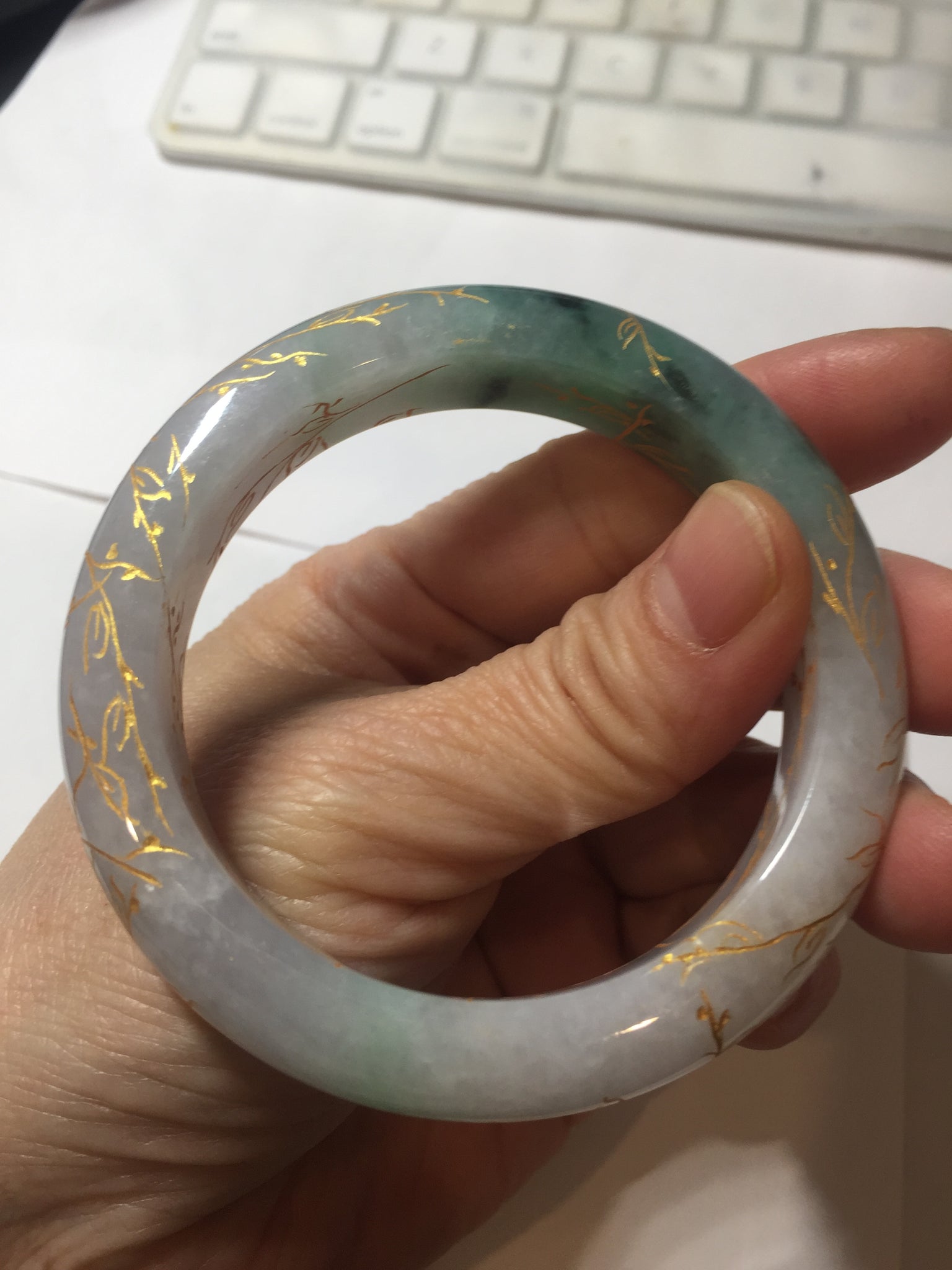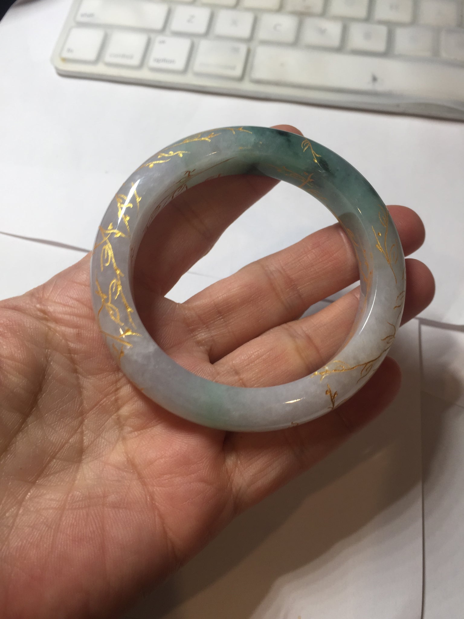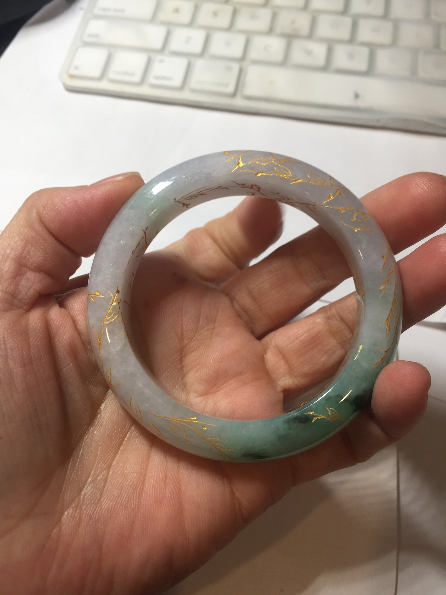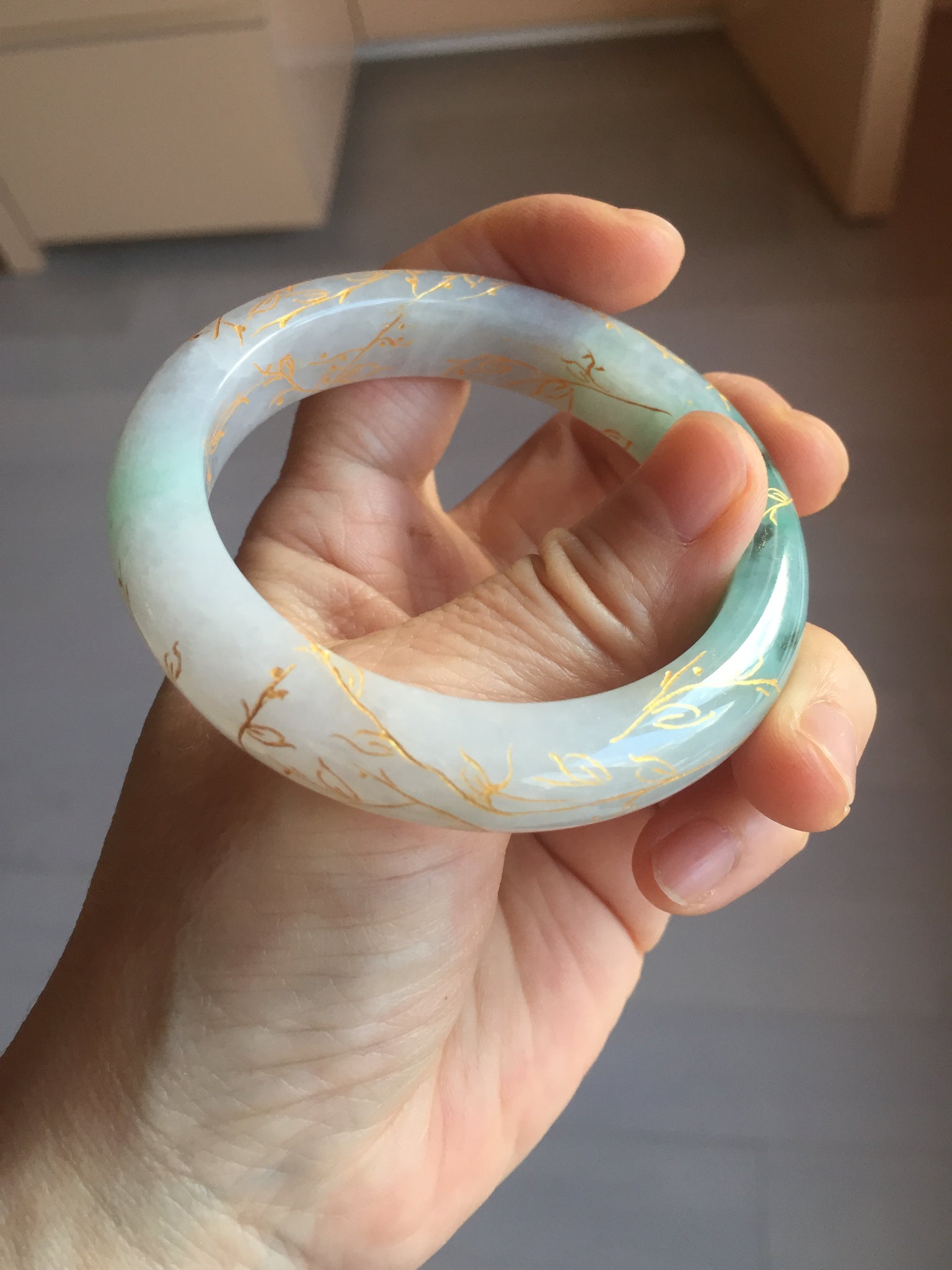 May have some surface cracks or hairlines was carved off or covered by the carving. The bangle is firm(Guaranteed!). Some cotton spots, cotton lines, and cotton areas.