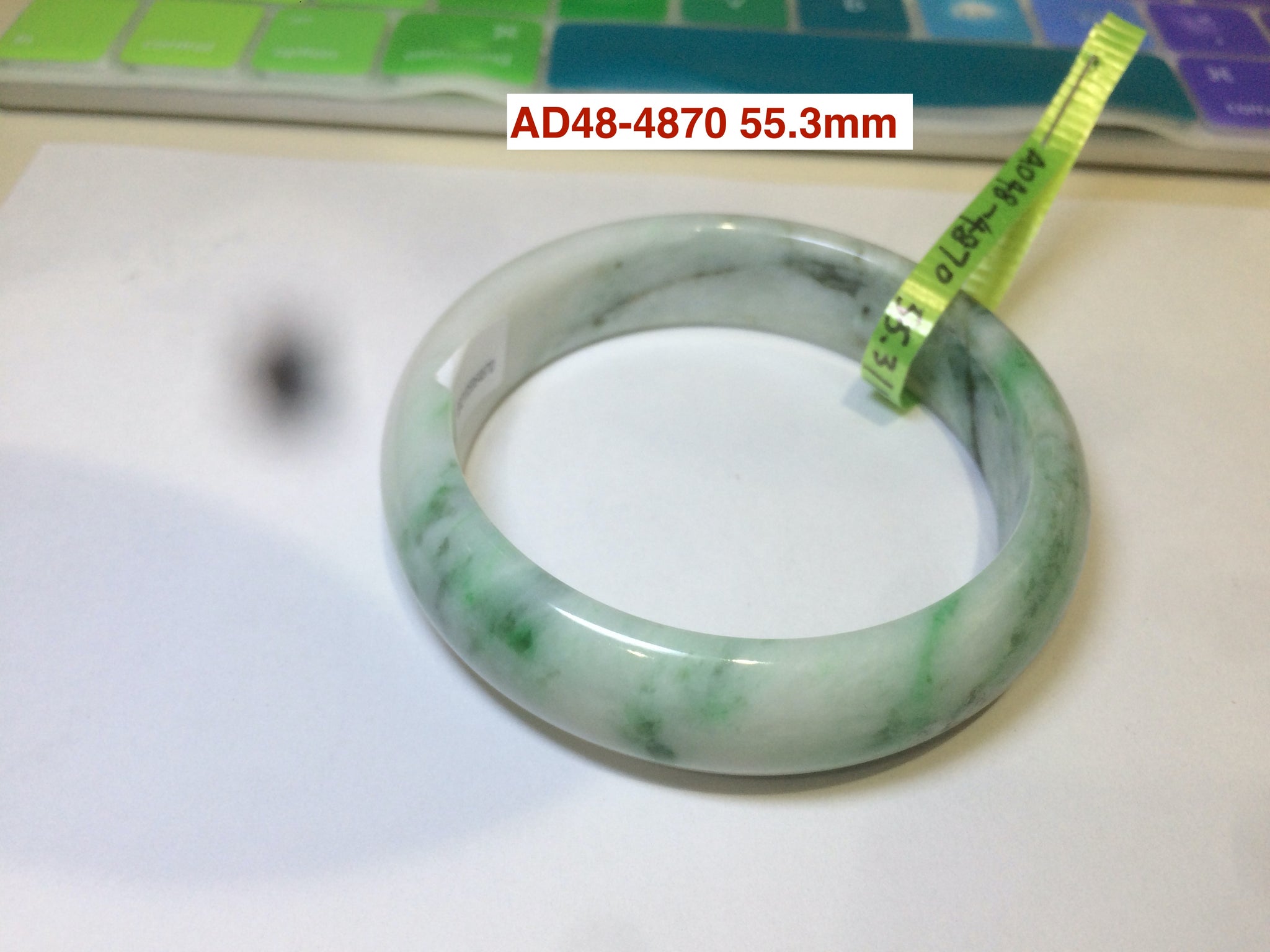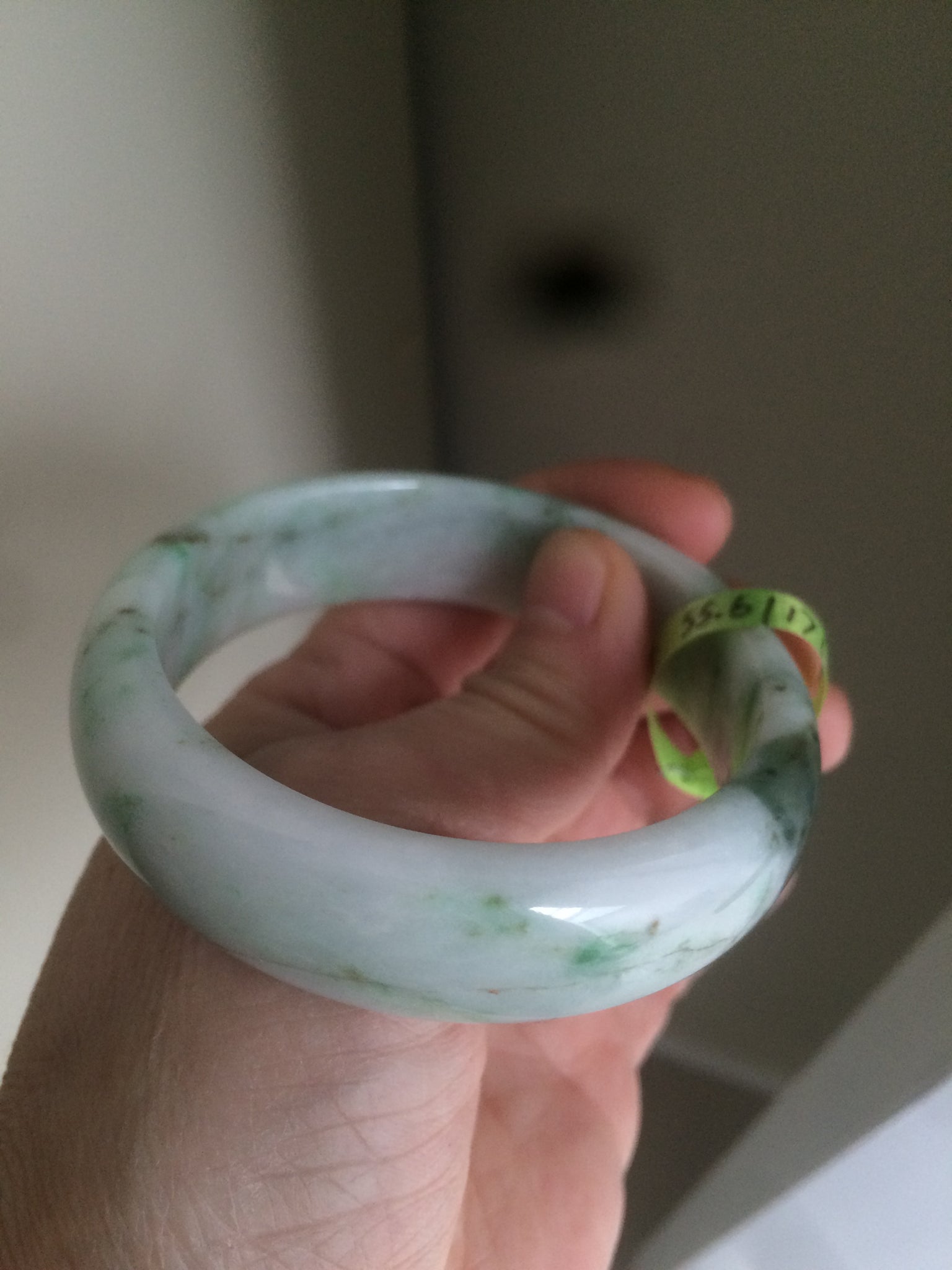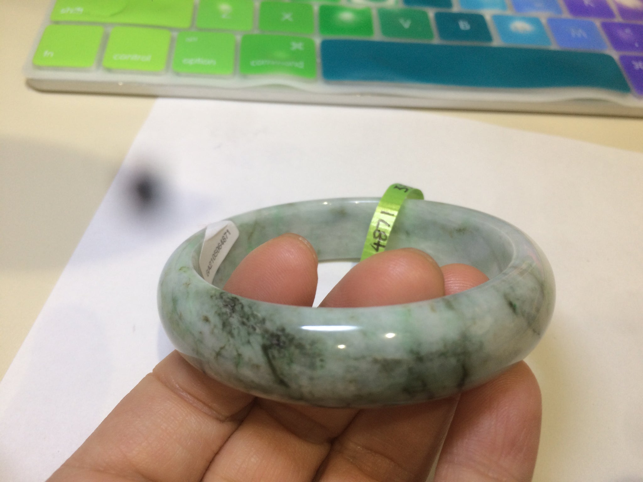 Jadeite Jade Bangles in a variety of sizes. With this low price, they all have big defects (cracks, hairlines, mine pits, dark spots, black areas). But all of them are really firm. Makes a high-pitched sound when clicked. All purple is really light, lighter than the photos.