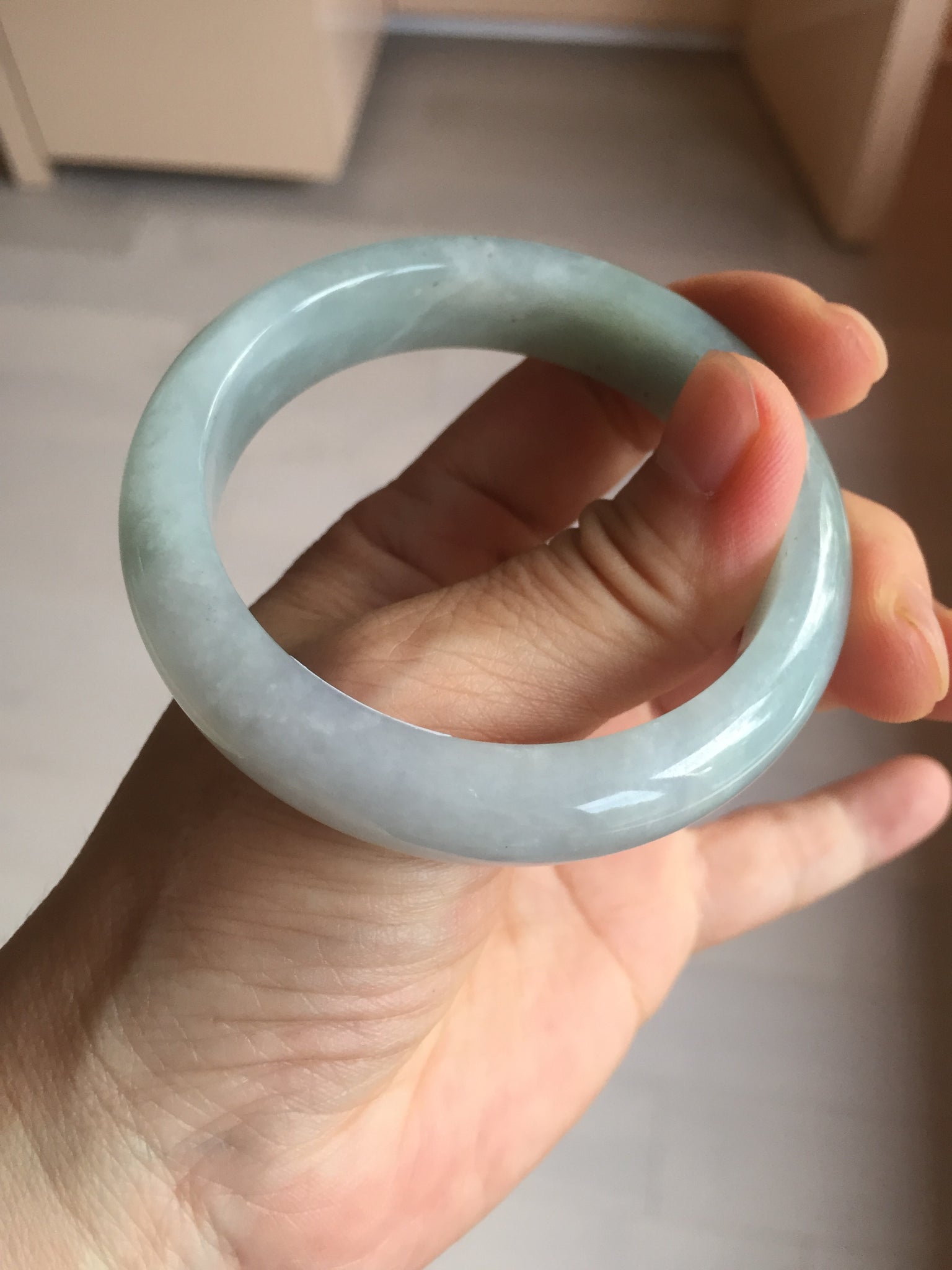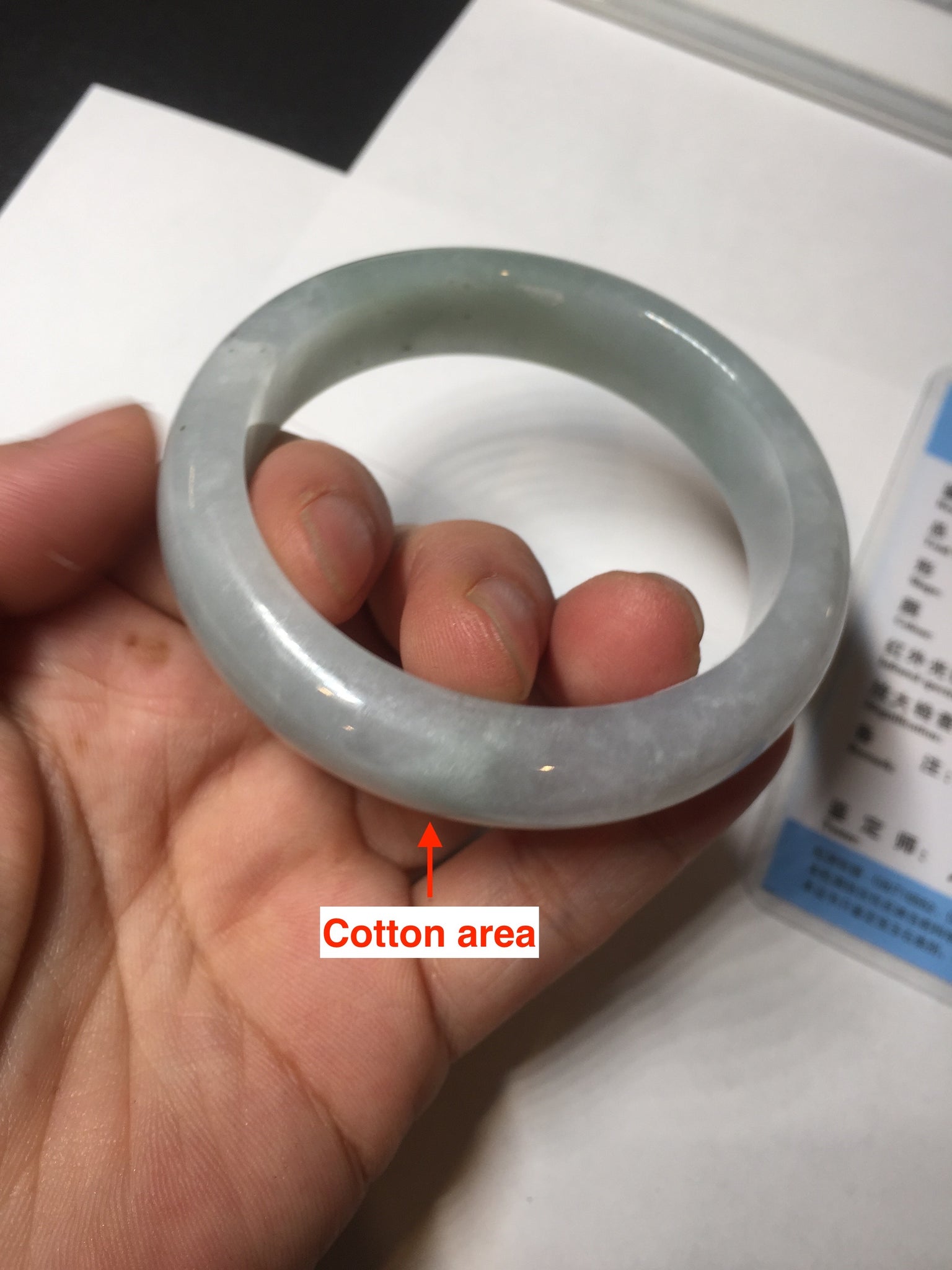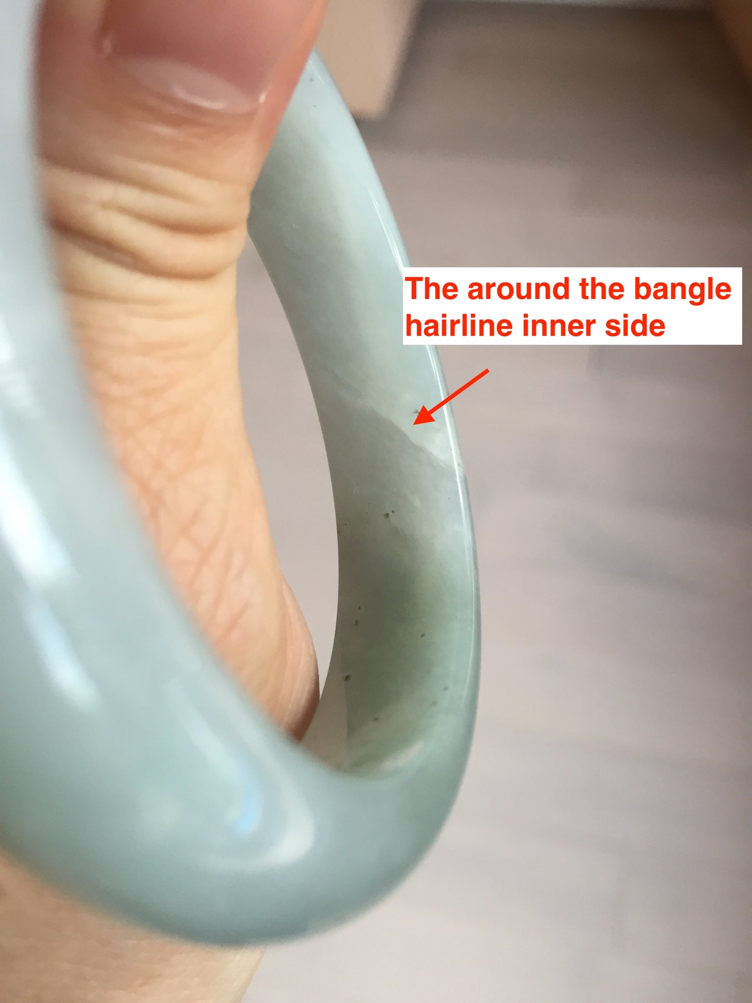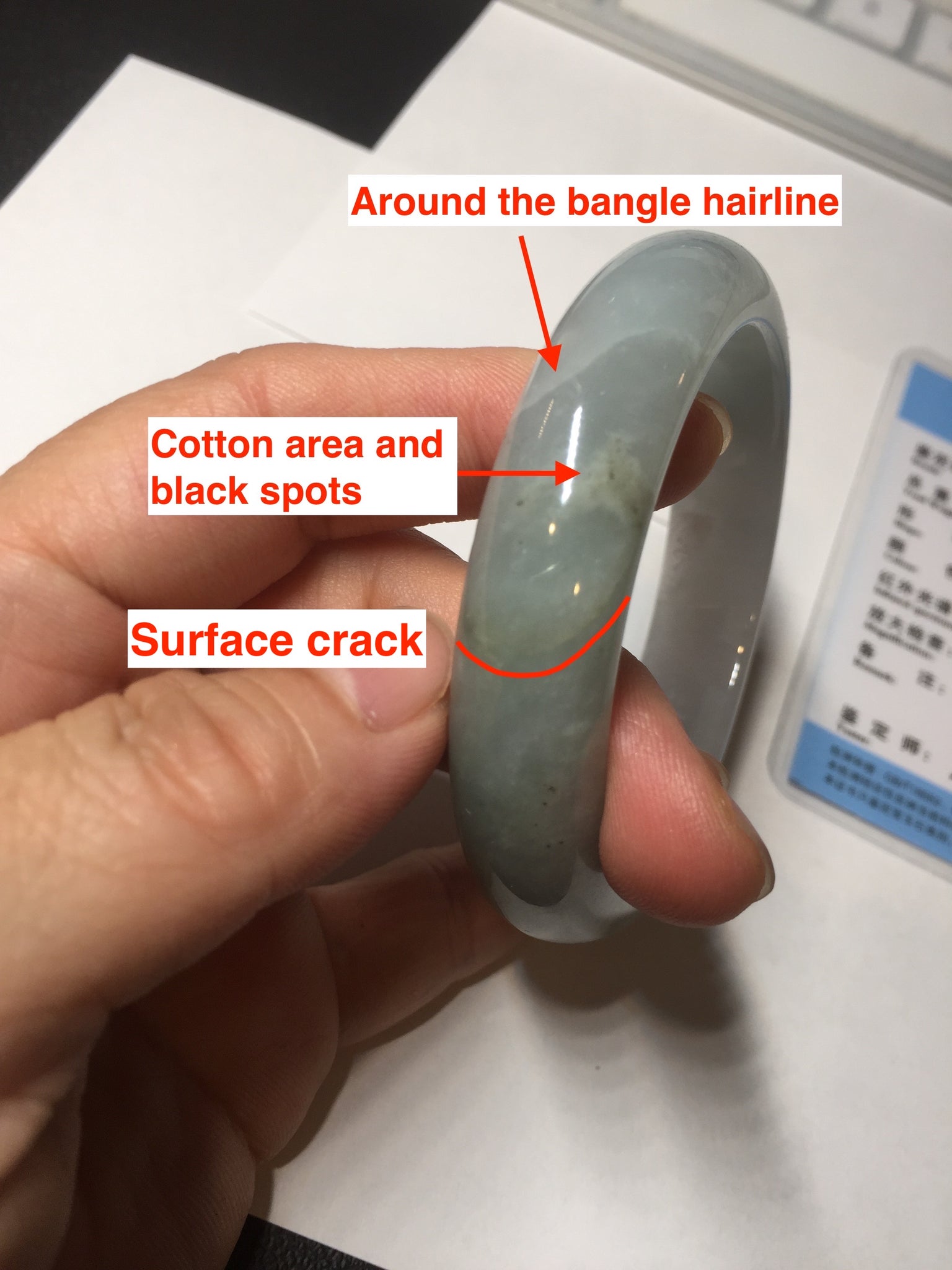One crack. Some hairlines and one of them goes around the bangle. The hairlines won't influence the firmness of the bangle. Some cotton lines, areas, spots, and brown/ black spots. The purple is super light and way lighter than in the photos due to the purple color always being more camera-friendly.