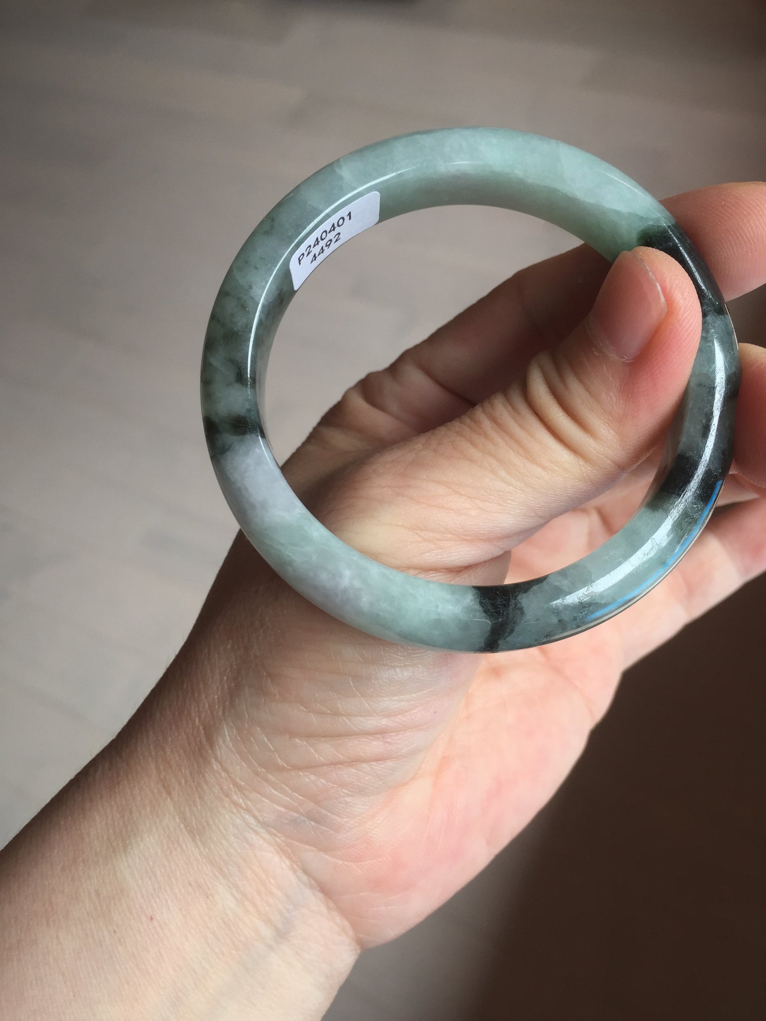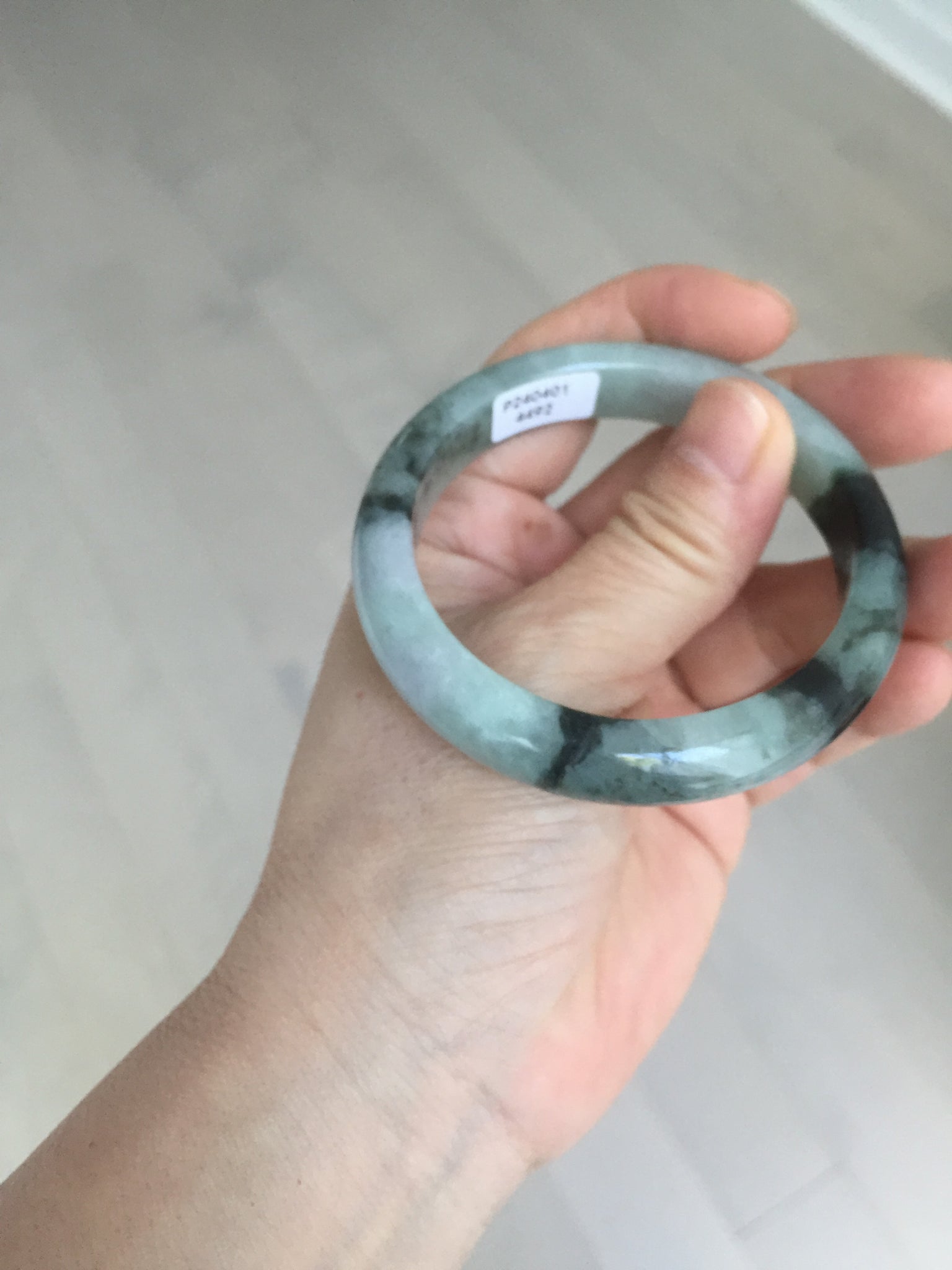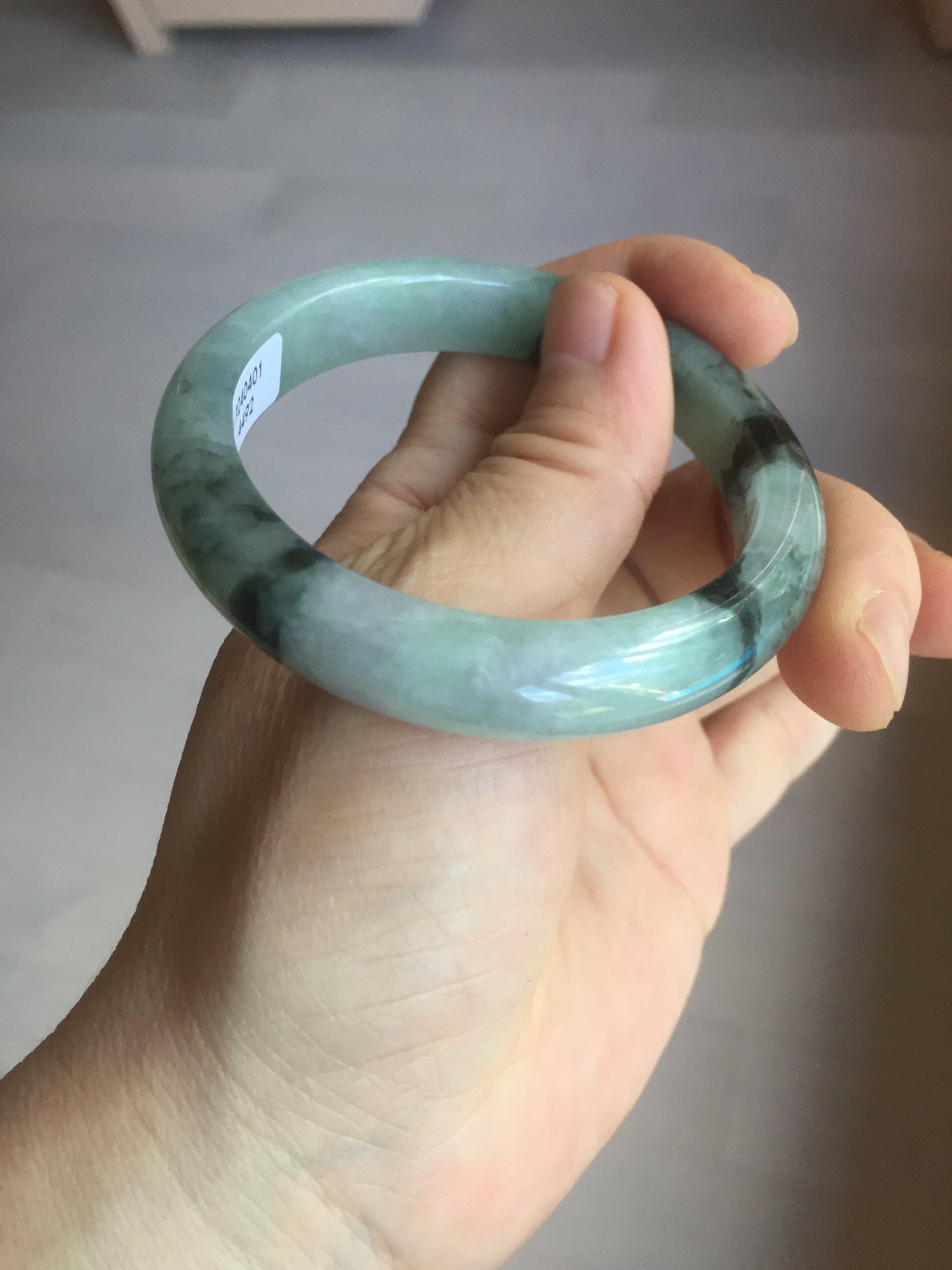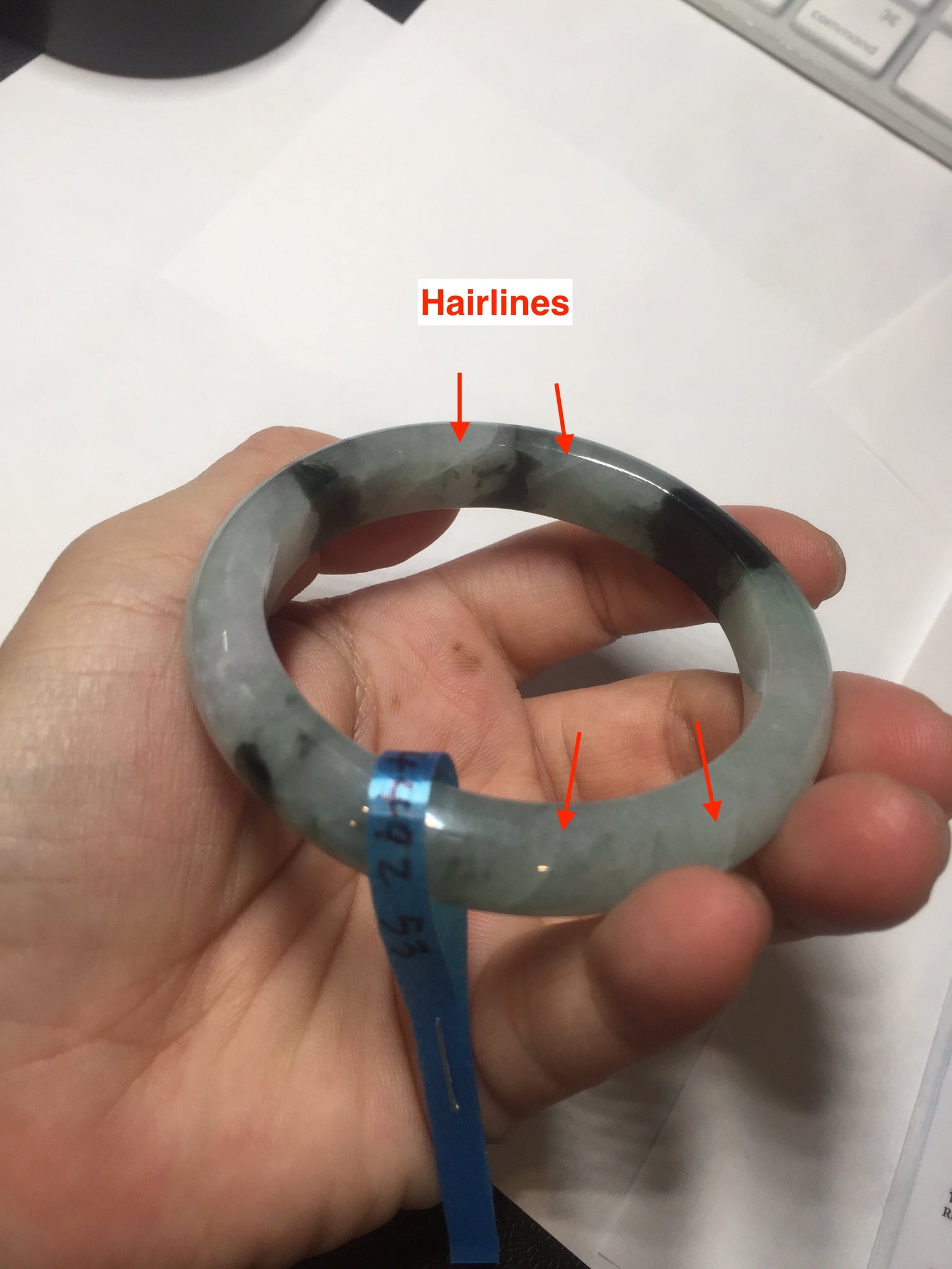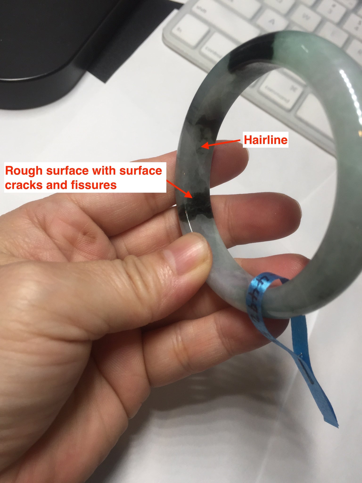 Some small rough surfaces with surface cracks and fissures. The bangle is solid (Guaranteed!). Some hairlines (at least 10 hairlines). Some hairlines may rest on rough surfaces, but they are not cracks.  Some cotton lines and cotton areas.