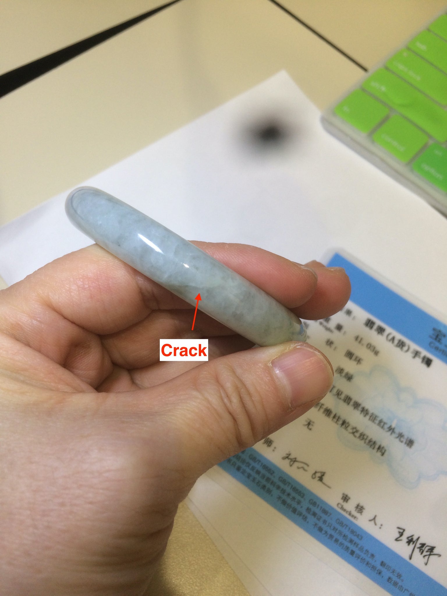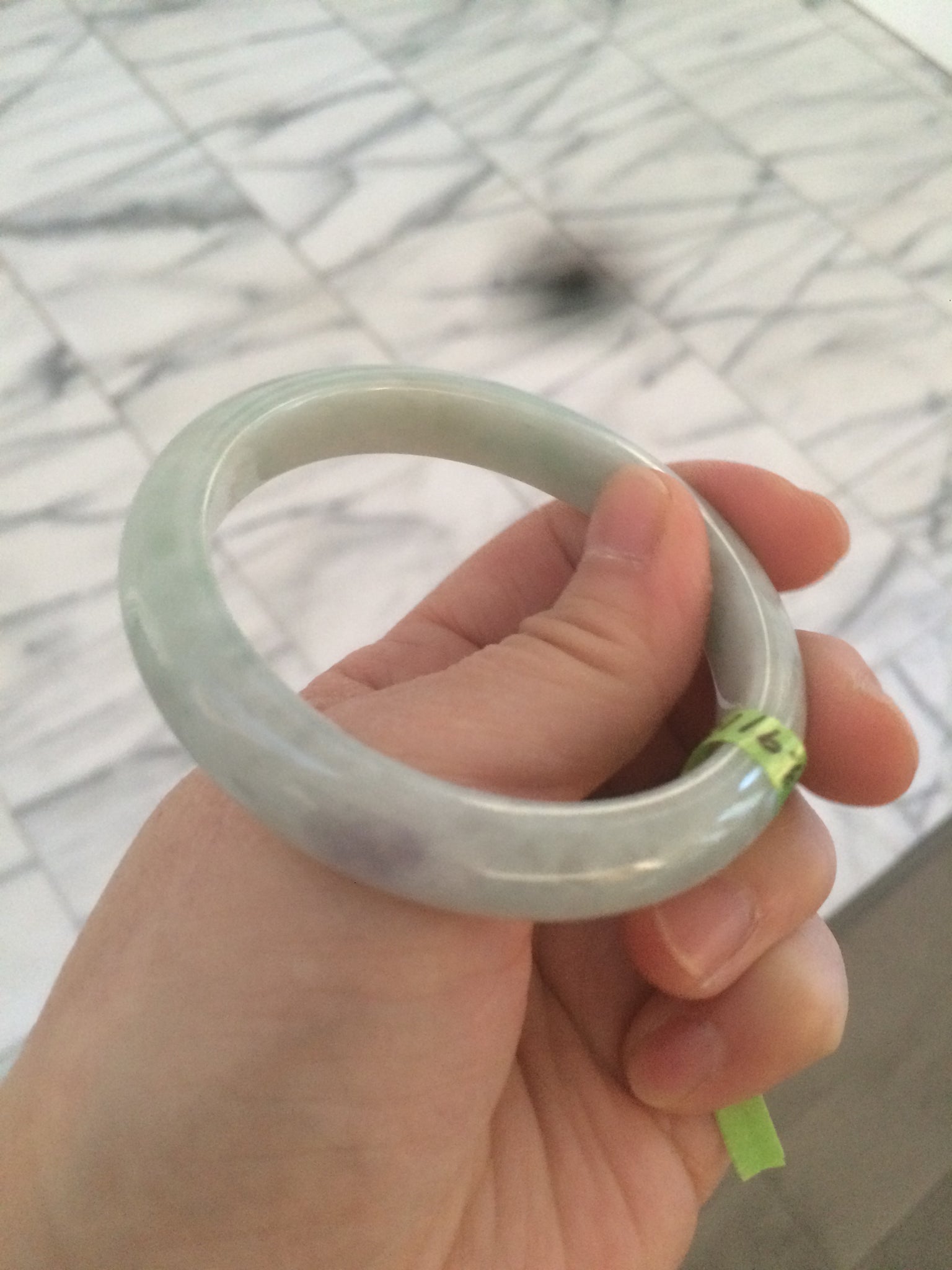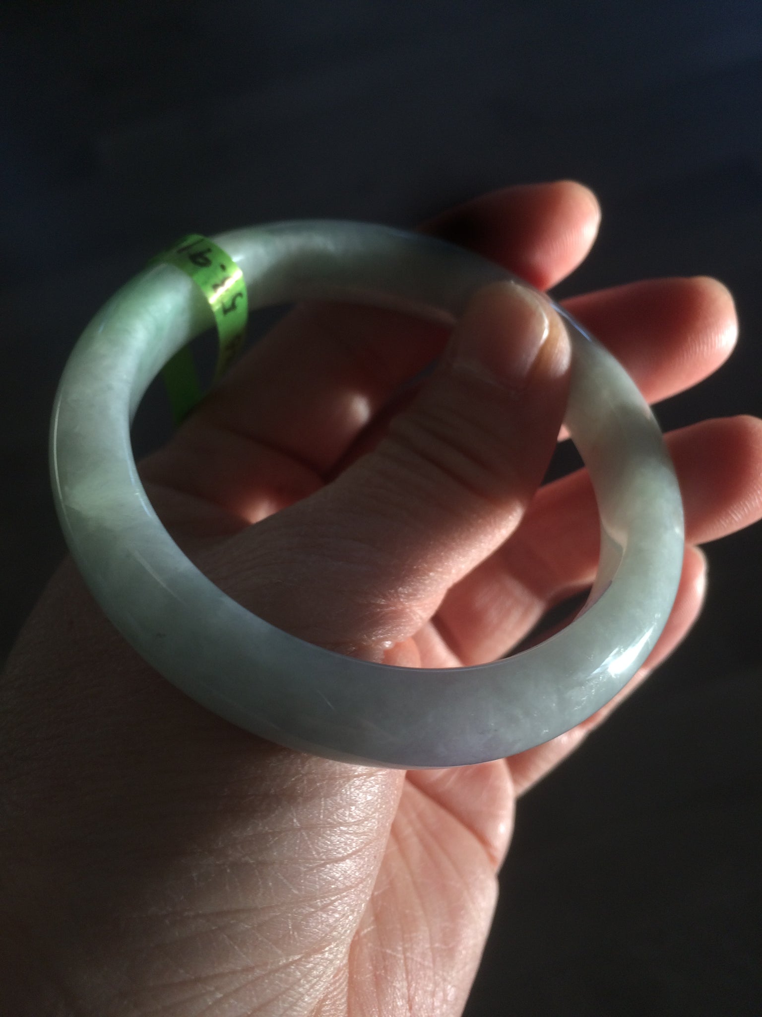 2 cracks with wax residue. One is around the bangle crack. This may decrease the firmness of the bangle. Tight fit is not recommended. One hairline. The texture is not so fine. You can see a lot of jade structures. The purple is extremely light. Lighter than photos.