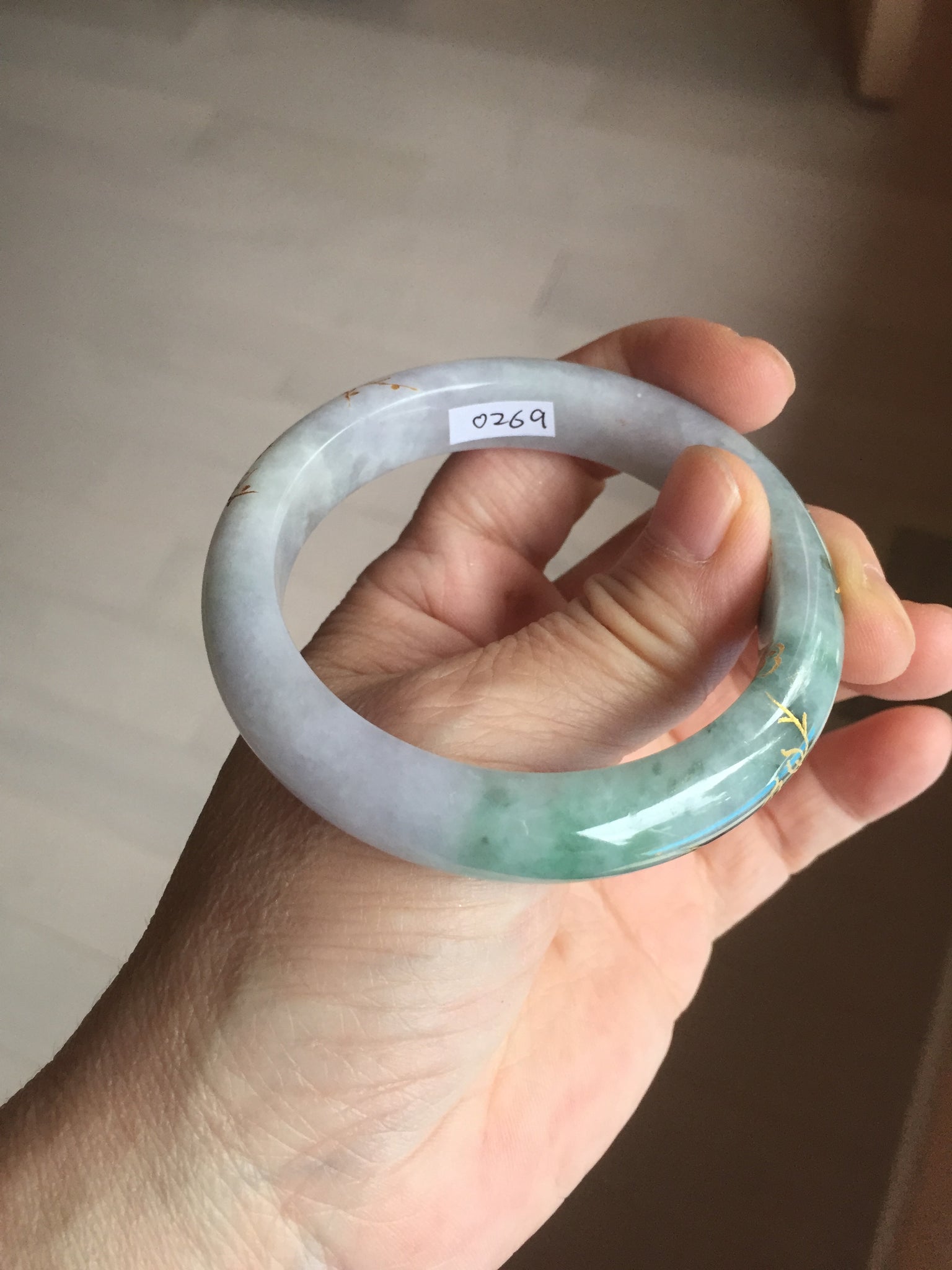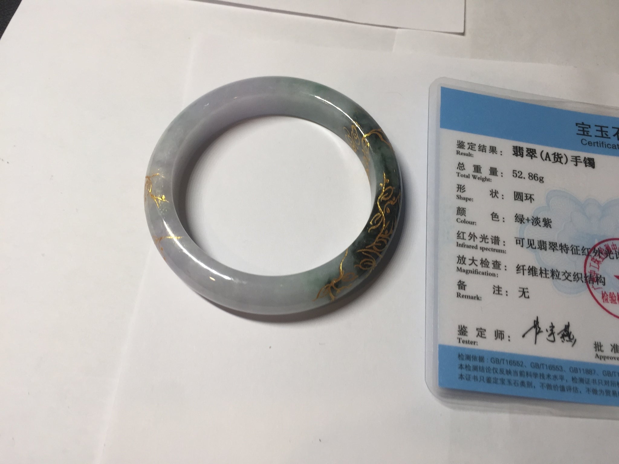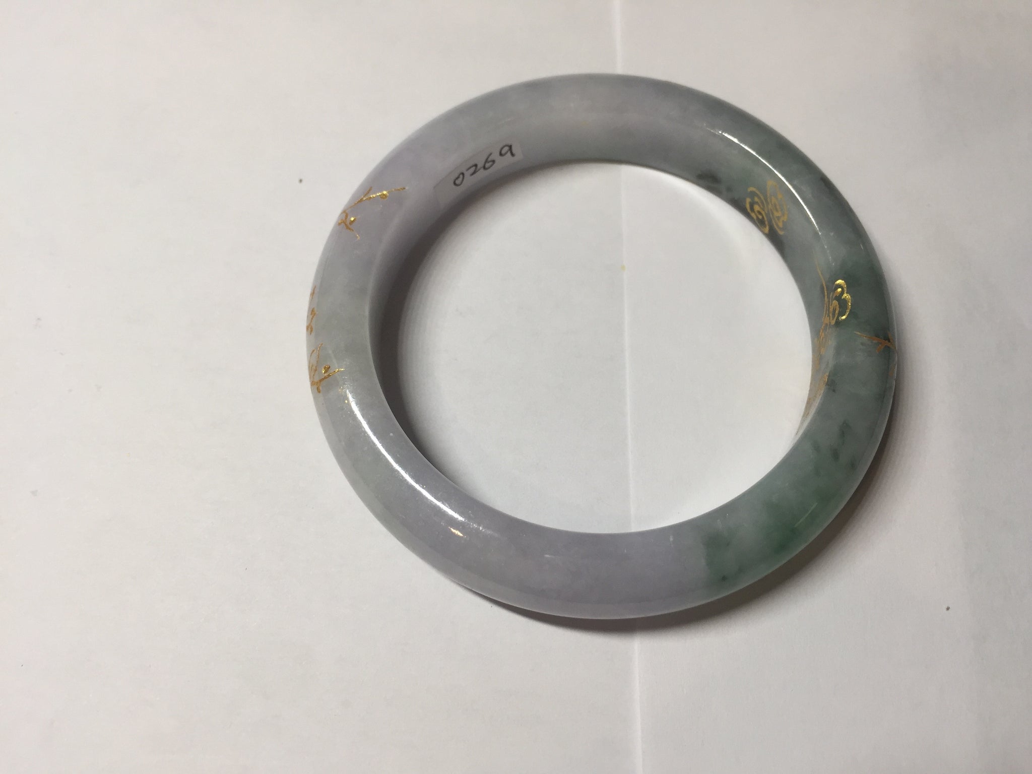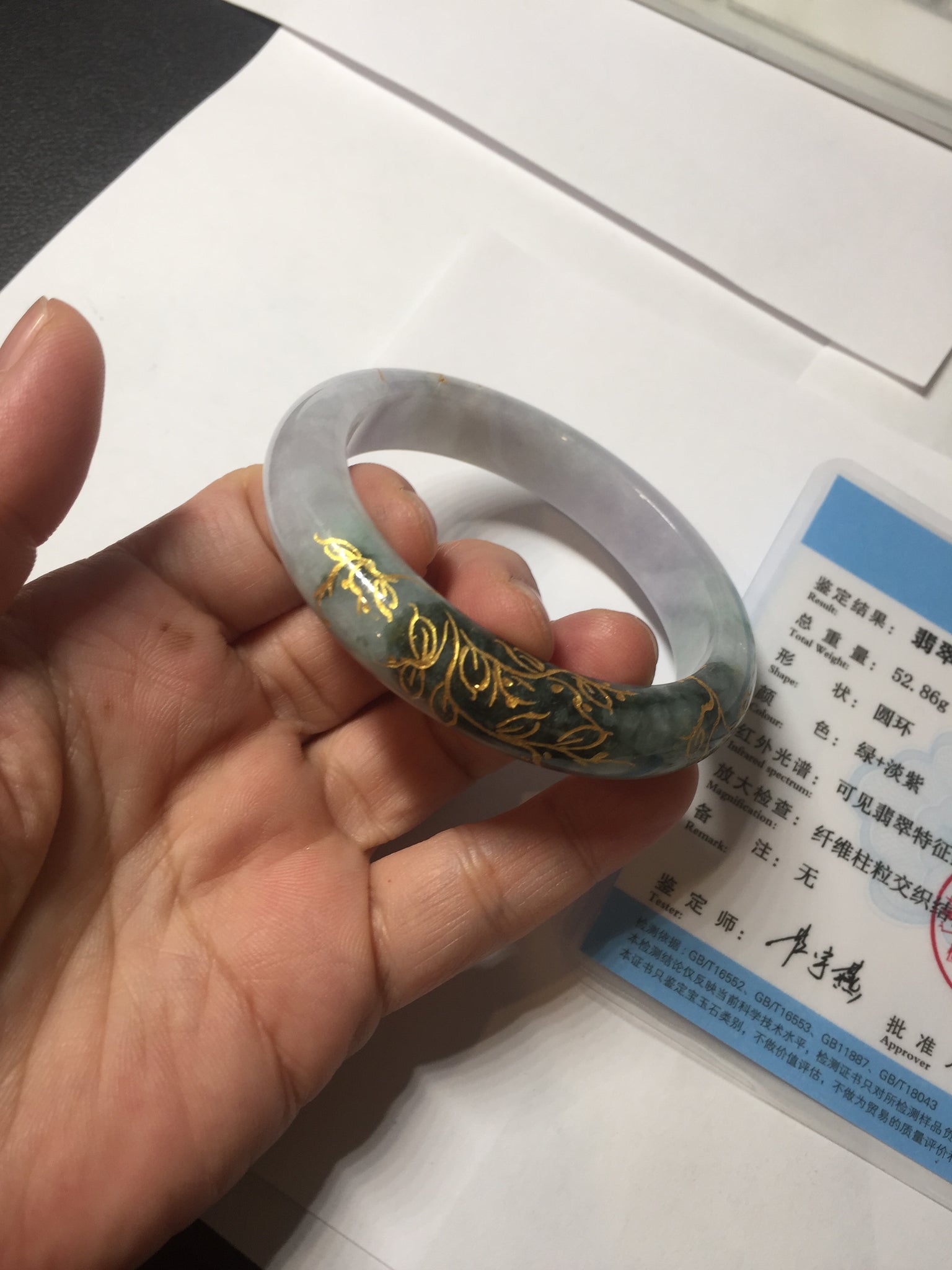 53.6mm 100% Natural type A dark green purple white carved plum bossom and golden-painted Jadeite Jade bangle PD91-0269