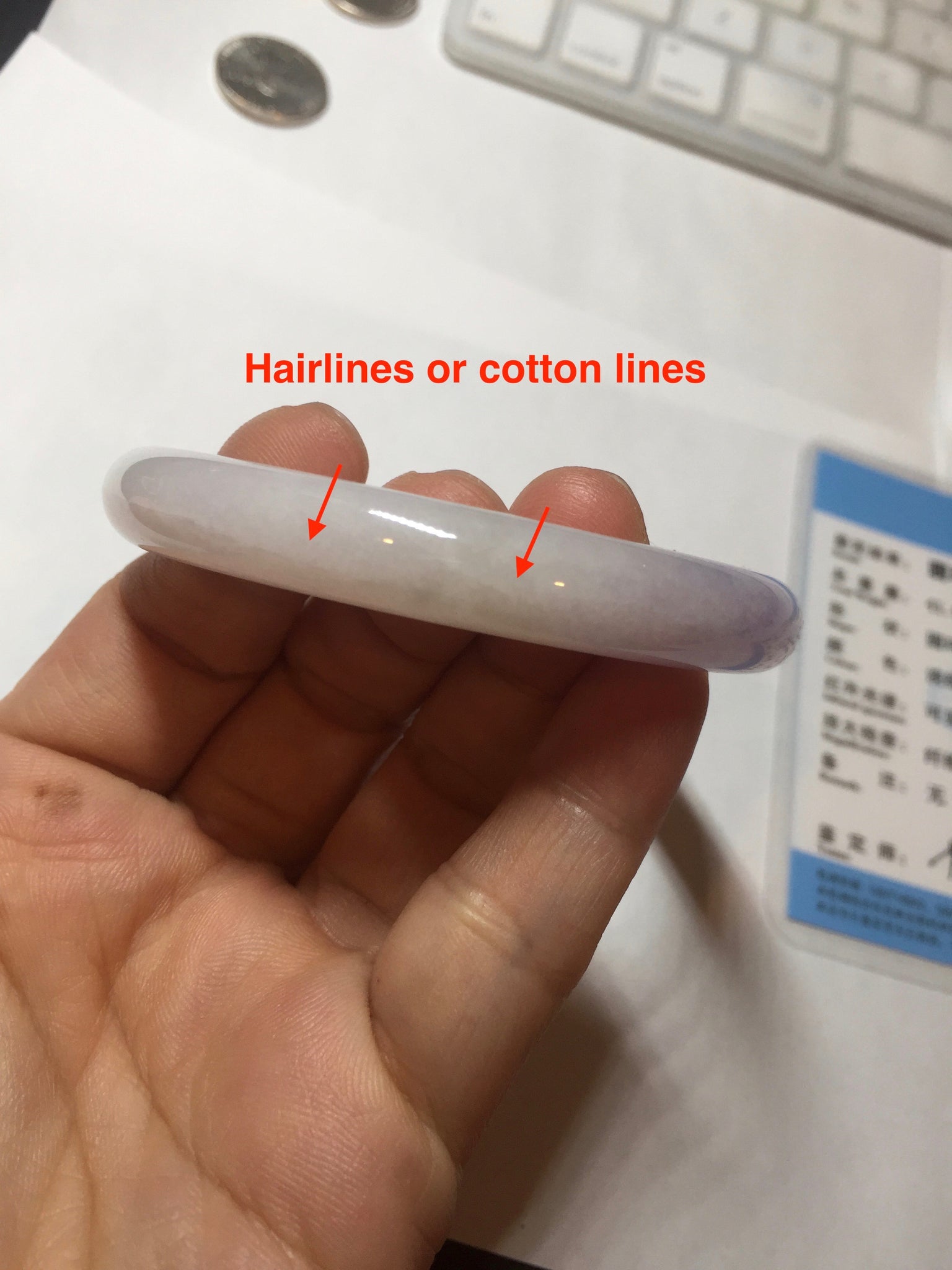 One long crack. The bangle is solid (guaranteed! It makes a high-pitched sound when tapped). Some color roots, cotton lines, and hairlines.  Some cotton areas and spots. Not transparent. The purple is lighter than in the photos due to the purple color always being more camera-friendly.