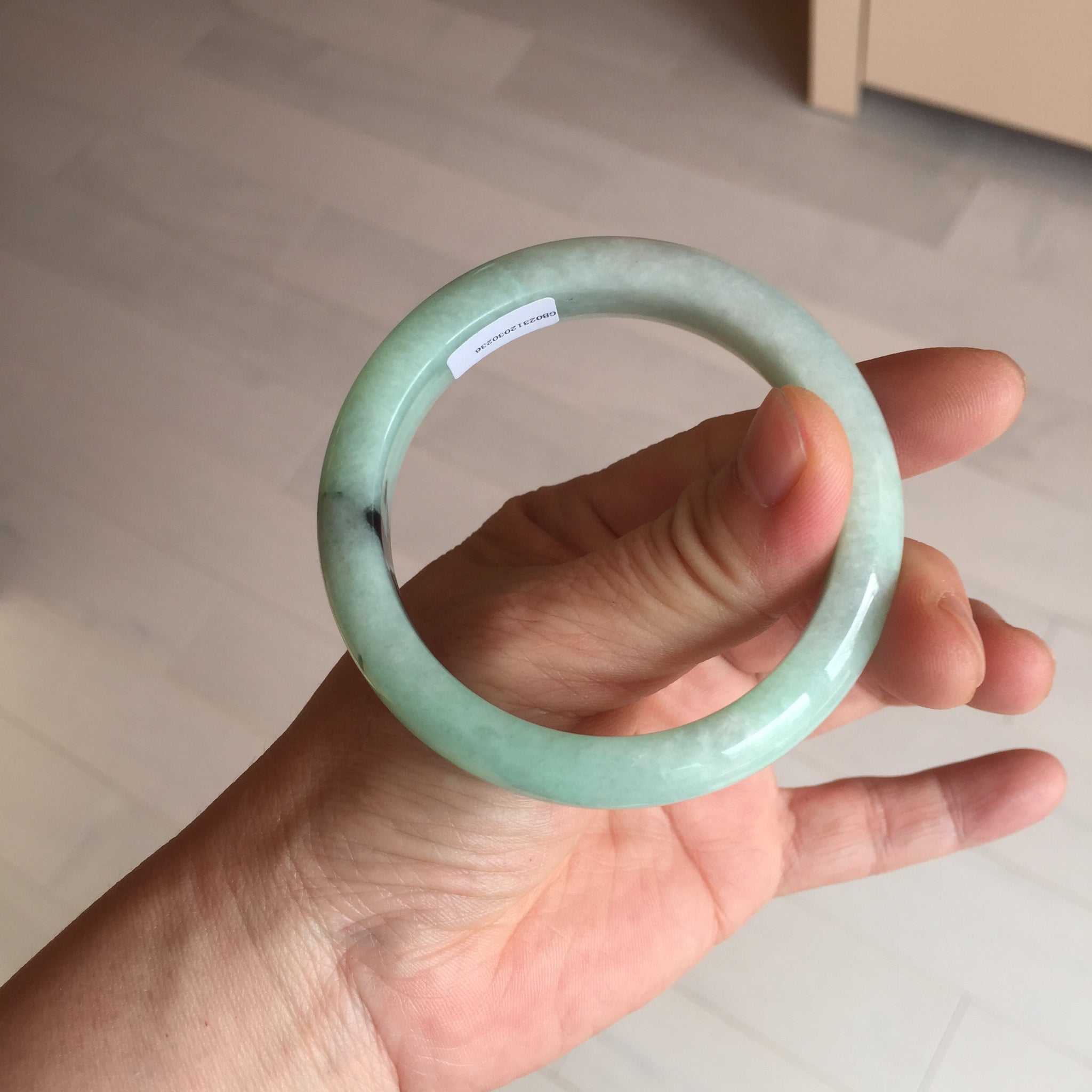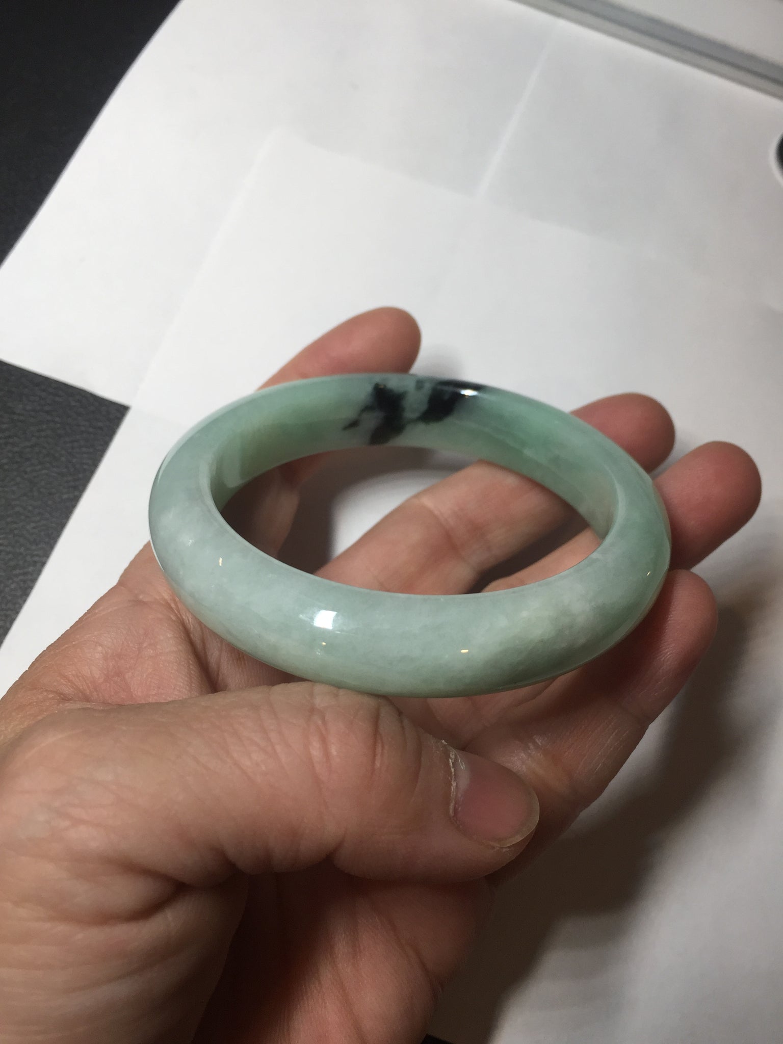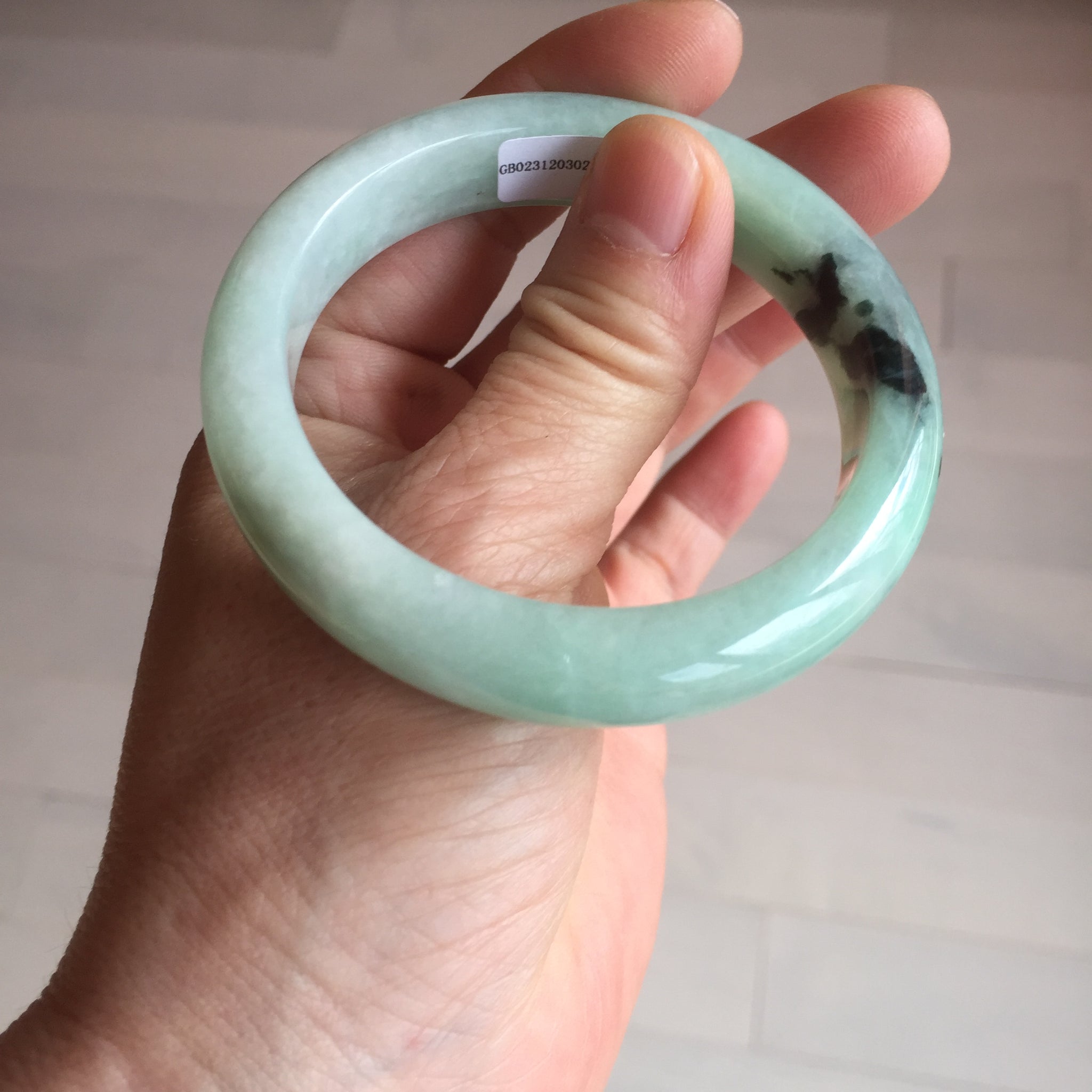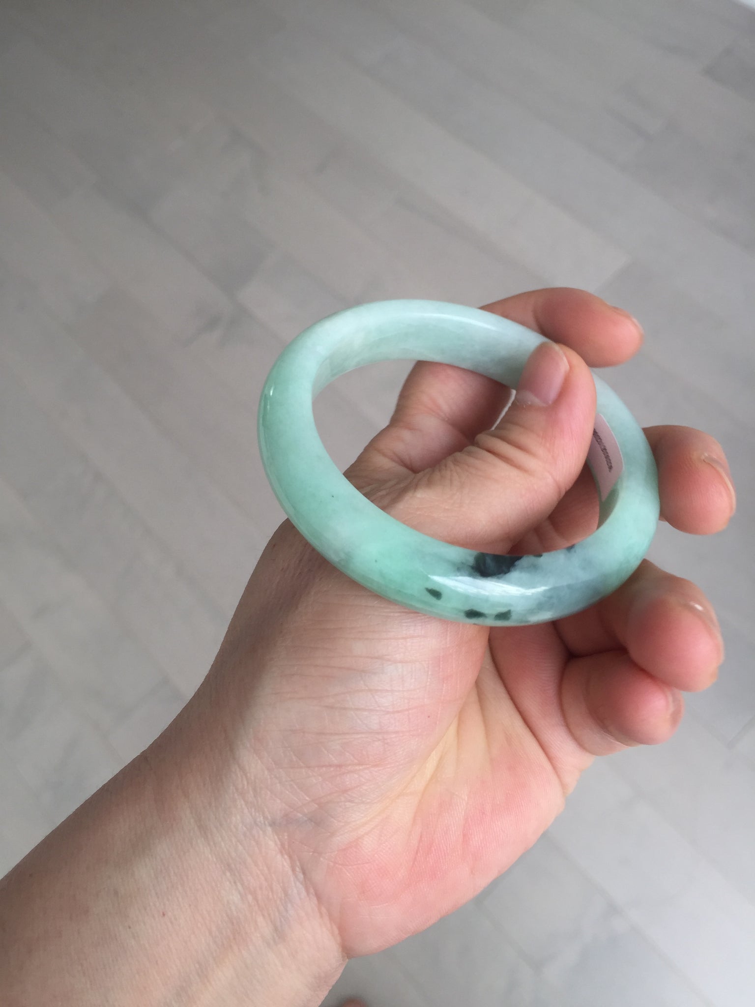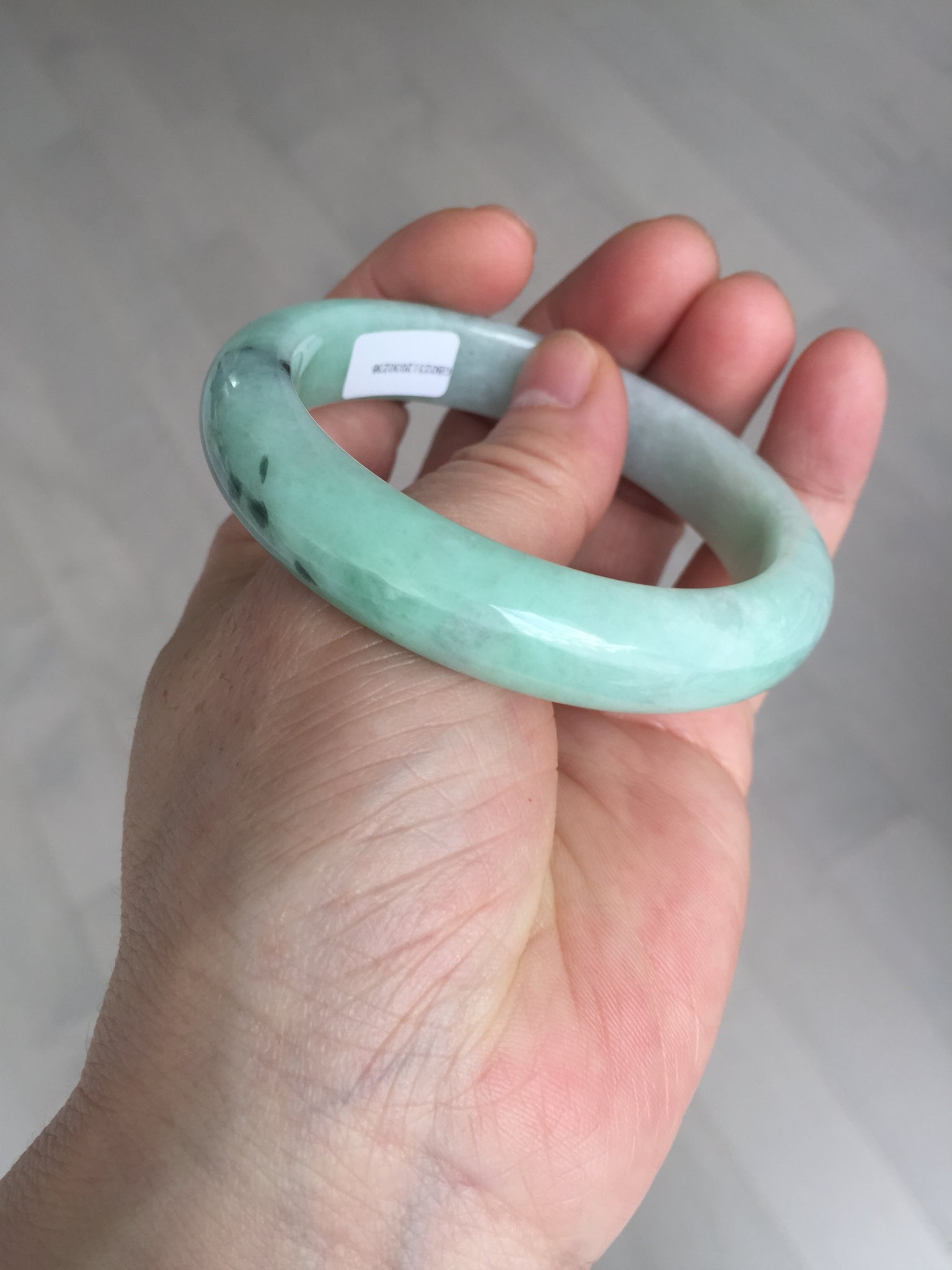 Not crack. Some lone hairlines. Along side the bangle almost 2/3 of the bangle. One dark green area and spots. Cotton lines/areas. The bangle is solid (refund guaranteed!).