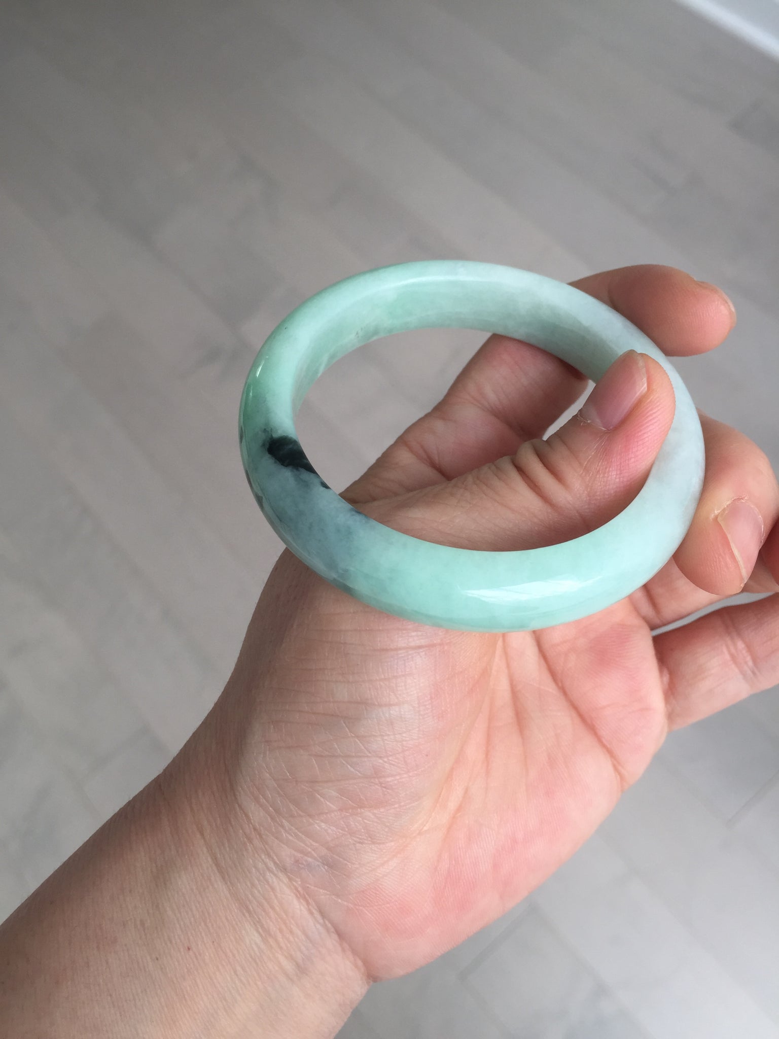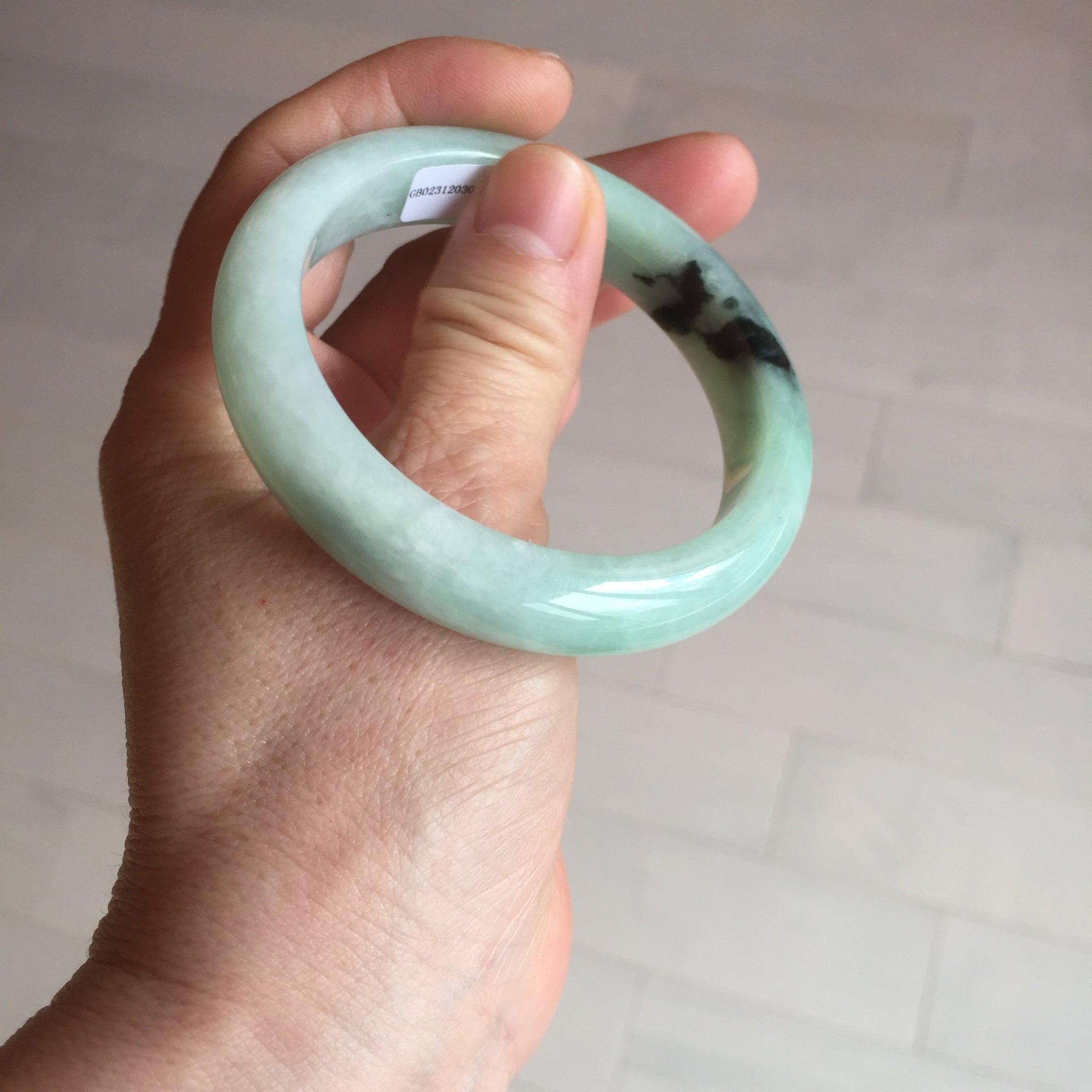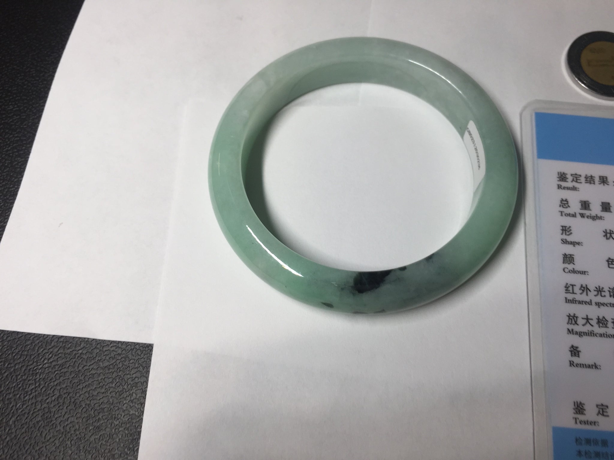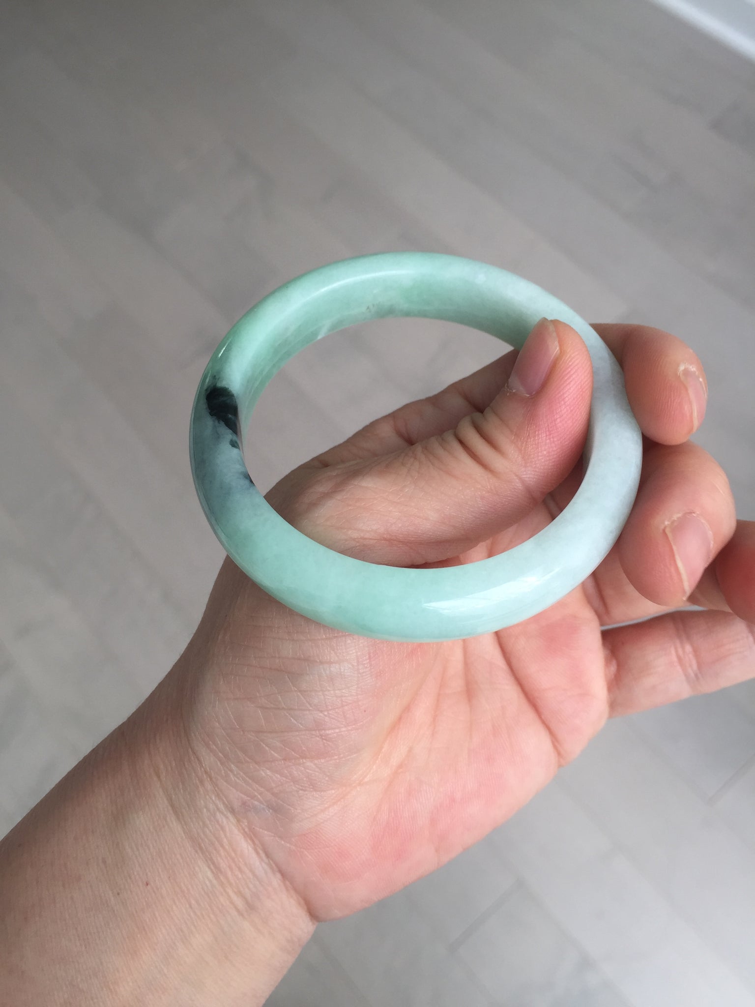 Not crack. Some lone hairlines. Along side the bangle almost 2/3 of the bangle. One dark green area and spots. Cotton lines/areas. The bangle is solid (refund guaranteed!).