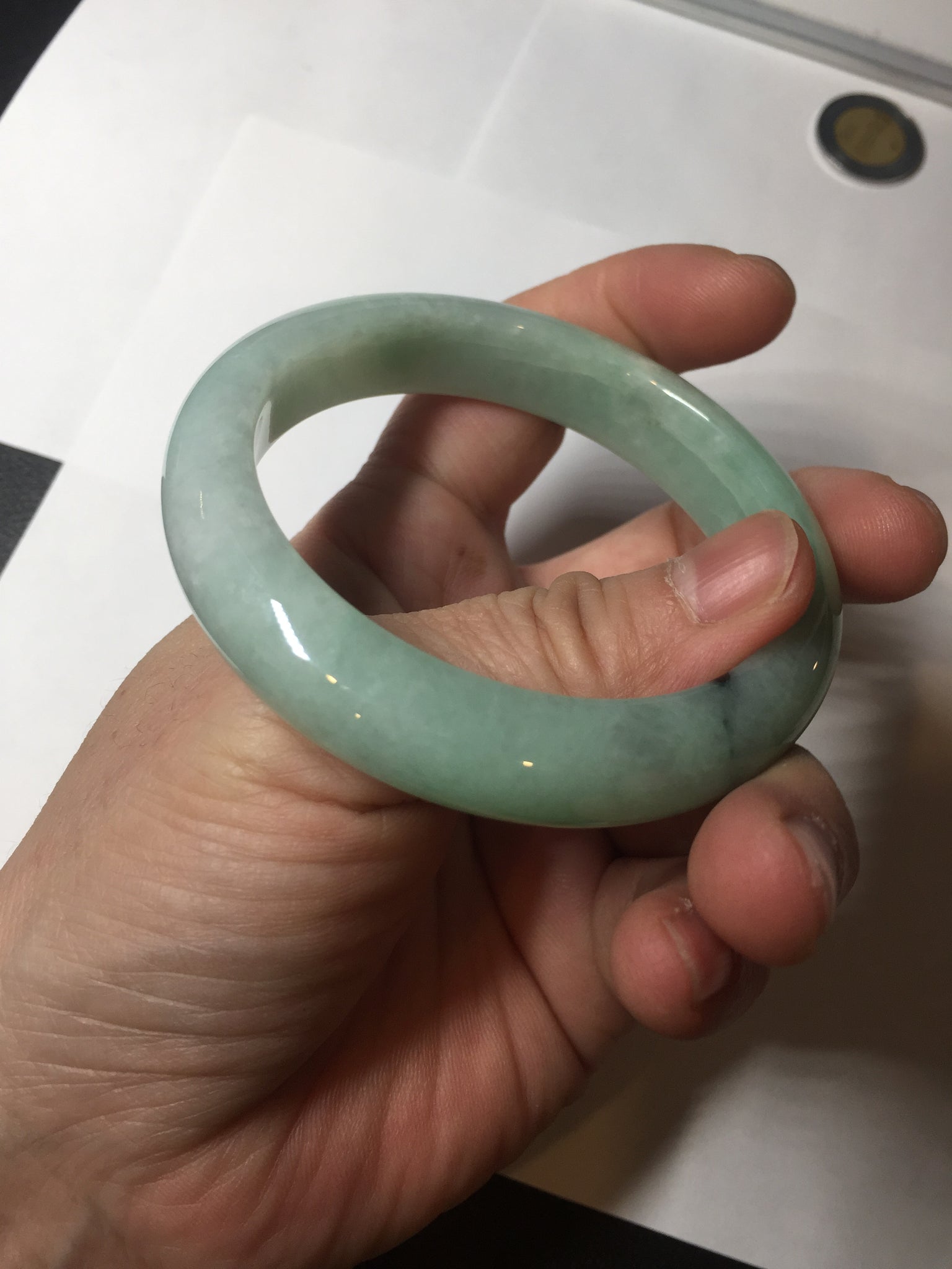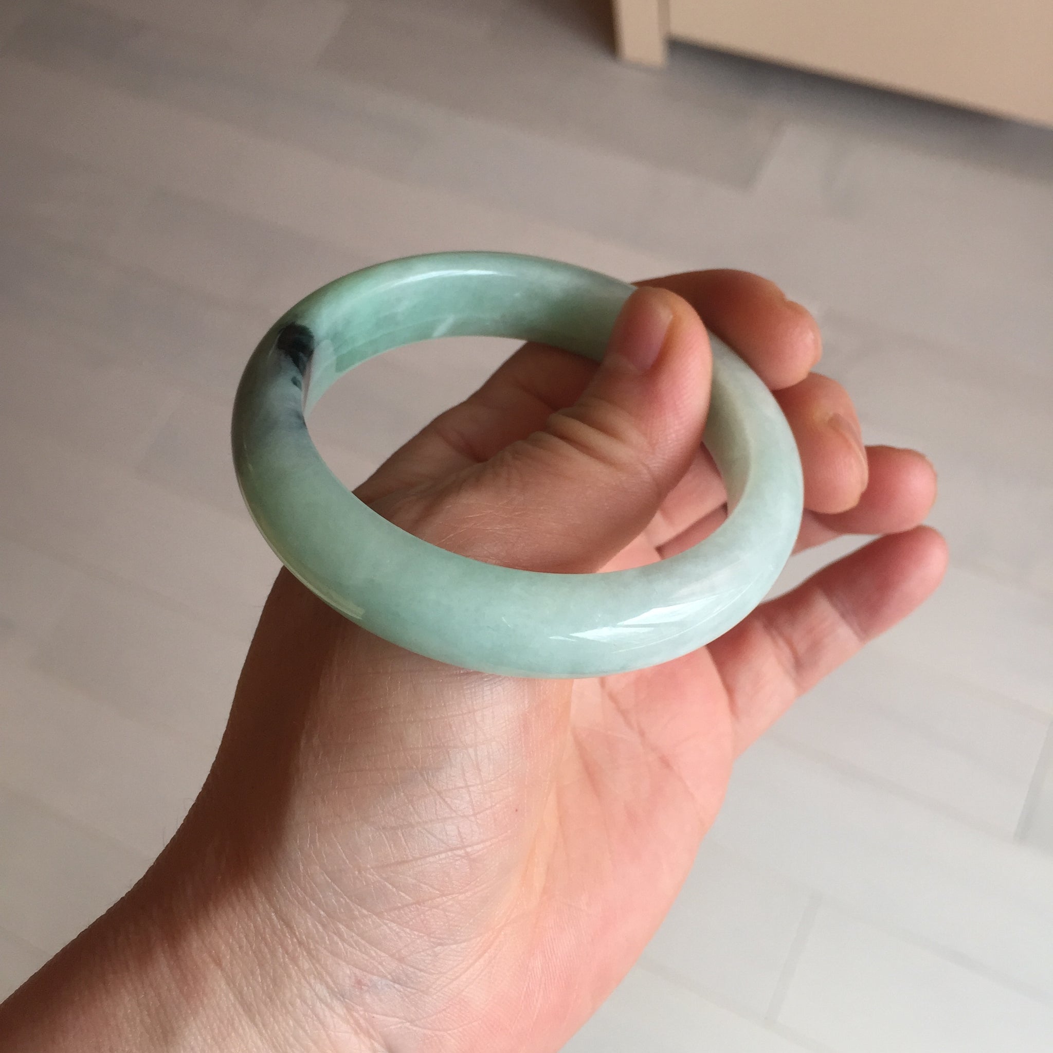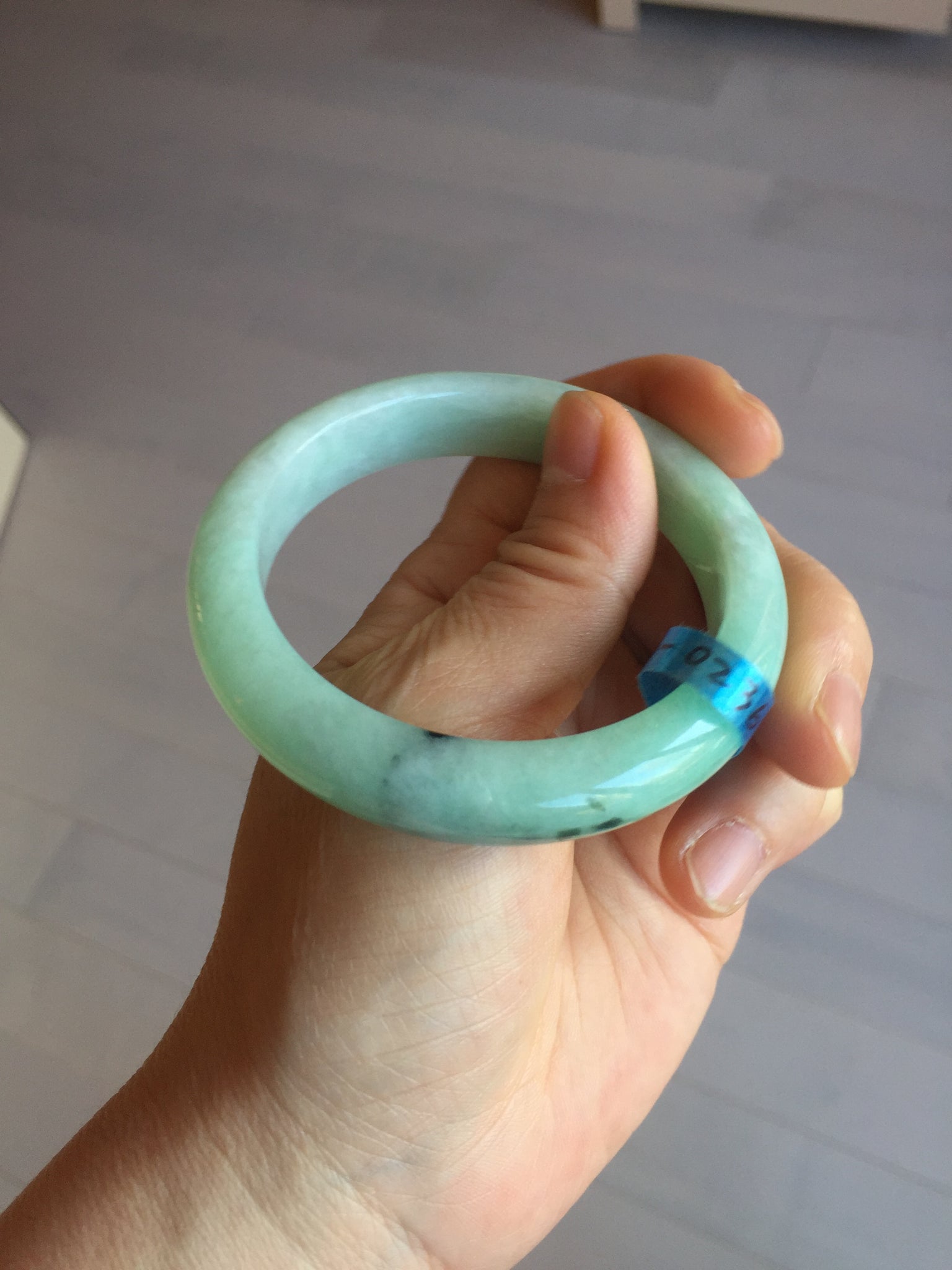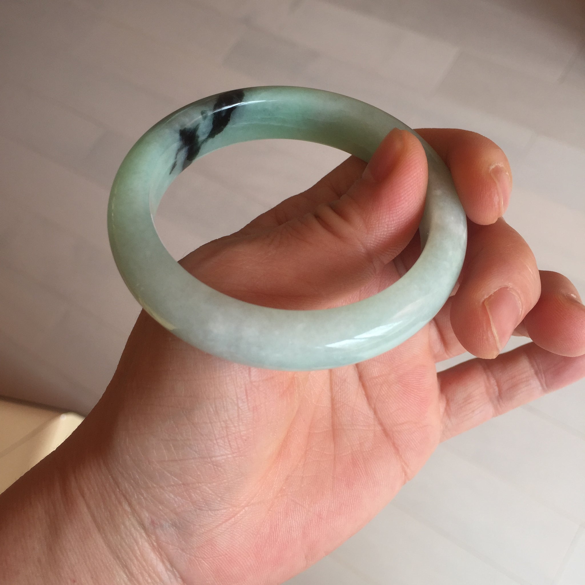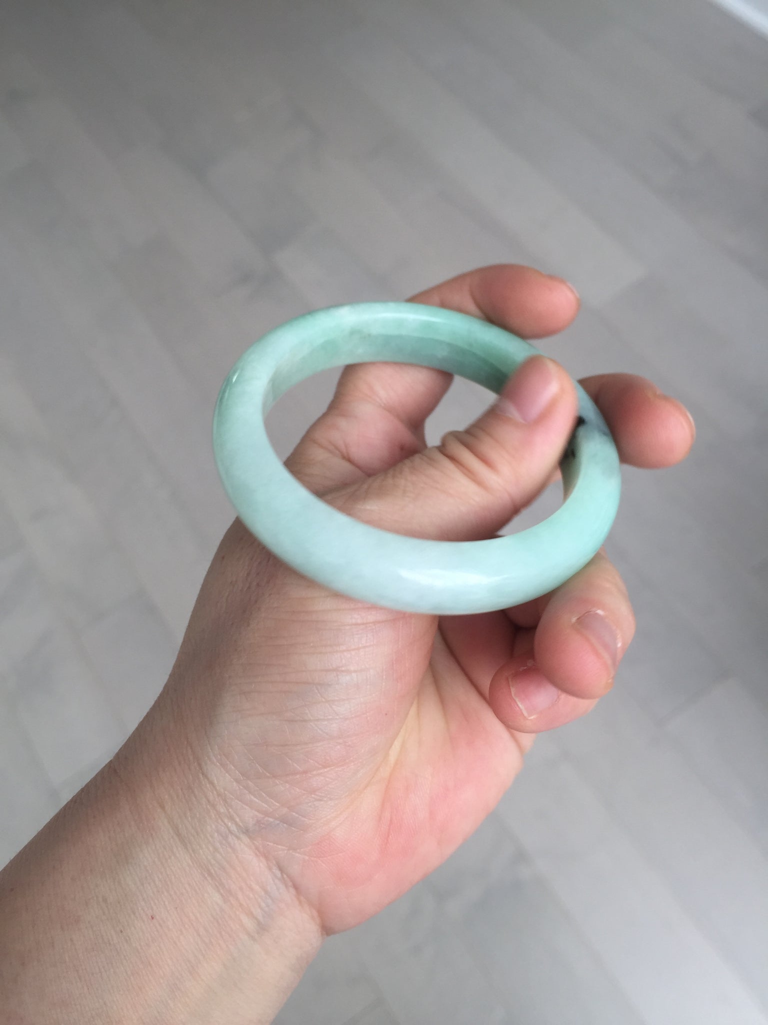 Not crack. Some lone hairlines. Along side the bangle almost 2/3 of the bangle. One dark green area and spots. Cotton lines/areas. The bangle is solid (refund guaranteed!).