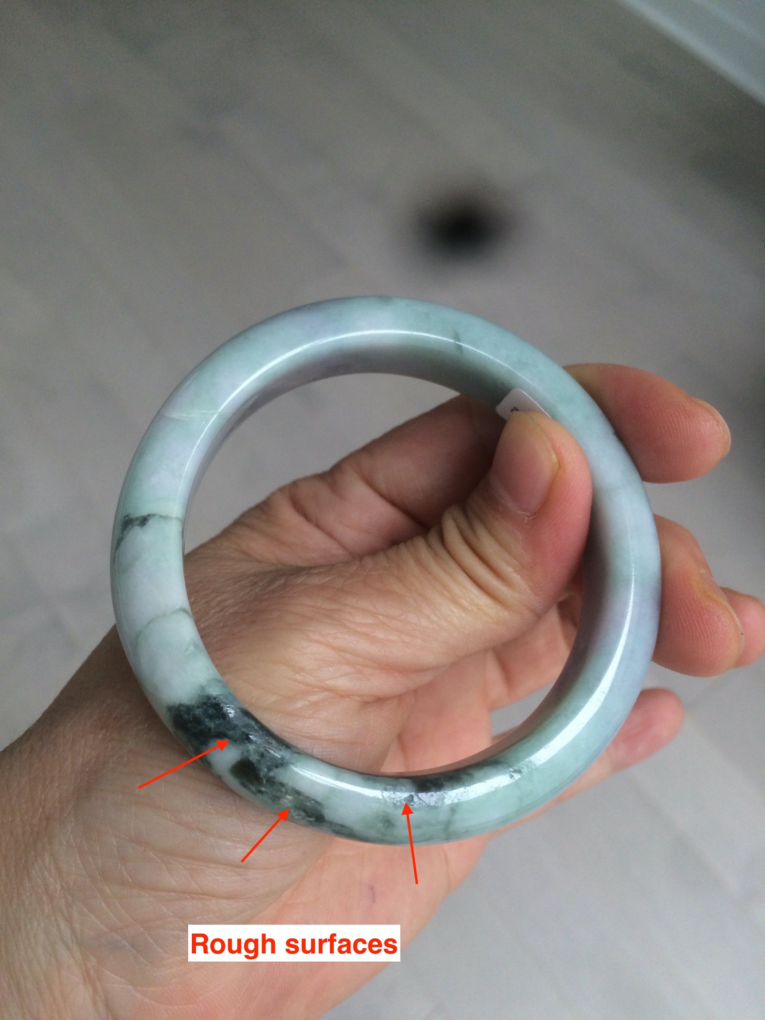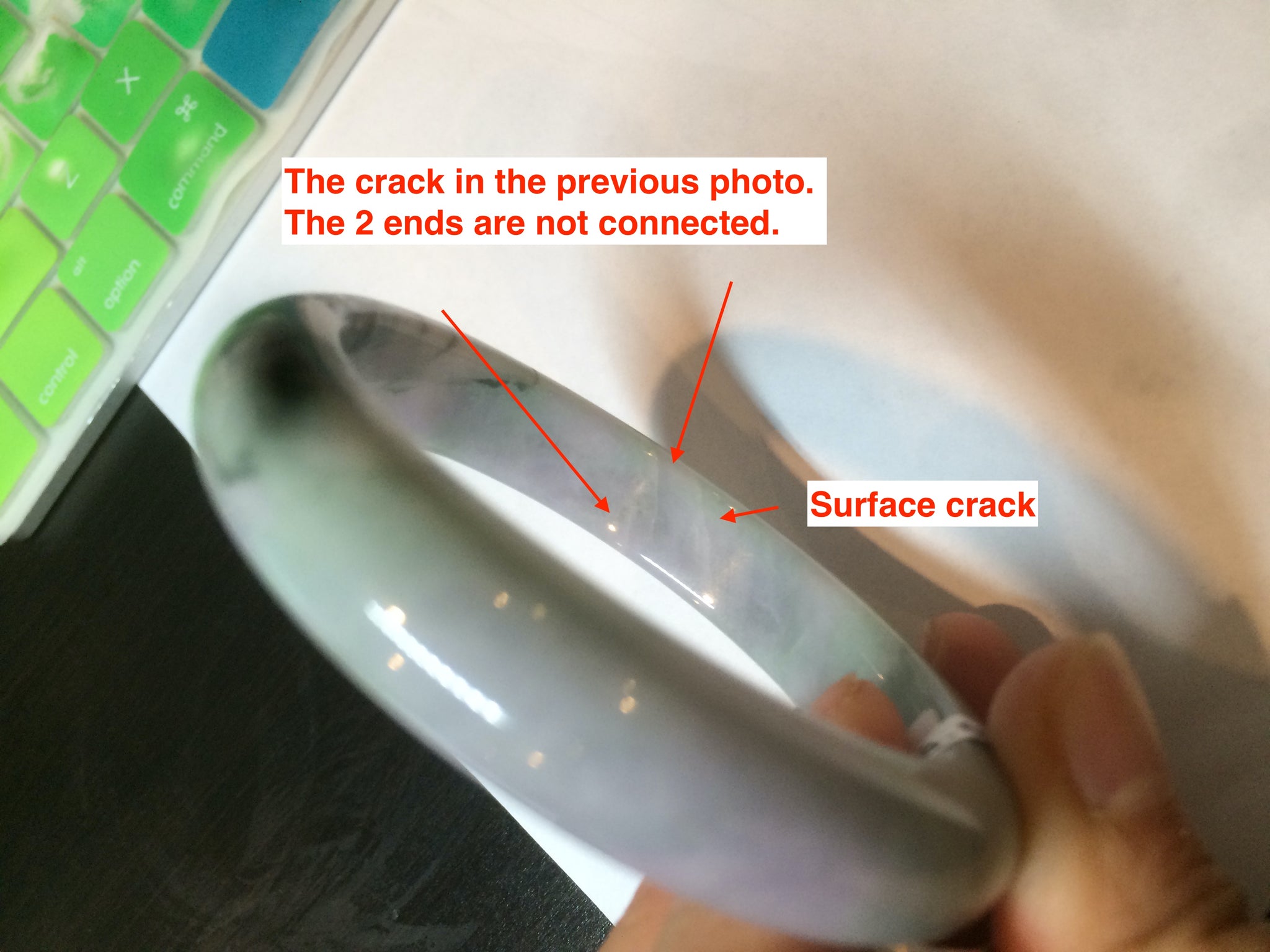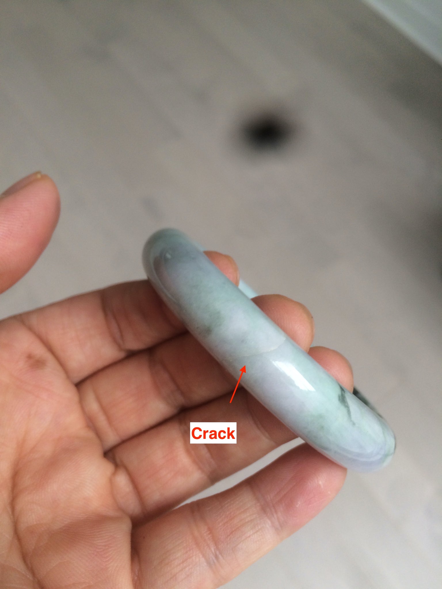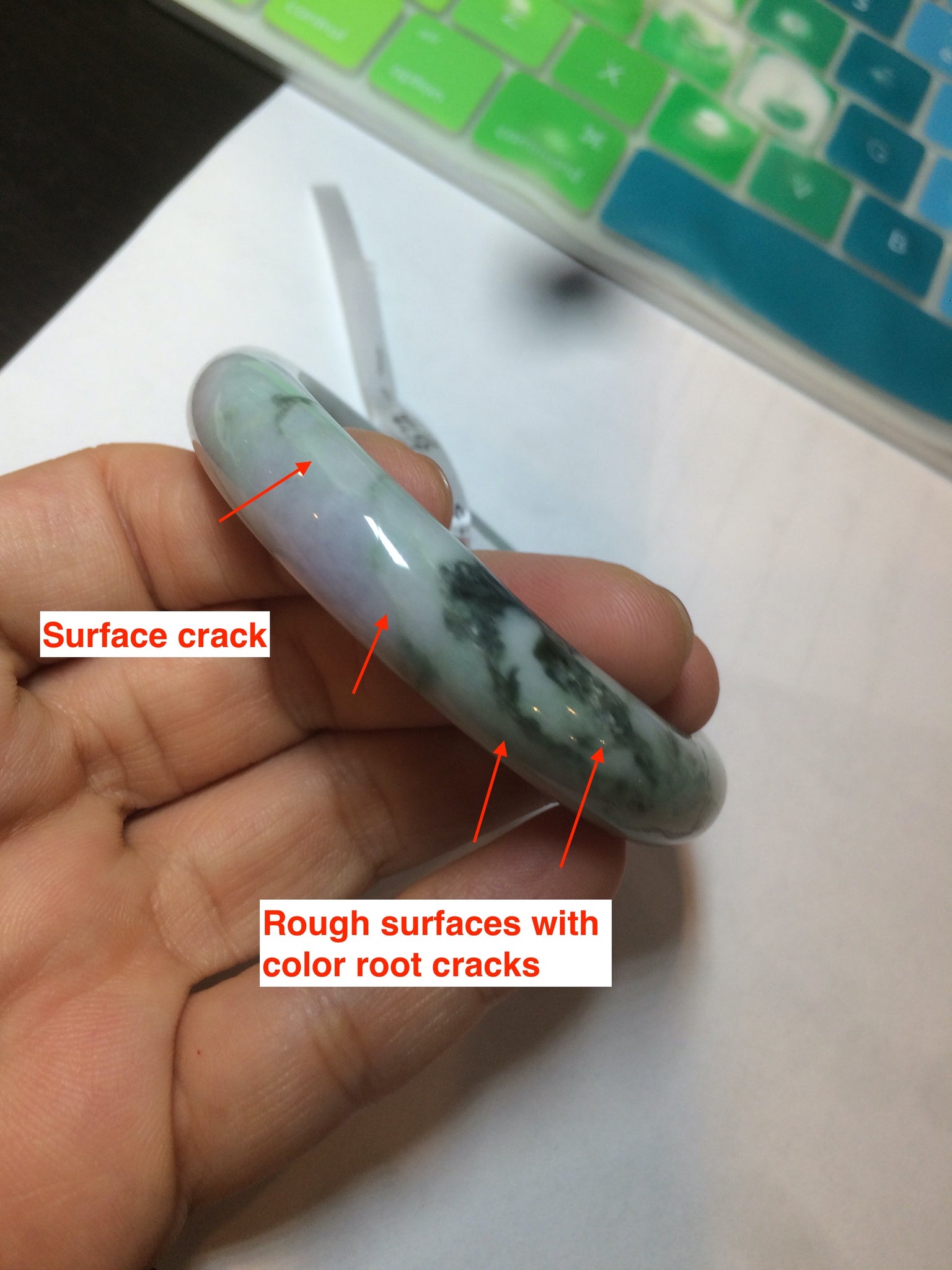 Some cracks. One deep, but not an around the bangle crack. Some rough surfaces with color root cracks. That area is a little bit thinner than the other parts (7.5mm vs 8.5mm). The purple is lighter than in the photos.