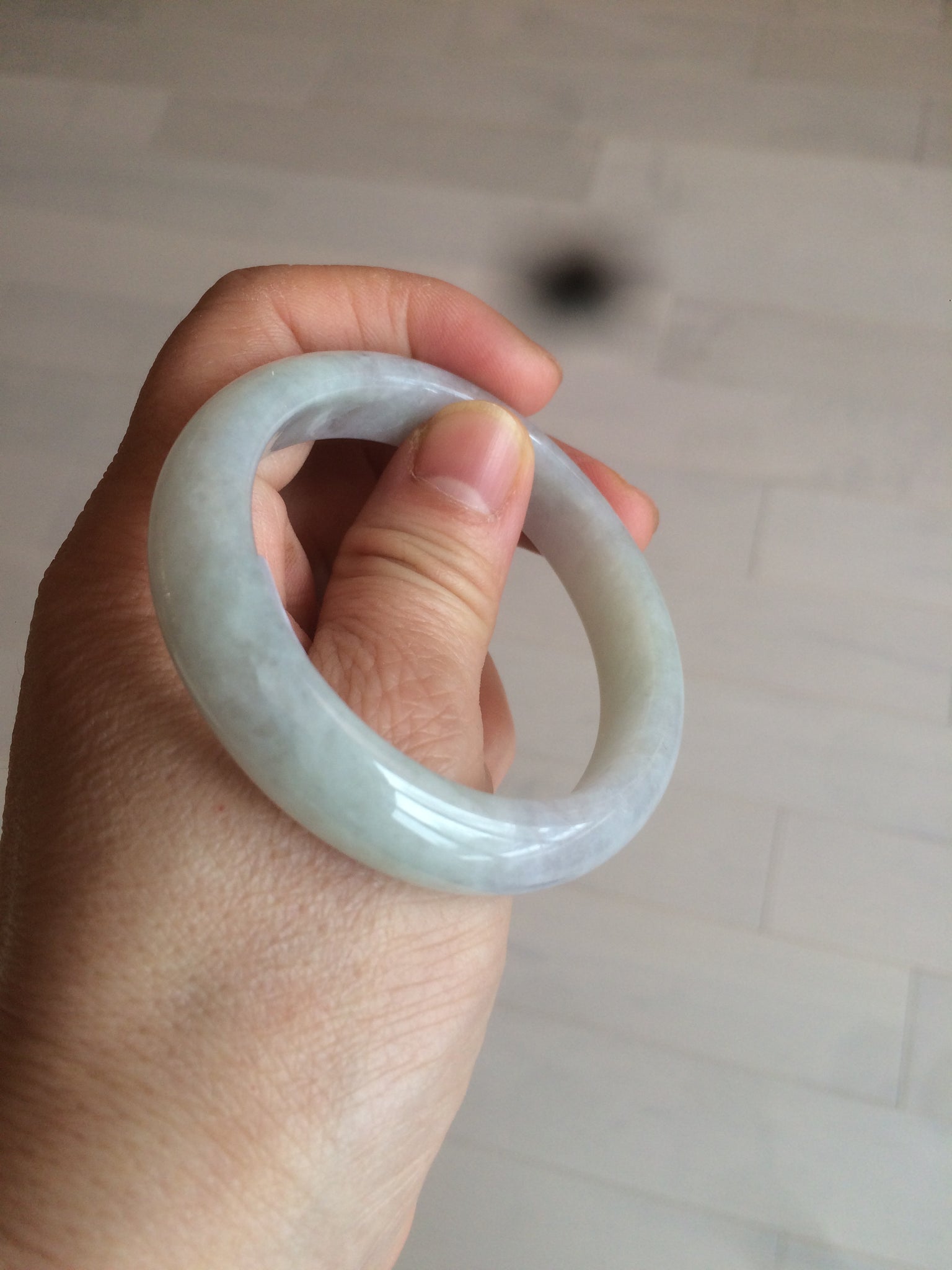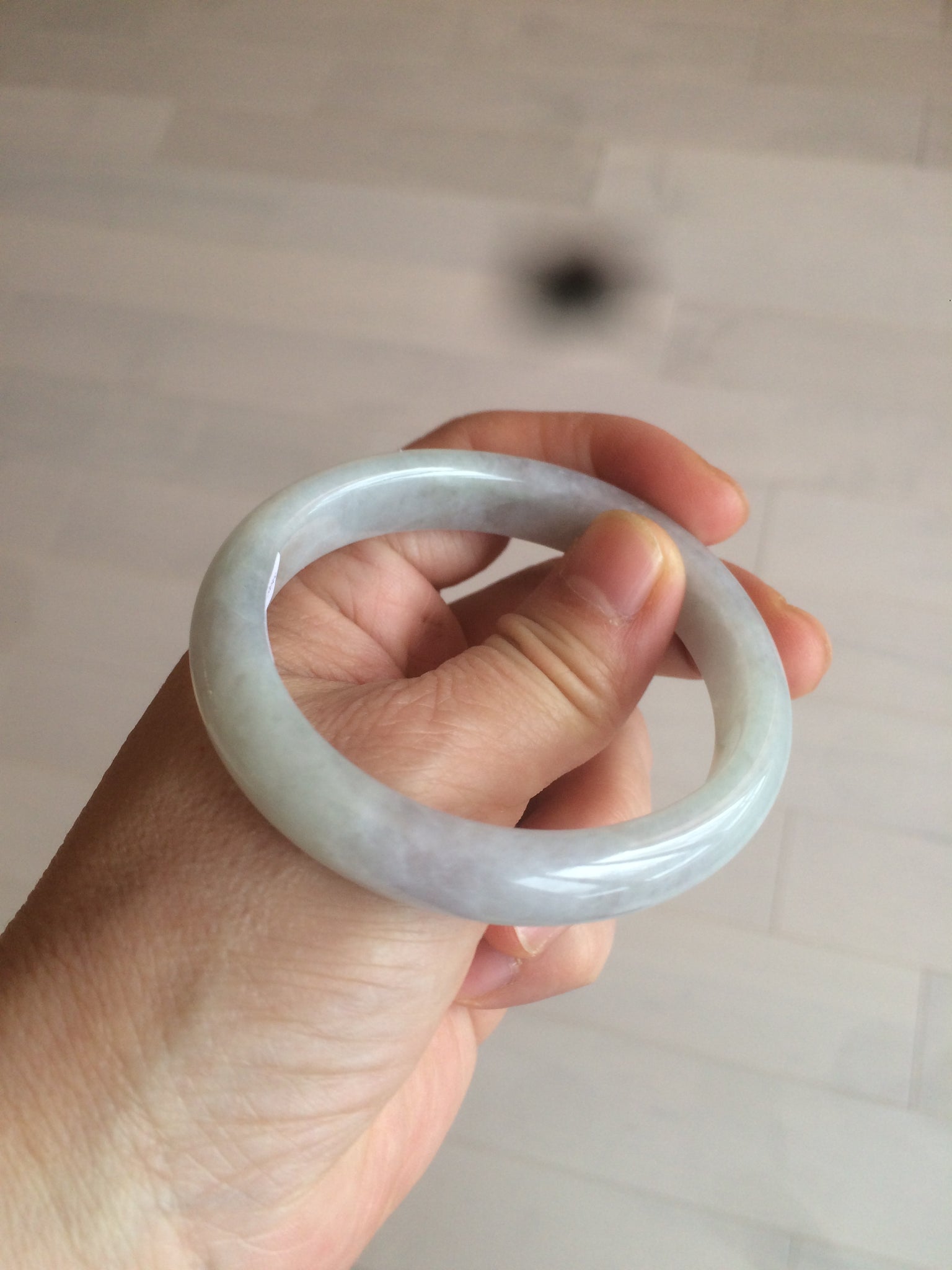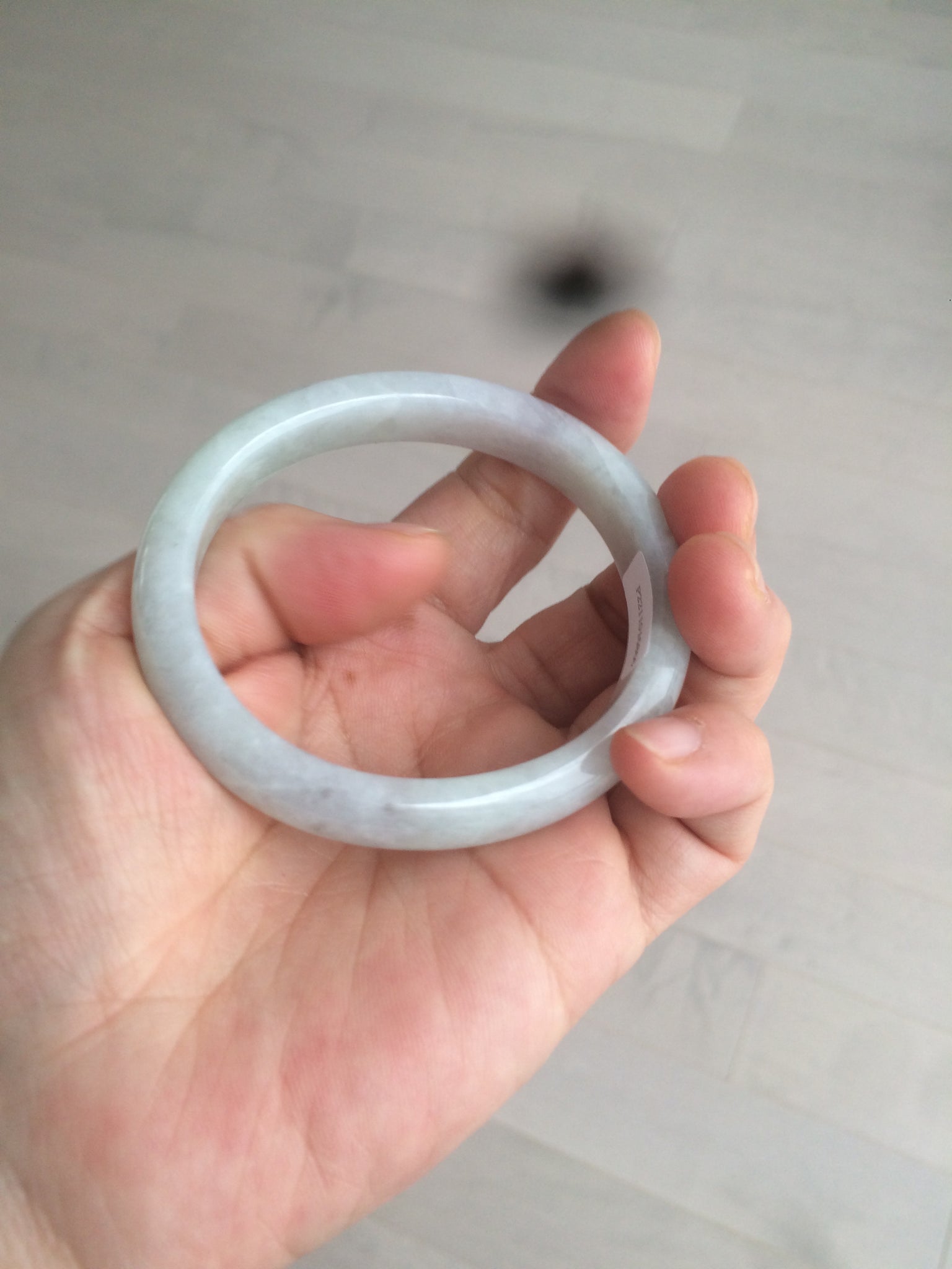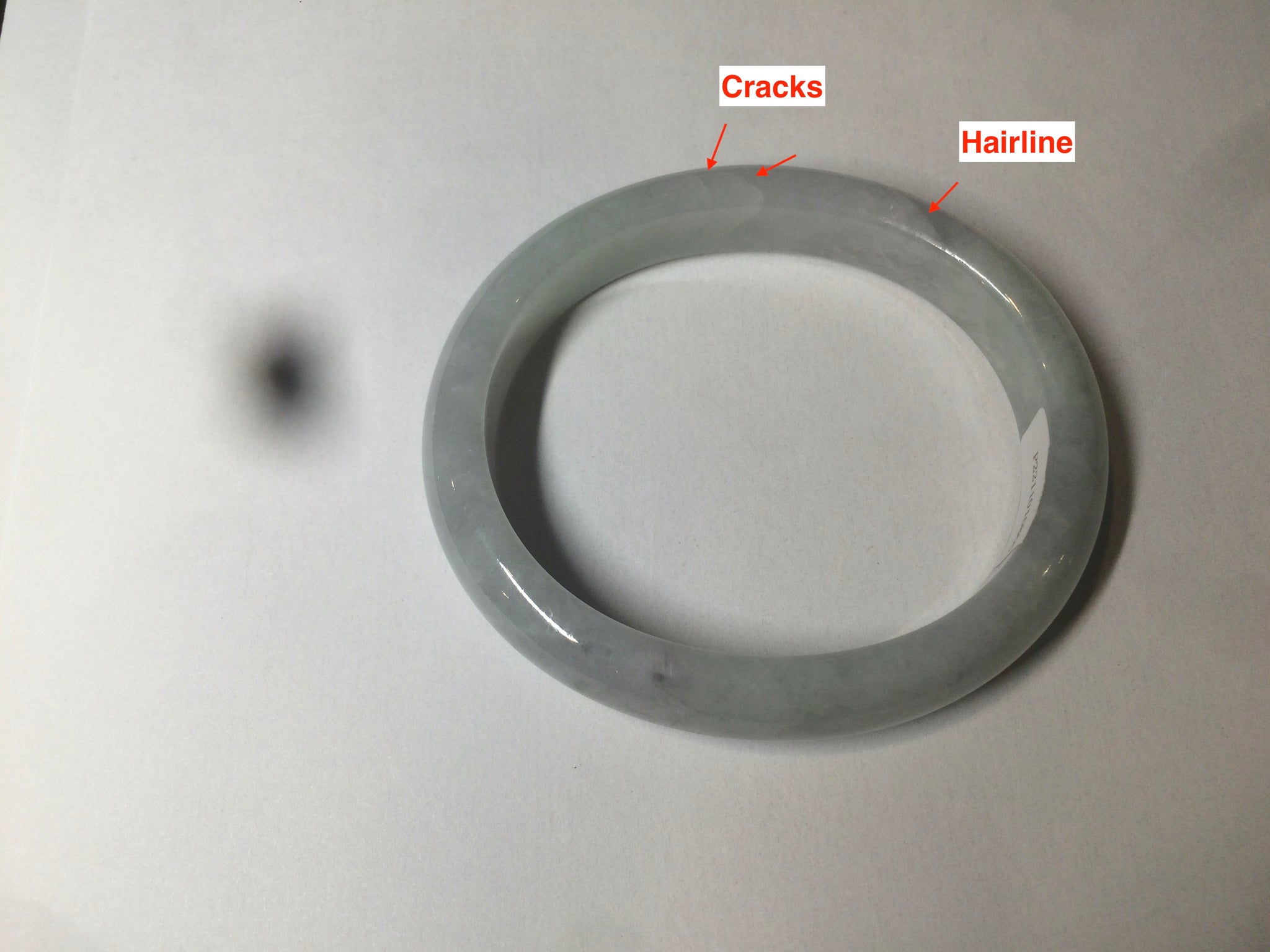 Some rough surfaces with cracks(photos may not show all). The bangle is still firm. Some cotton lines, cotton areas, and spots. Some blisters. The purple is lighter than in the photos.