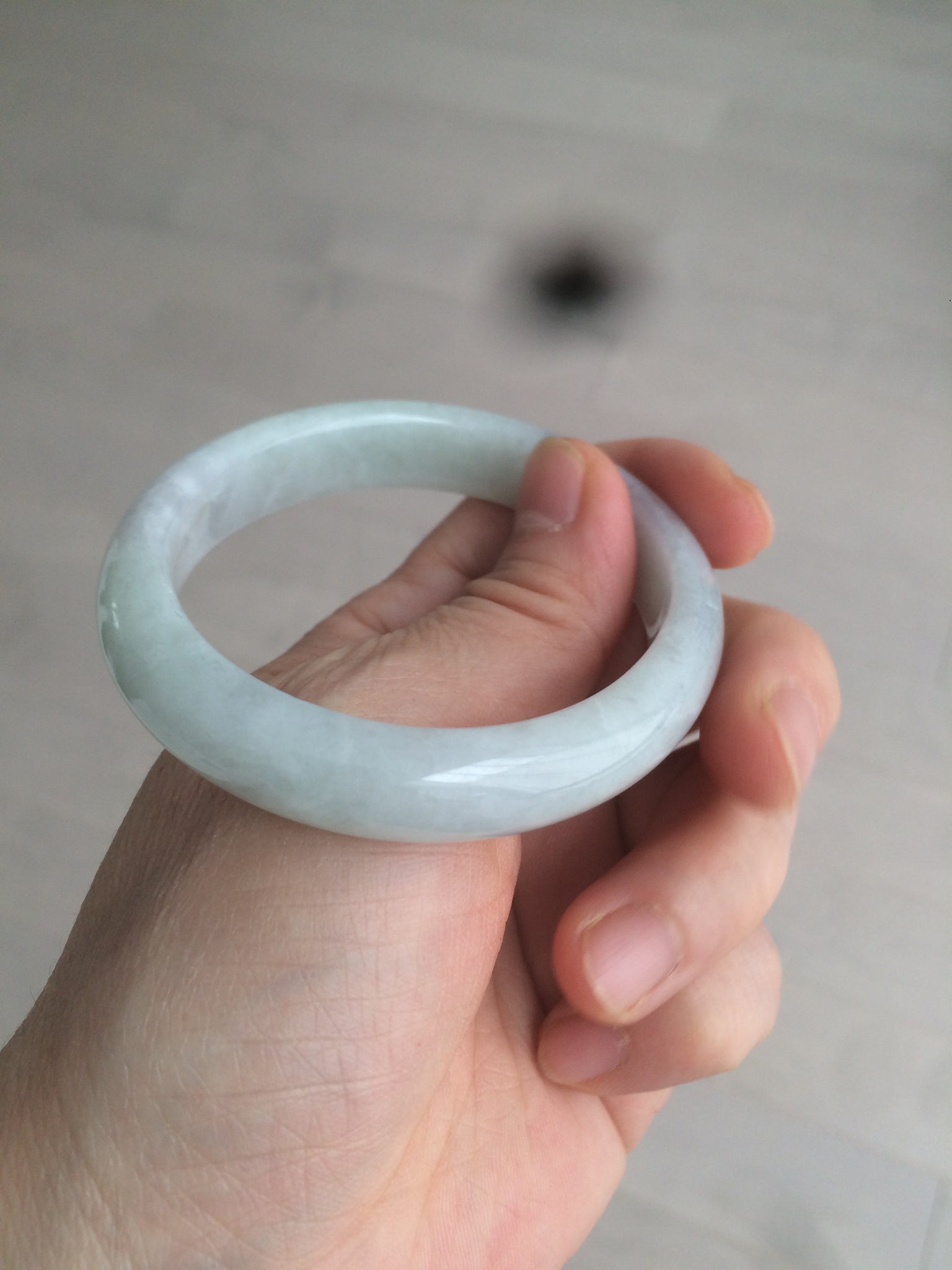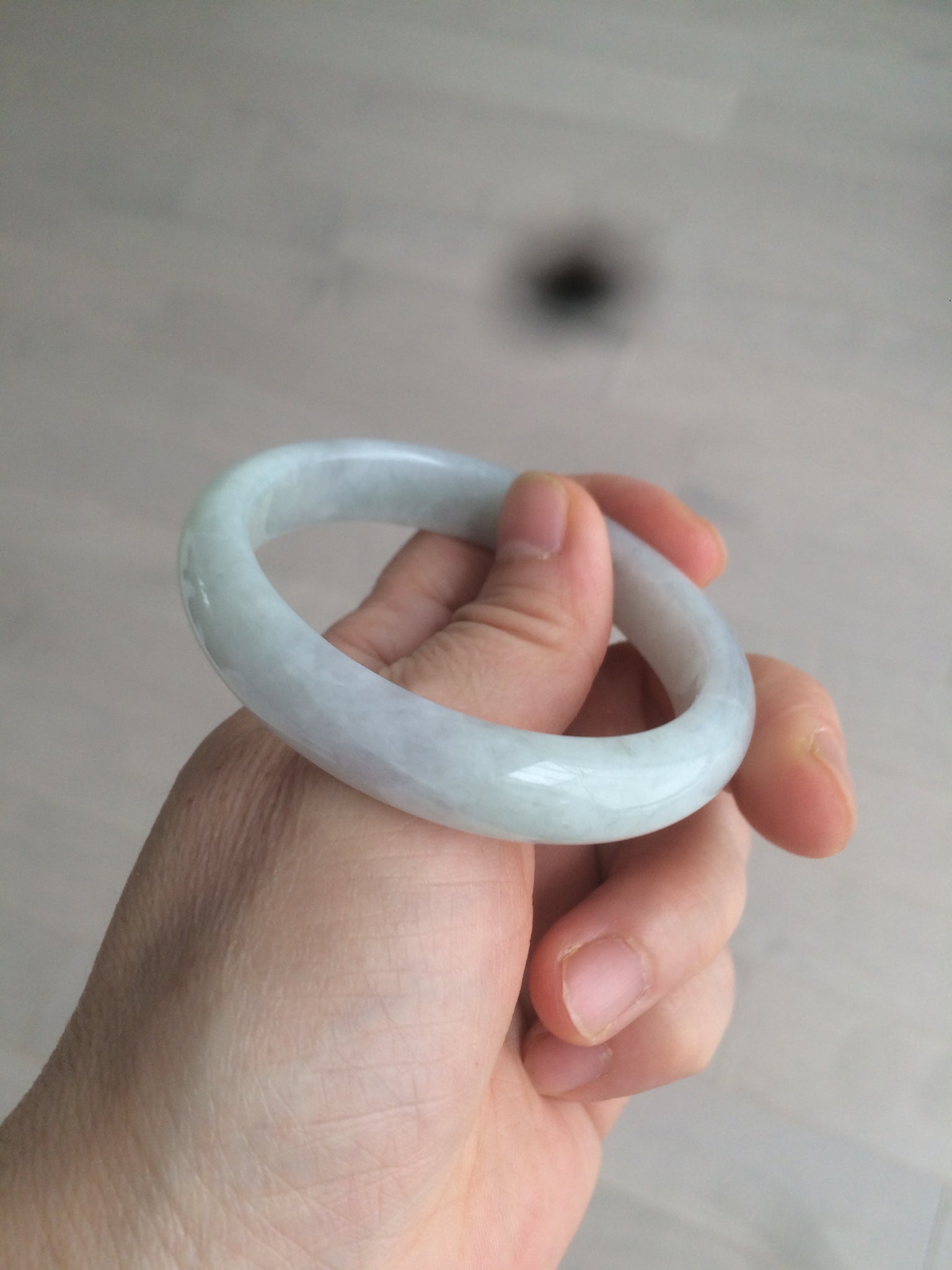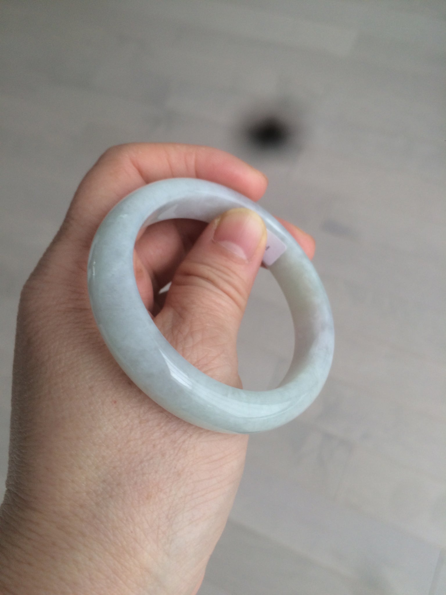 Some rough surfaces with cracks(photos may not show all). The bangle is still firm. Some cotton lines, cotton areas, and spots. Some blisters. The purple is lighter than in the photos.