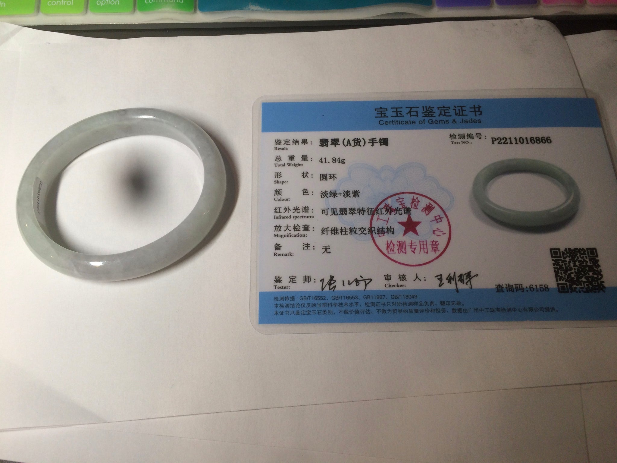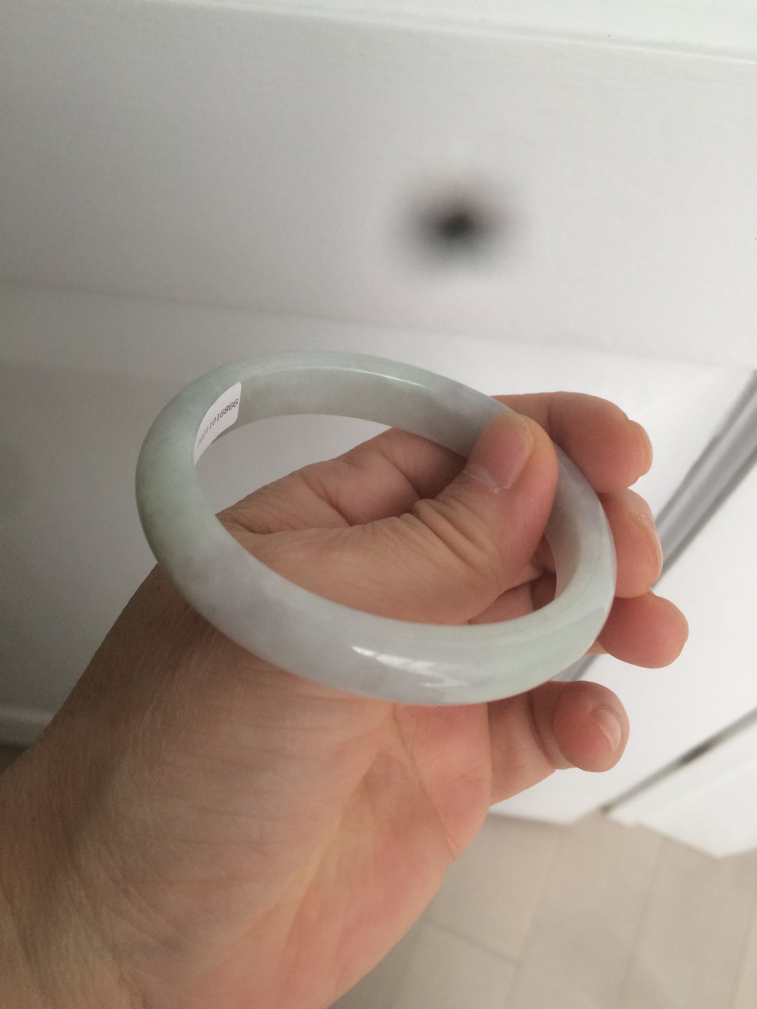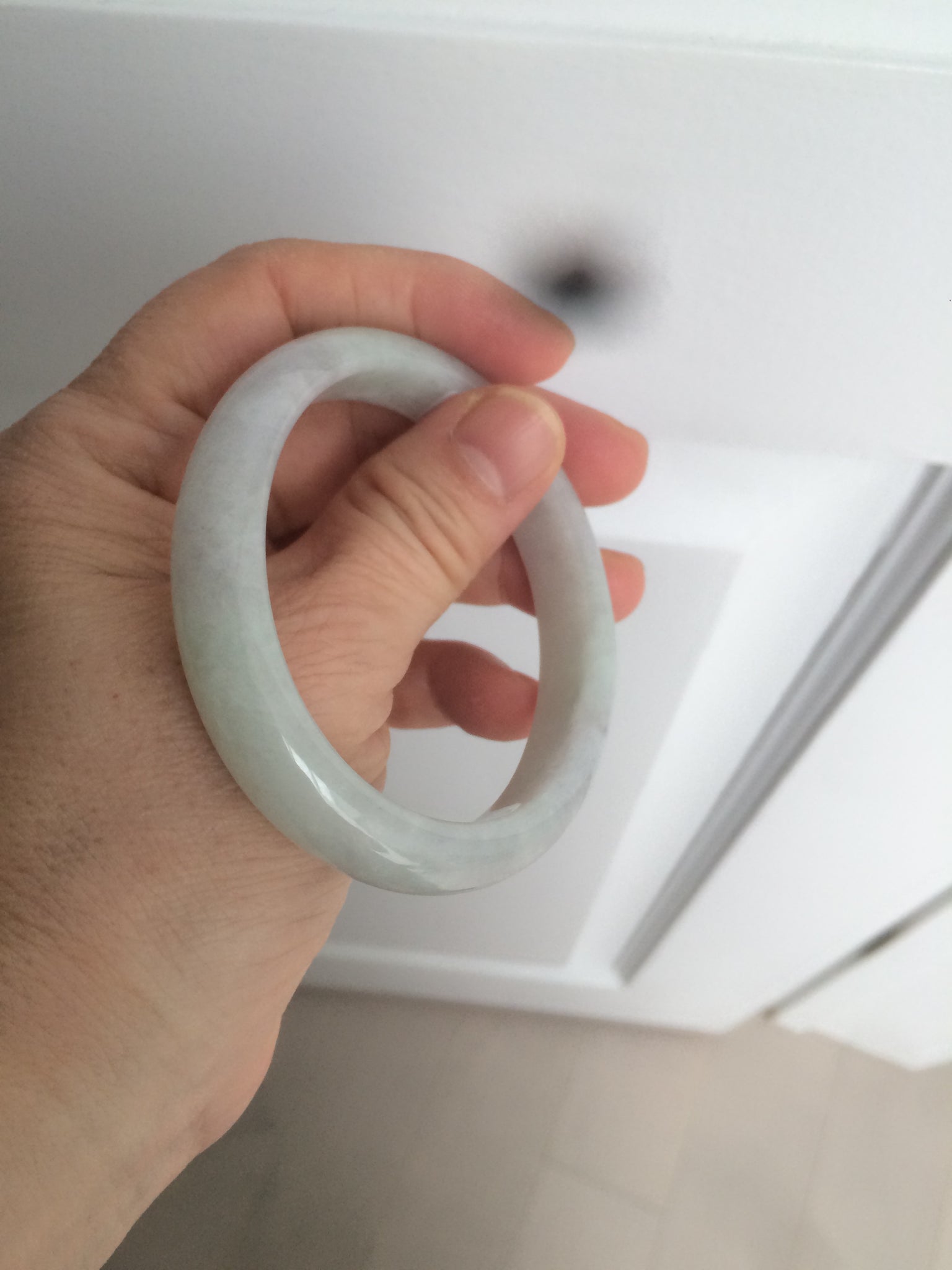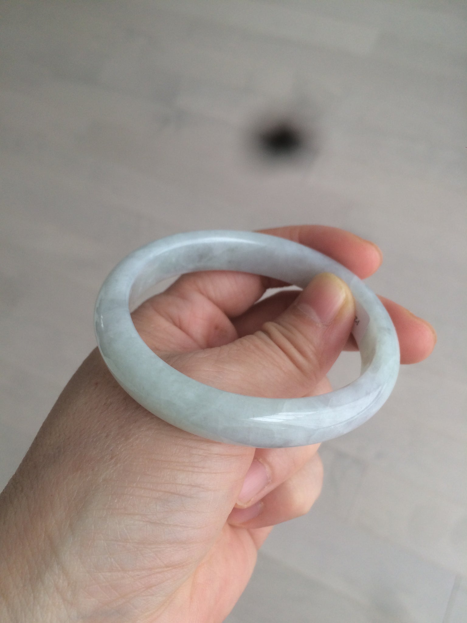 Some rough surfaces with cracks(photos may not show all). The bangle is still firm. Some cotton lines, cotton areas, and spots. Some blisters. The purple is lighter than in the photos.