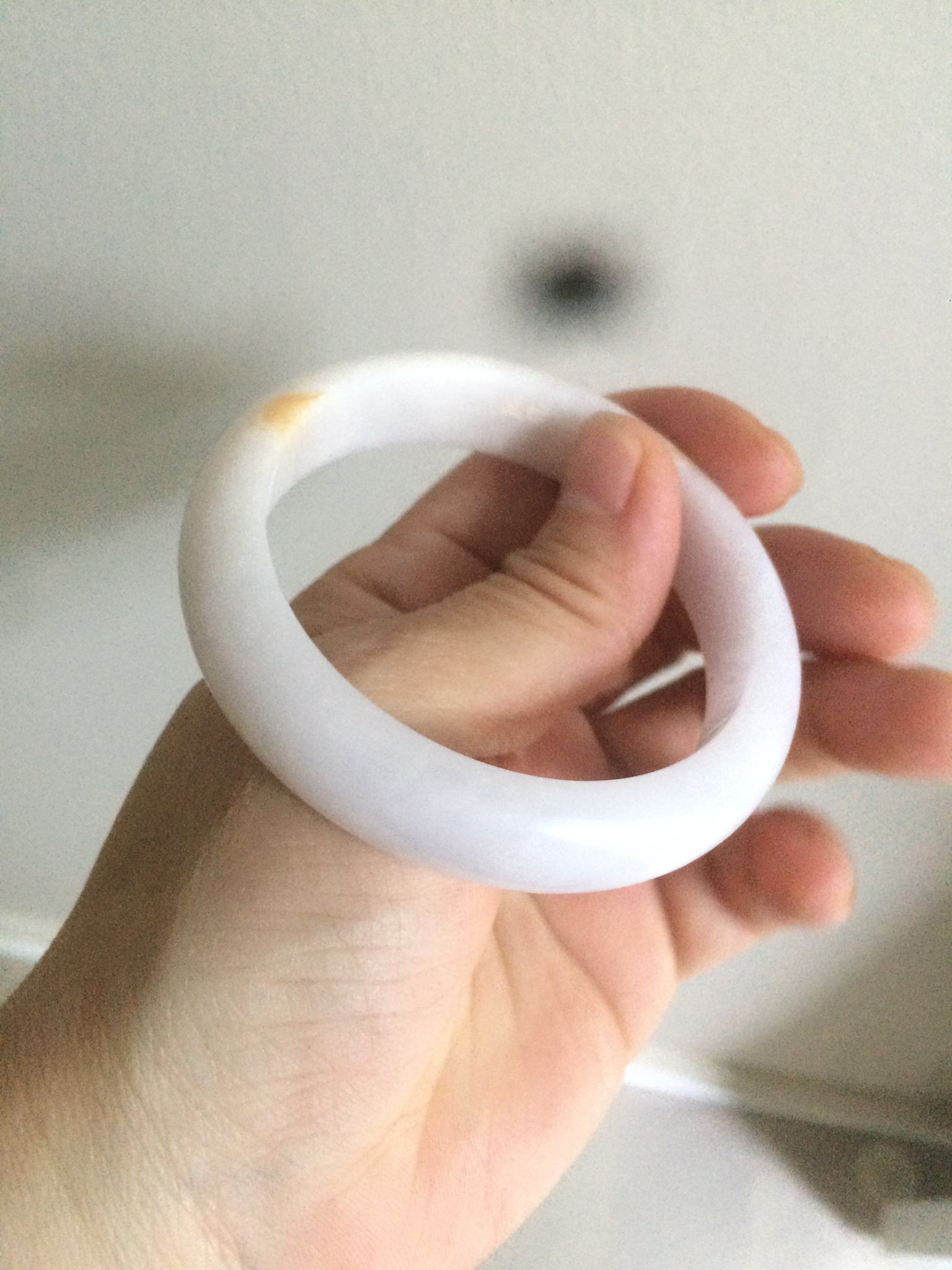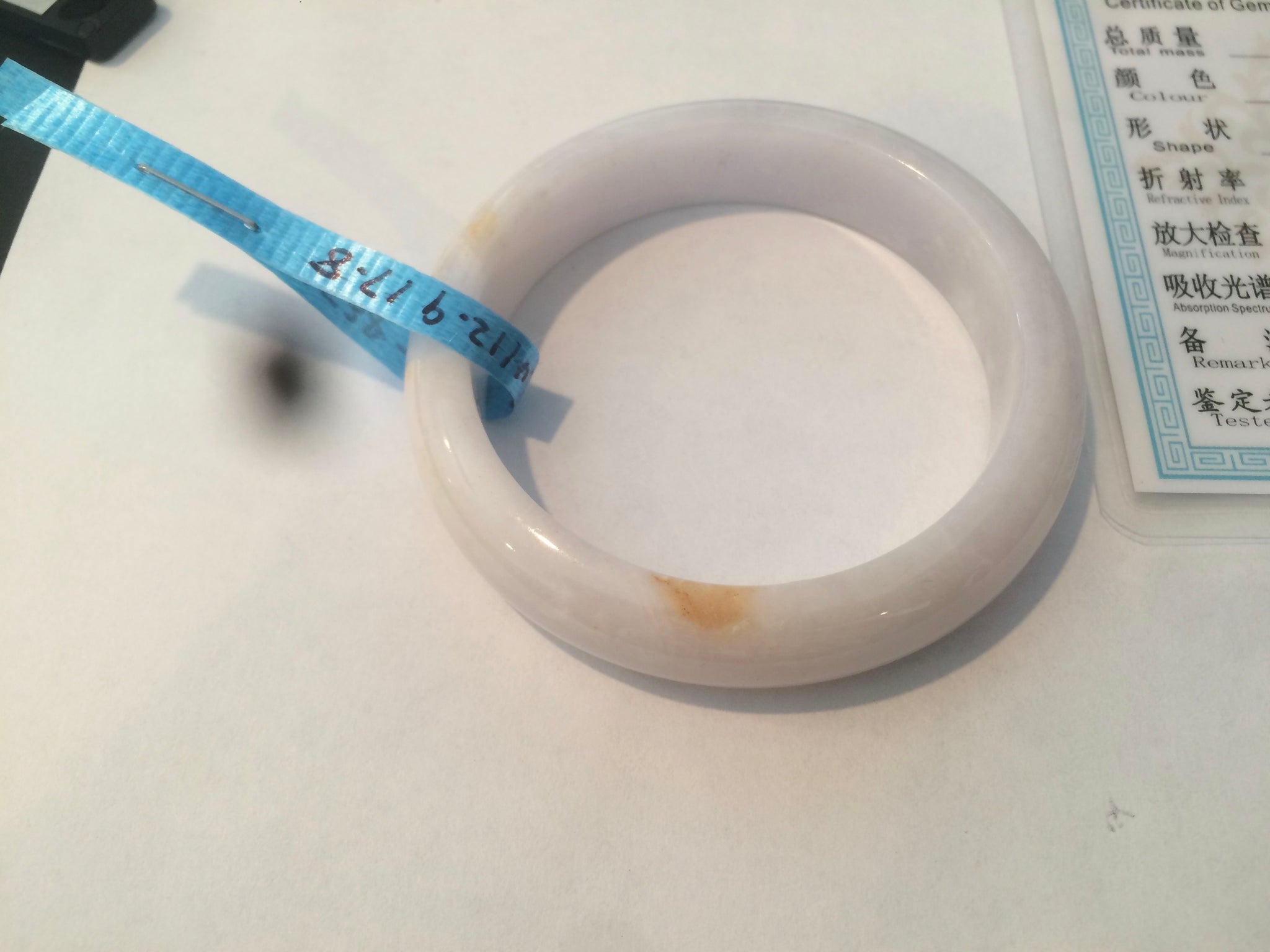 No crack. Some hairlines(photos may not show all). One is long, almost alongside half of the bangle. Cotton spots and cotton lines. Rough surfaces and mine pits. The purple is super light. Way lighter than photos.