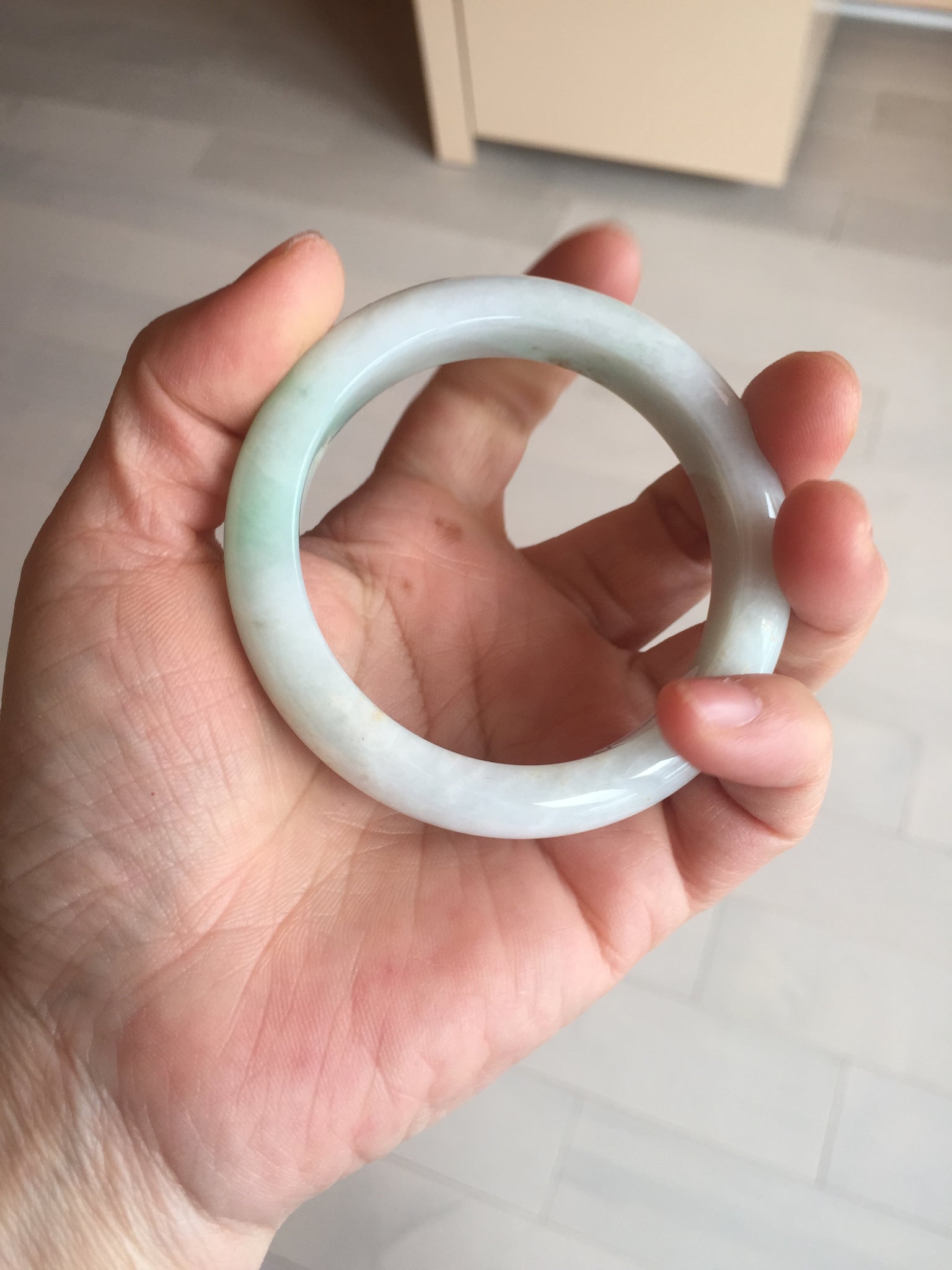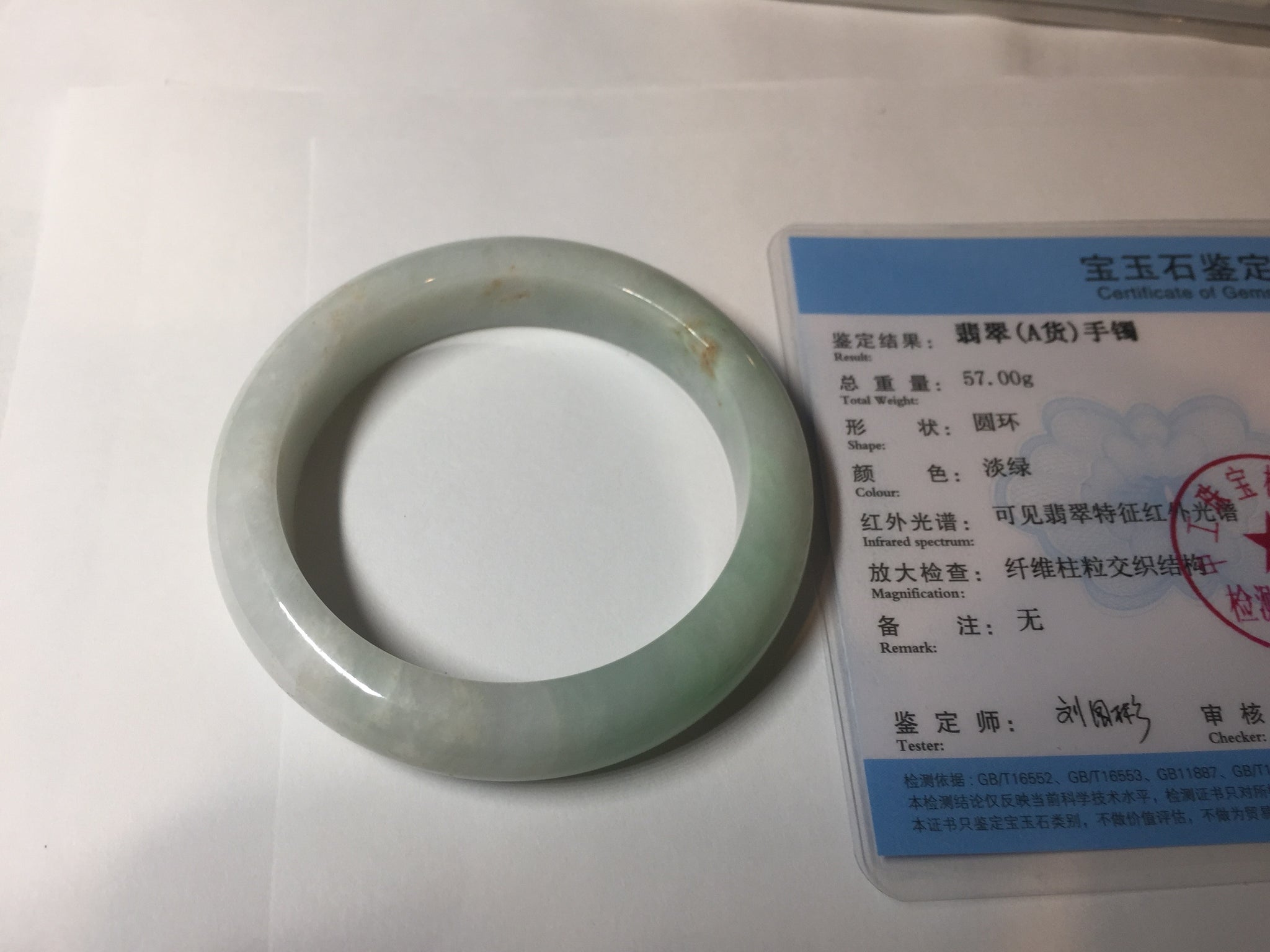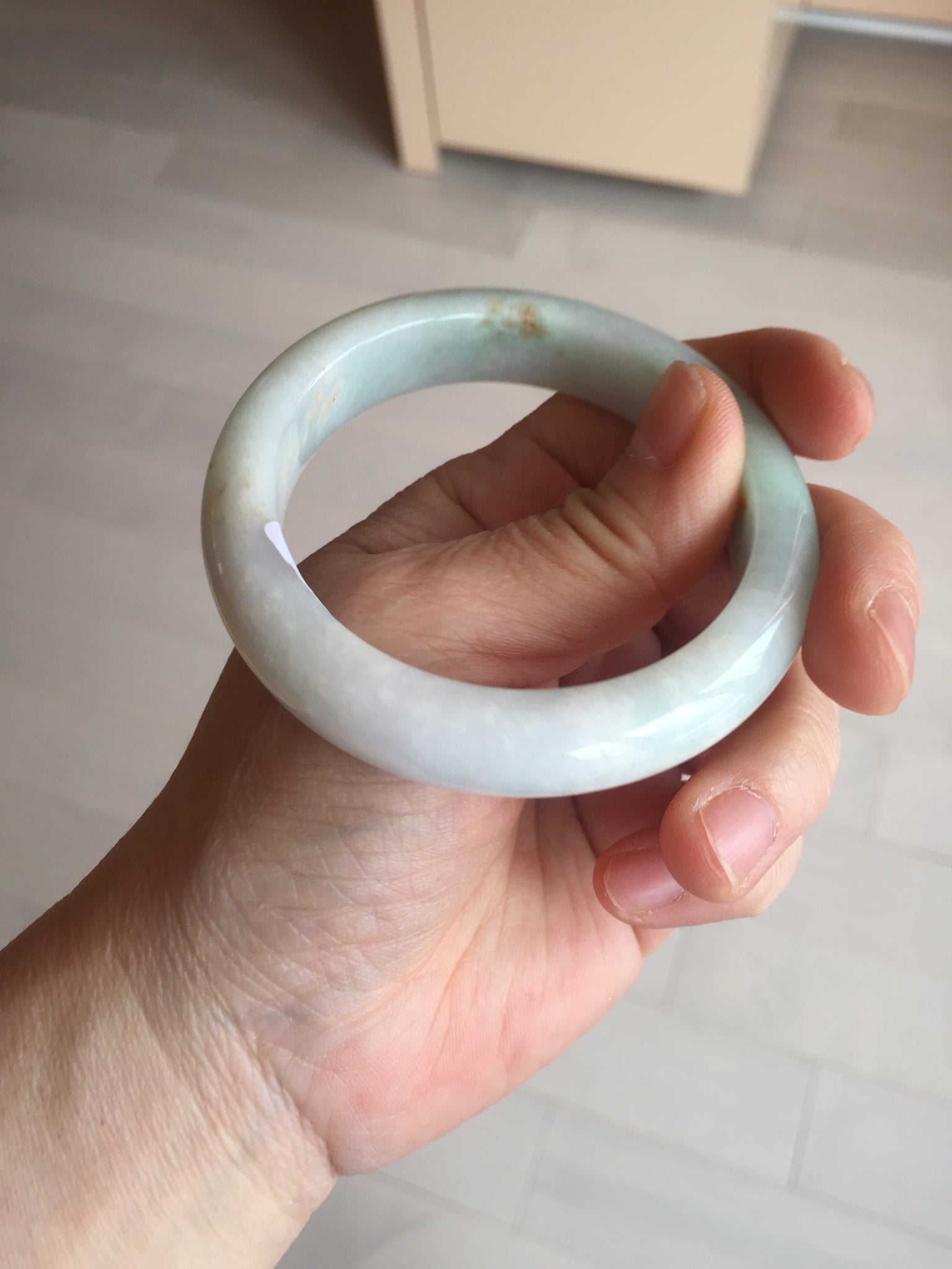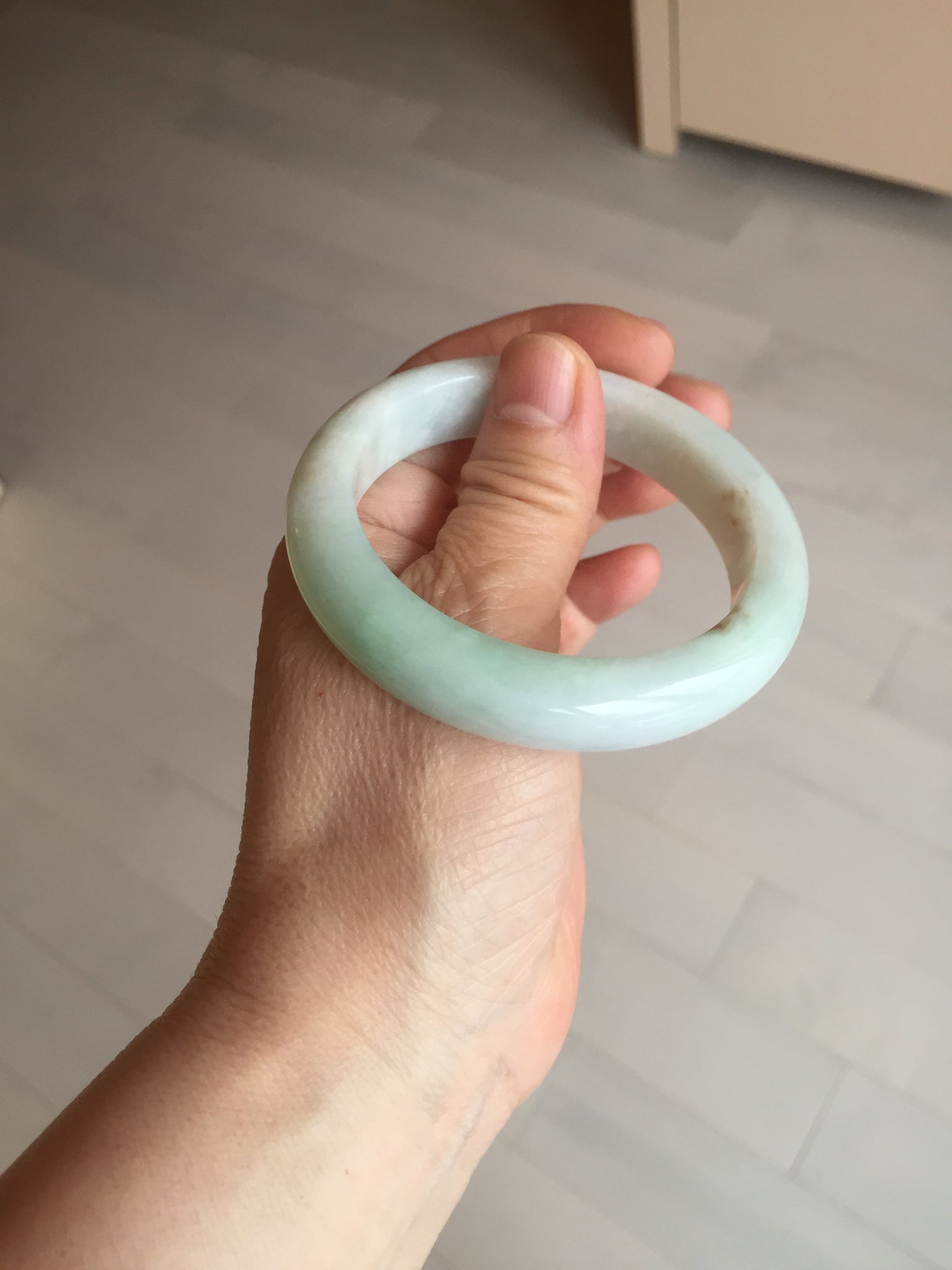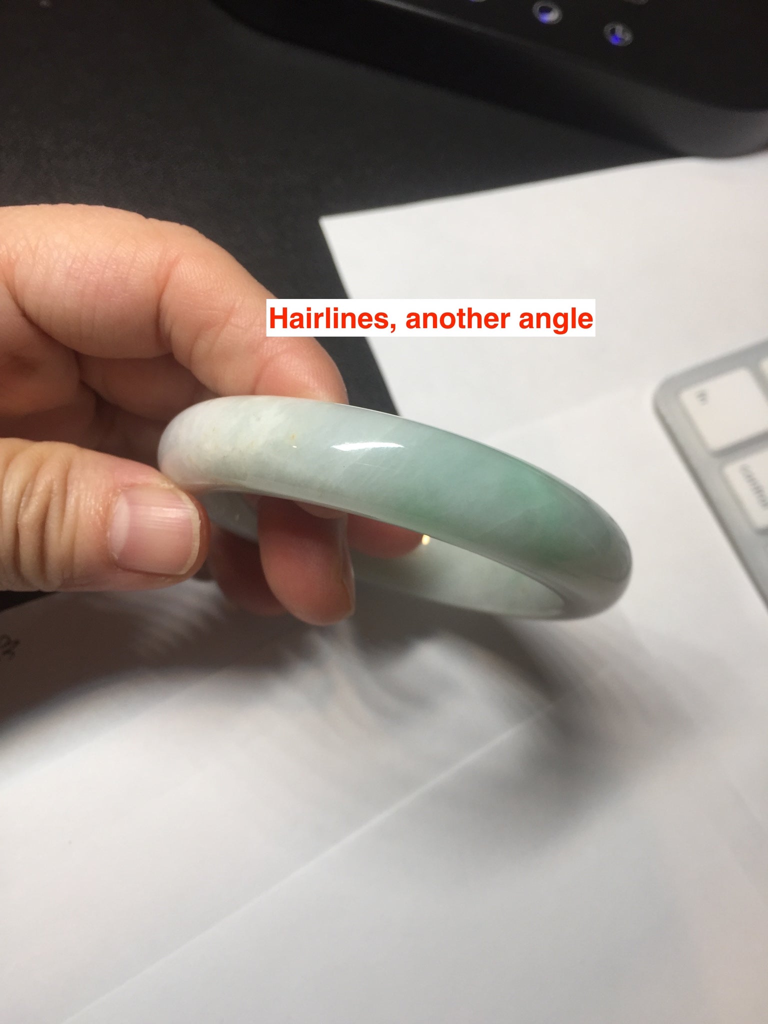 One crack. Some rough surface areas or spots with a tiny trace of wax. Some hairlines, one of them is around the bangle. The hairlines won't influence the firmness of the bangle. Some cotton lines and spots. Brown spots.
