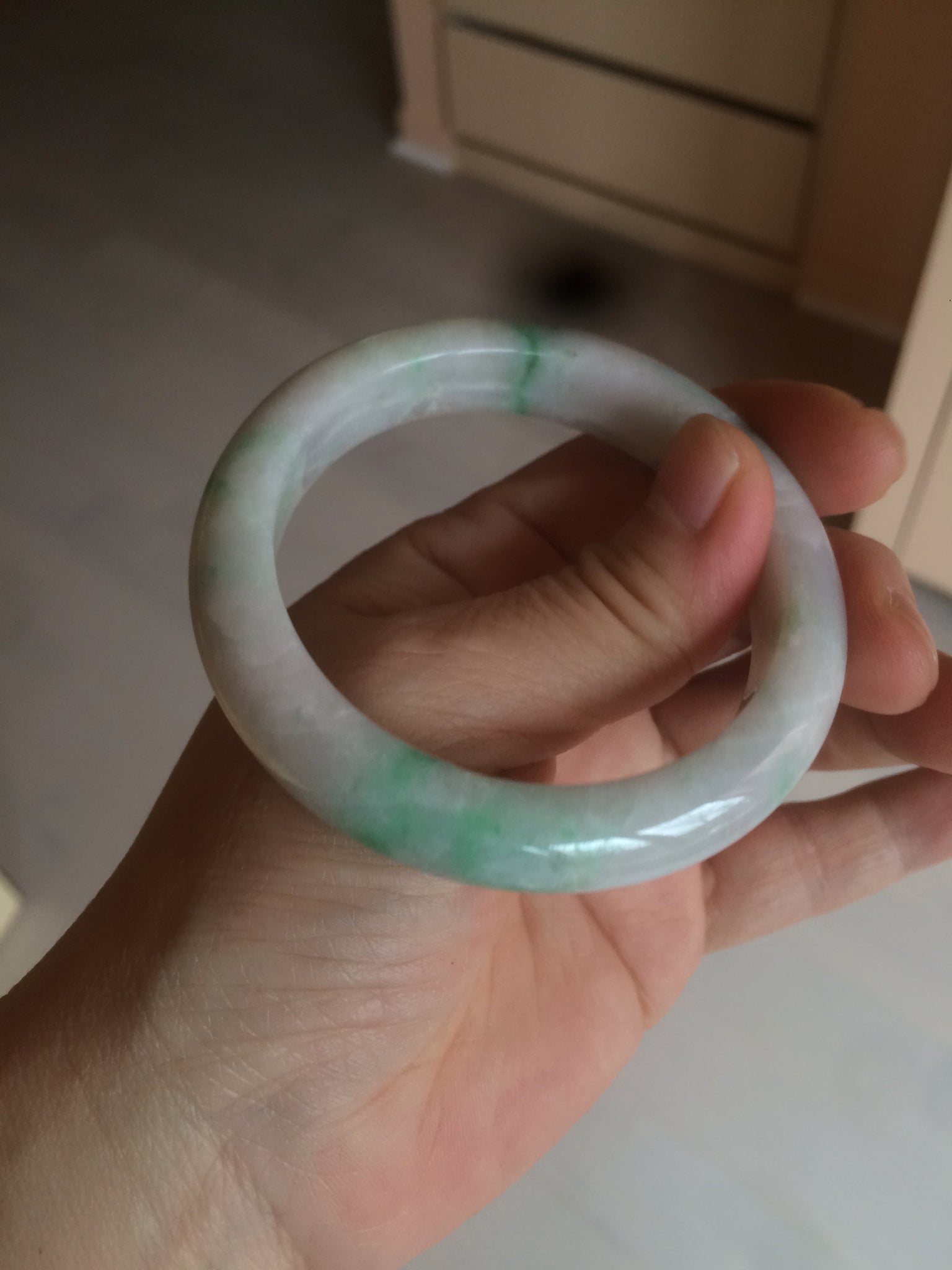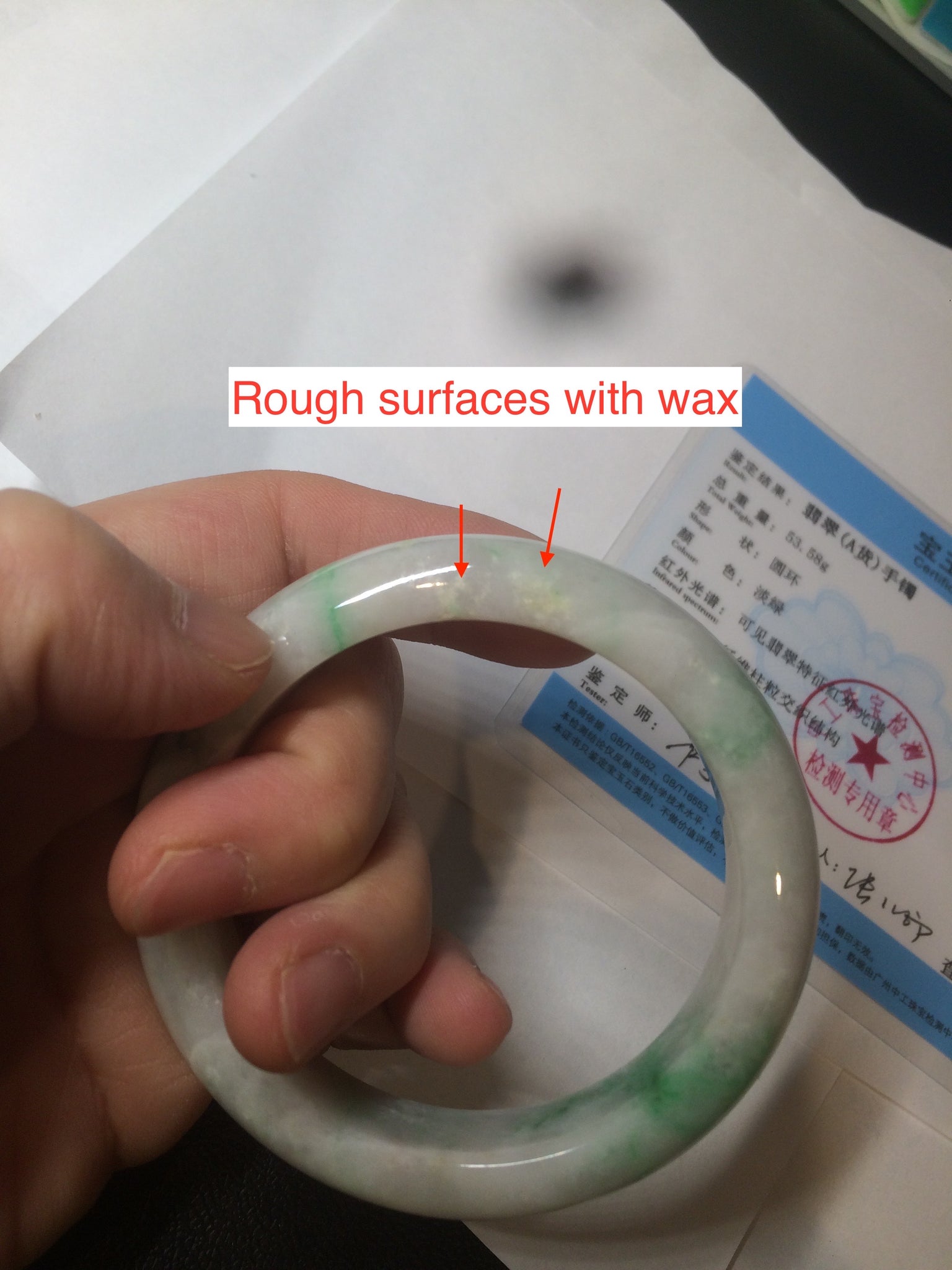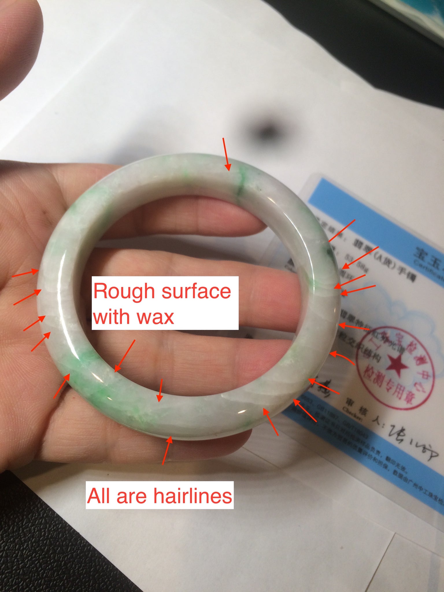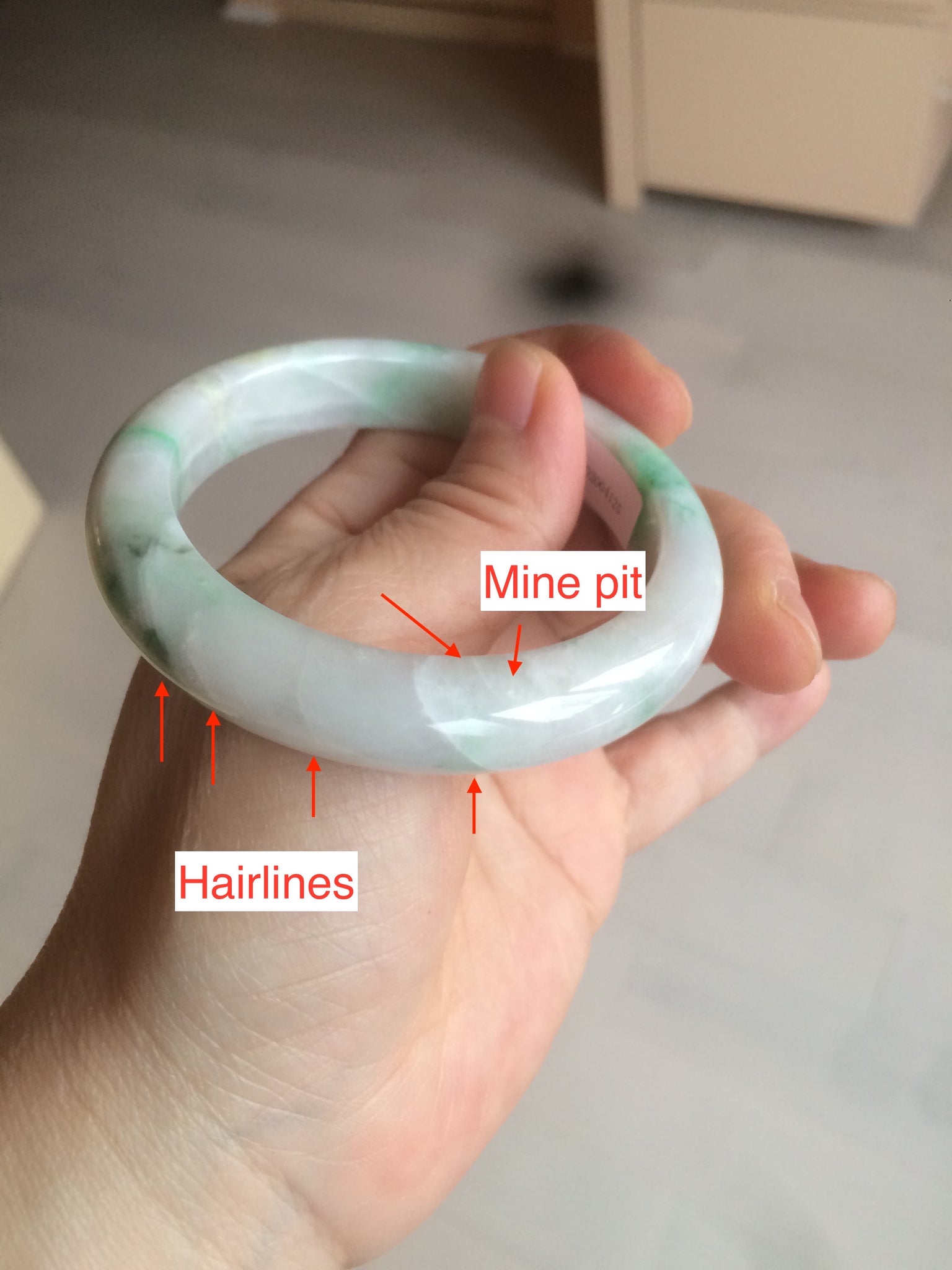 No crack. Some small mint pits. Quite a lot of hairlines. The bangle is firm and makes a high-pitched sound when clicked. Some small rough surface areas with wax.