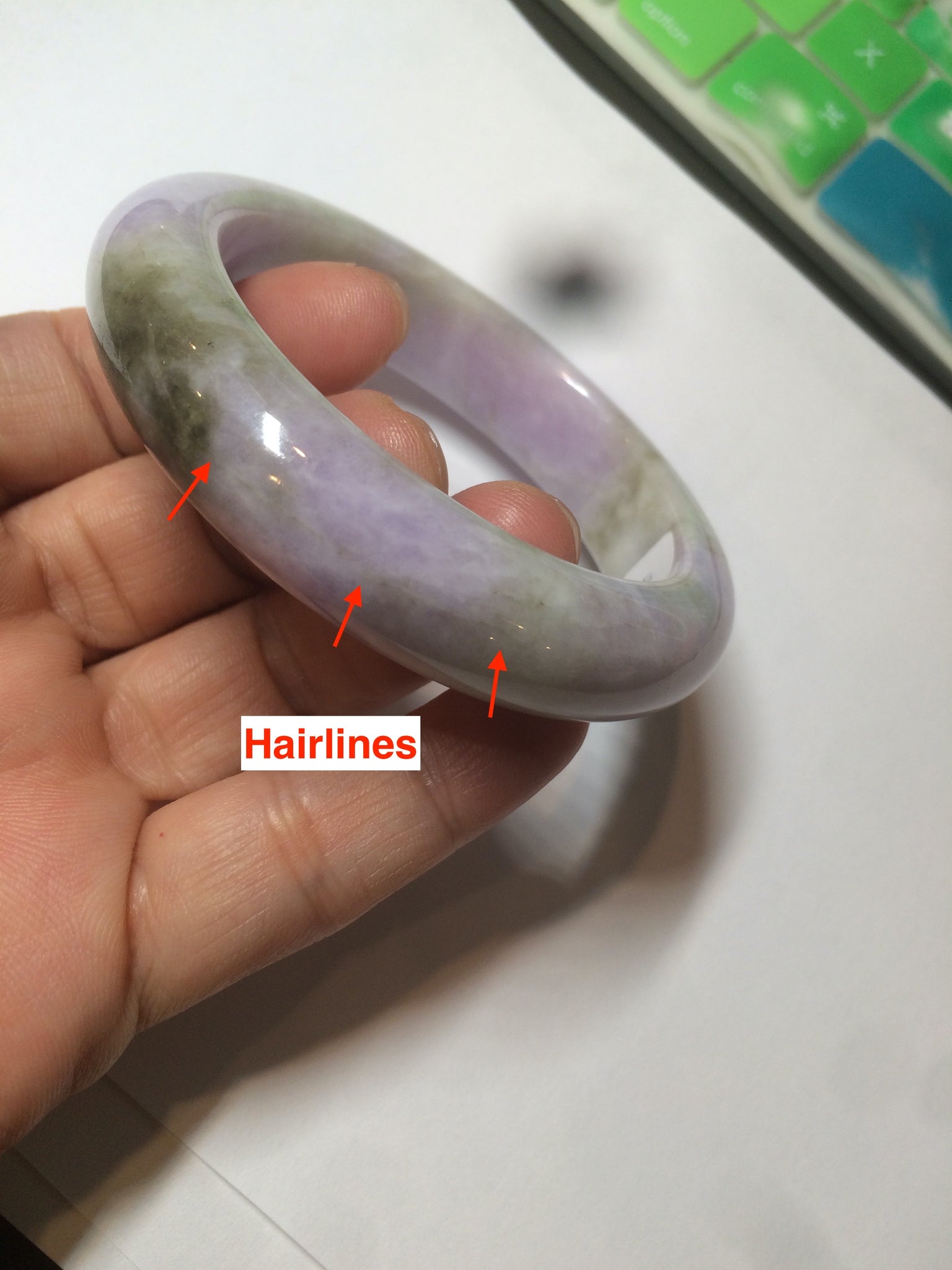 No crack. Some hairlines. Some cotton lines and spots. Some brown rough surfaces. Not transparent. The purple is lighter than in the photos.