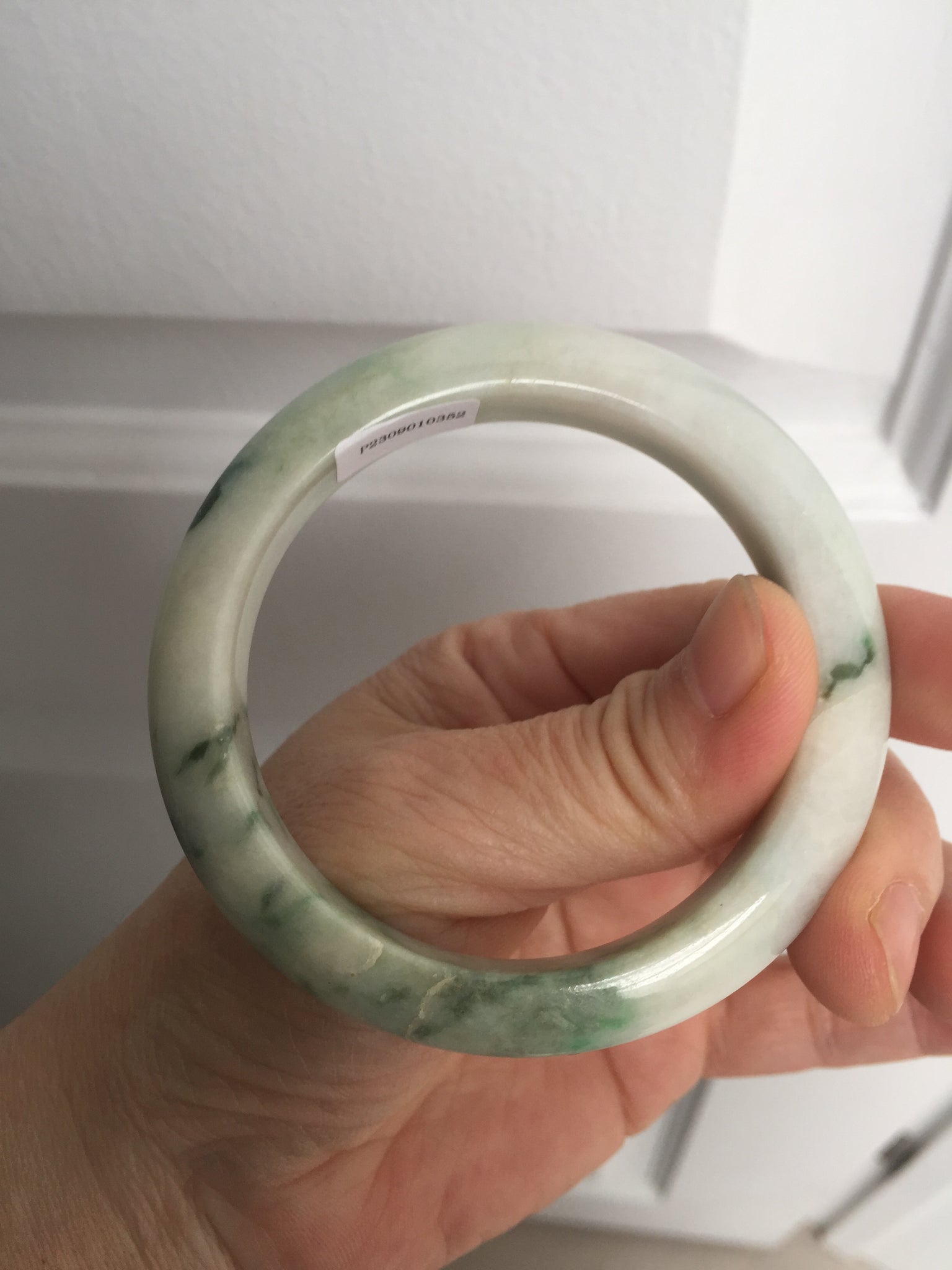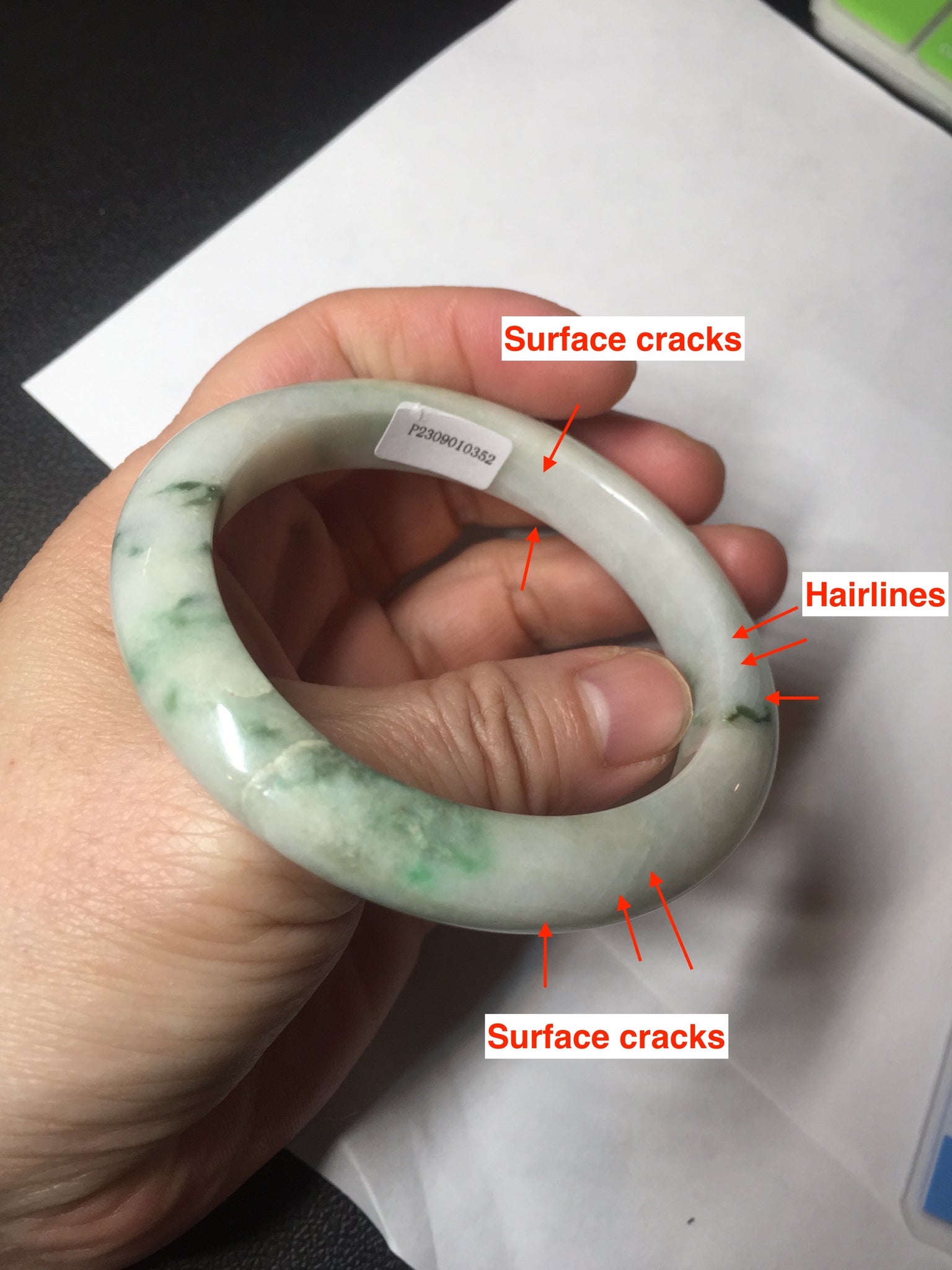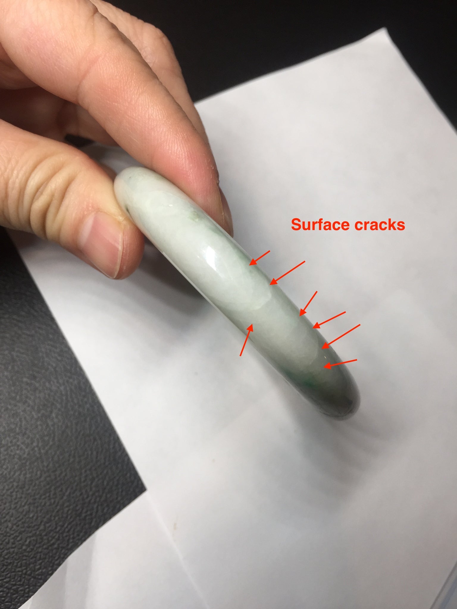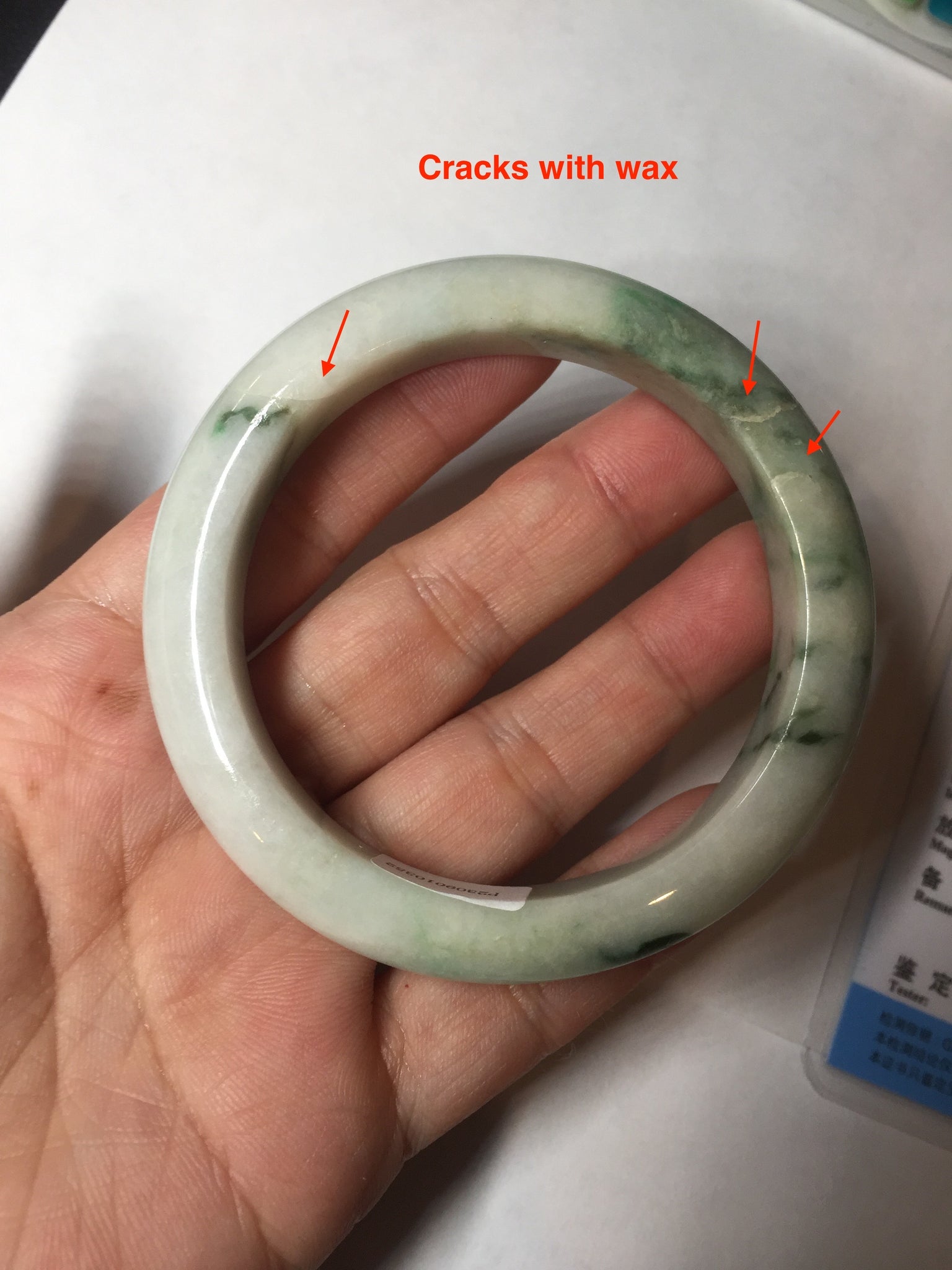 Some cracks with a medium amount of wax. One crack is deep. The bangle is solid. Some hairlines, cotton areas, lines, and spots. It is not transparent.