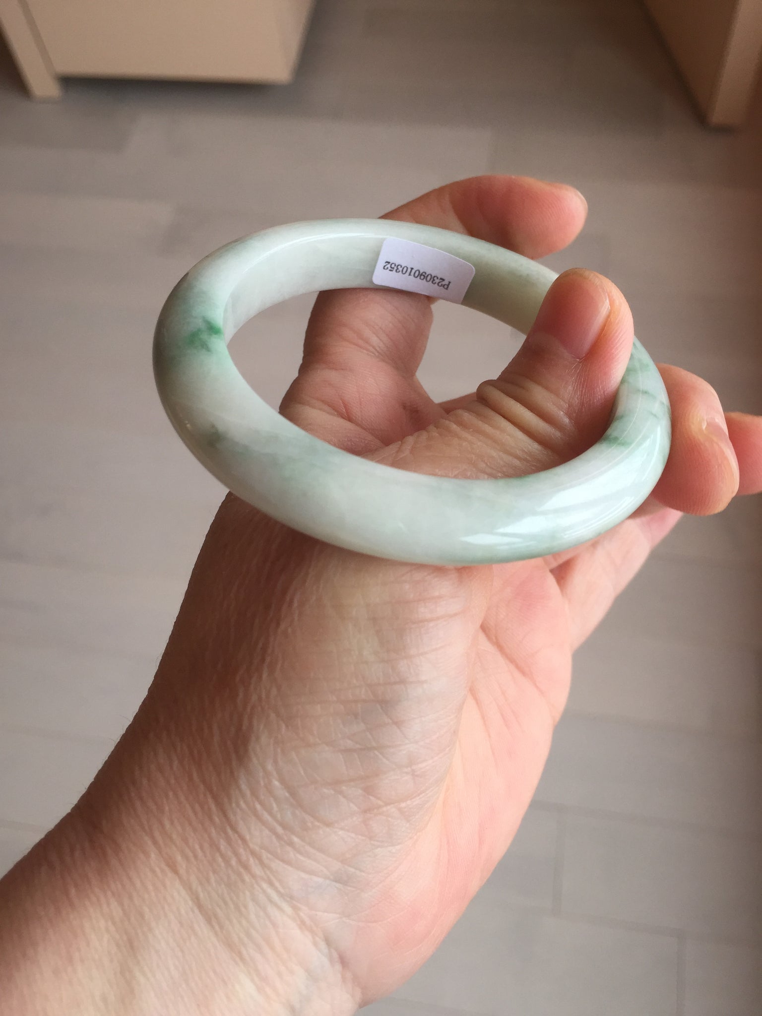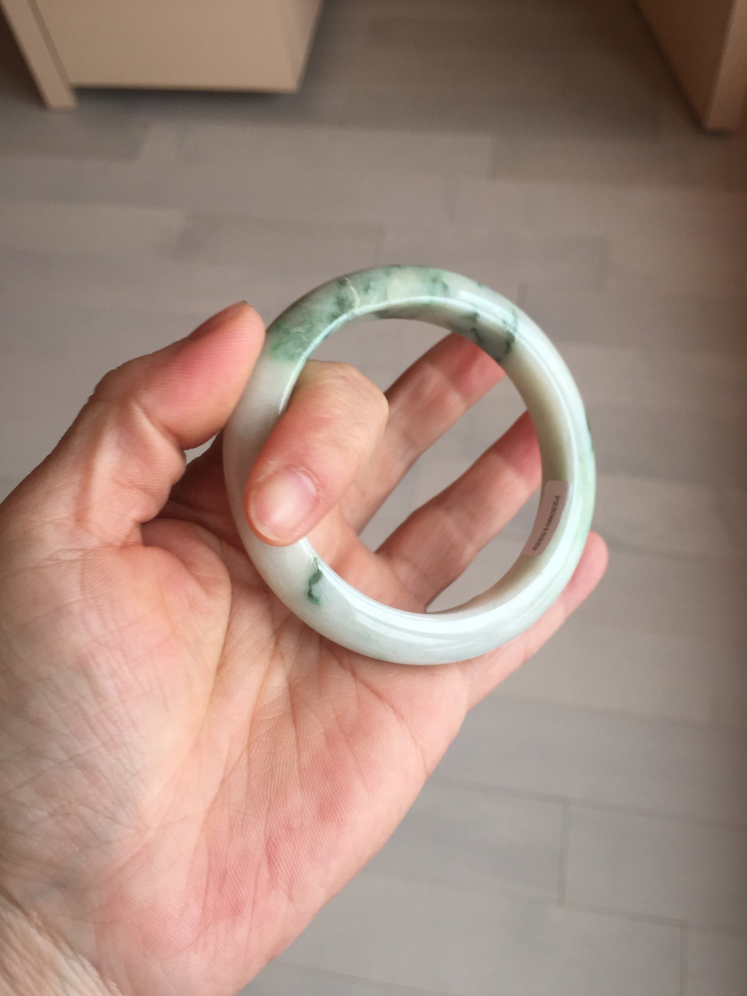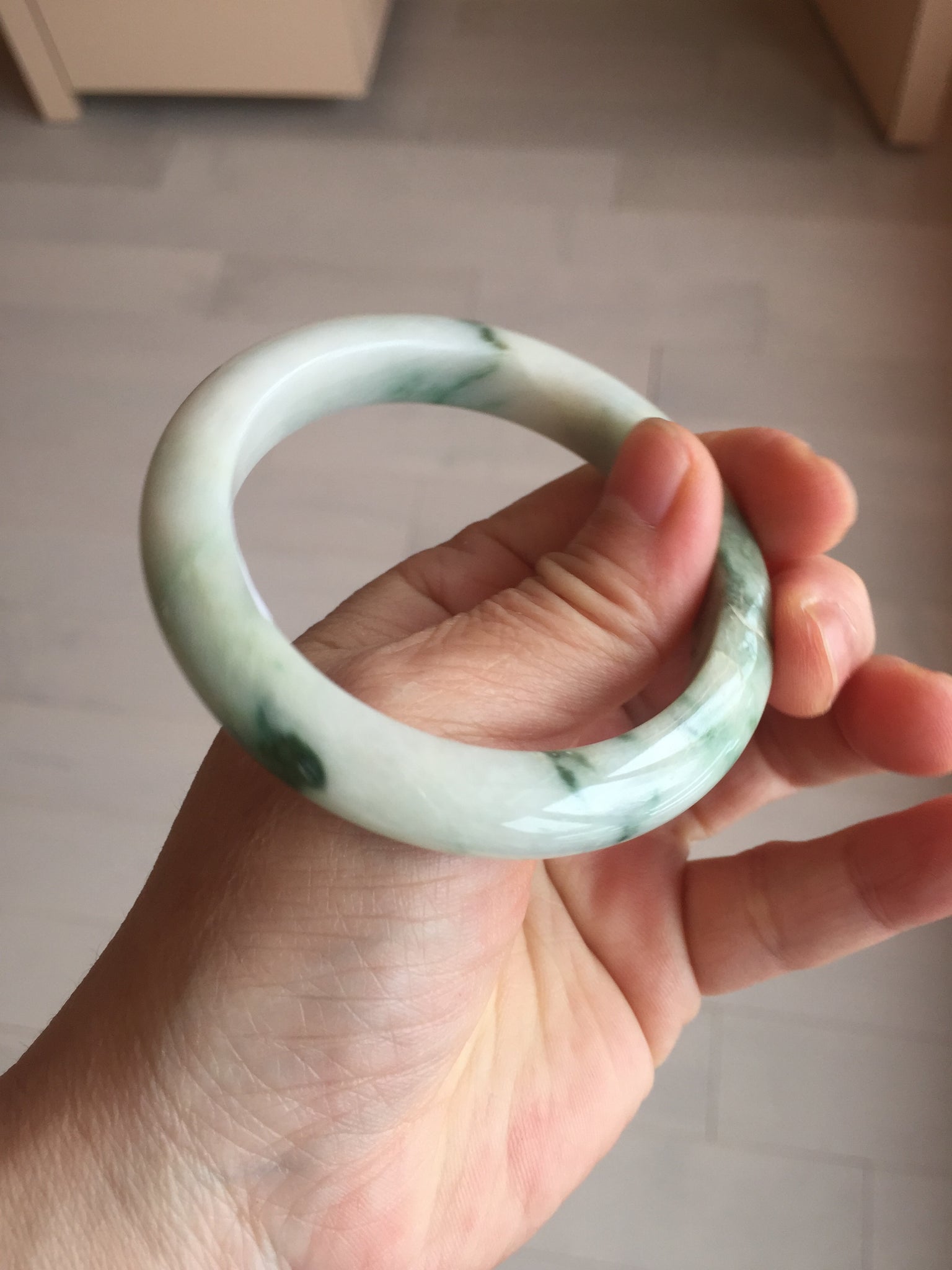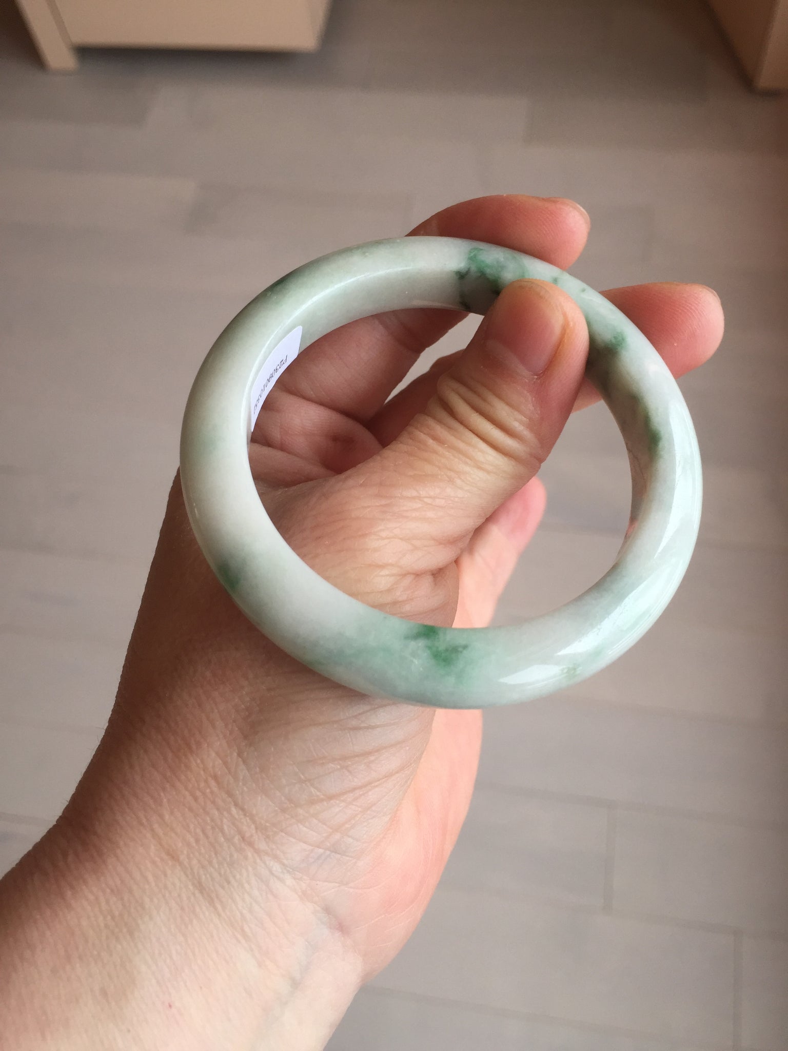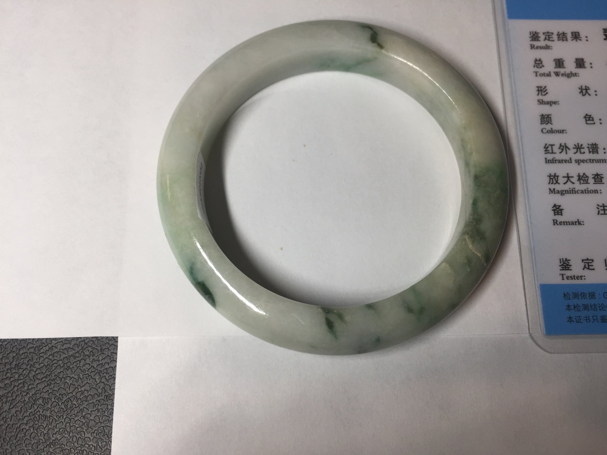 Some cracks with a medium amount of wax. One crack is deep. The bangle is solid. Some hairlines, cotton areas, lines, and spots. It is not transparent.